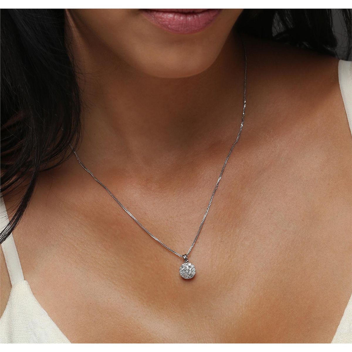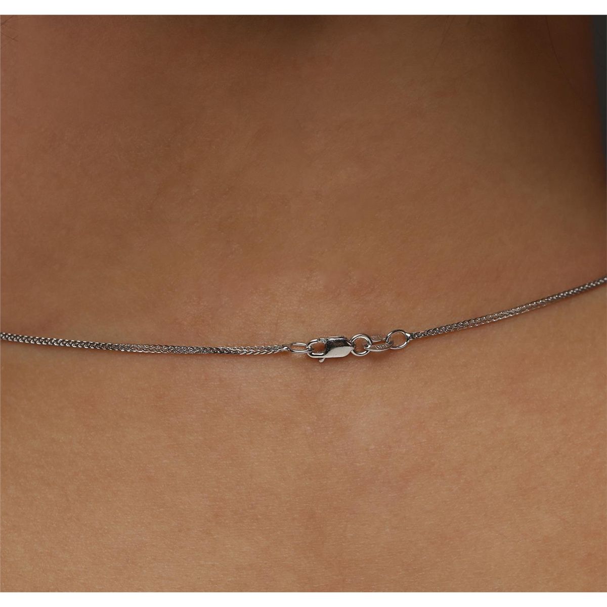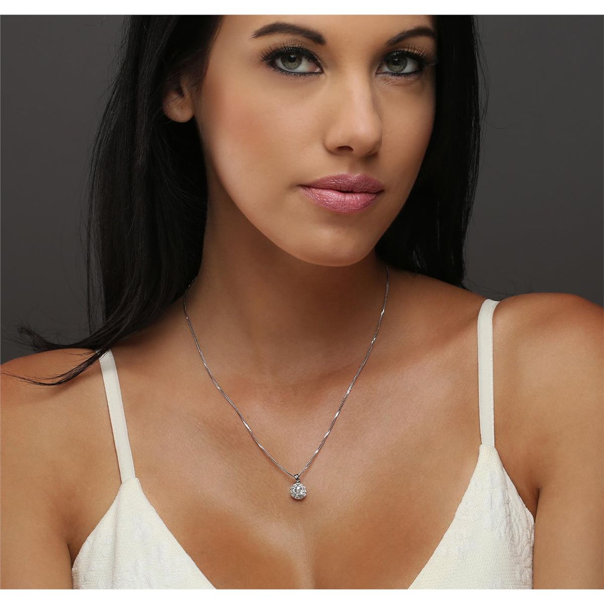 One electronically tested 14KT white gold ladies combination cast & assembled diamond pendant & chain 18.0" long, medium fancy cable with a lobster claw clasp with a bright polish finish. Identified with markings of "14K". Condition is new. Containing: One prong set round brilliant cut diamond, measuring 5.72 - 5.70 x 3.43mm (depth est.) approximate weight of 0.68ct. Clarity: I-3. Color: G, Cut is Good. Twelve prong set round brilliant cut diamonds, measuring 1.80 - 1.80 x 1.08mm (depth est.) approximate total weight of 12 Stones = 0.26ct. Clarity: SI-2 to I-2. Color: H - J, Cut is Good. All diamonds are graded in the mounting, unless otherwise stated. Total Weight of Diamonds 0.94ct. Total Weight of Pendant & Chain 2.60 grams. GGL Appraised at $3,340.00.