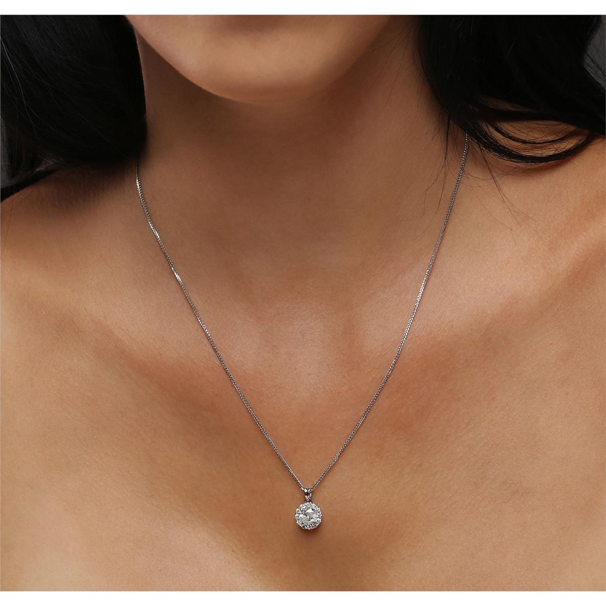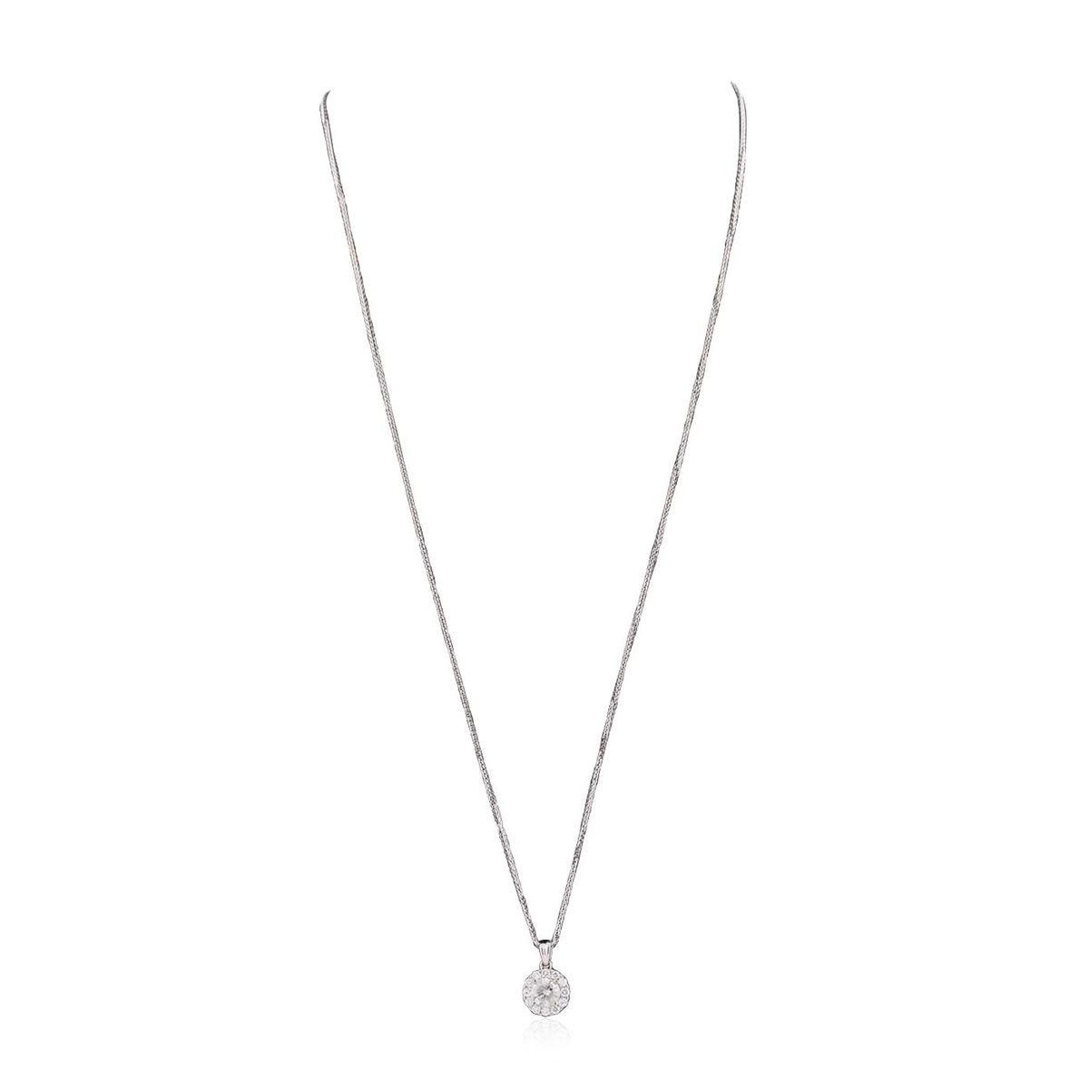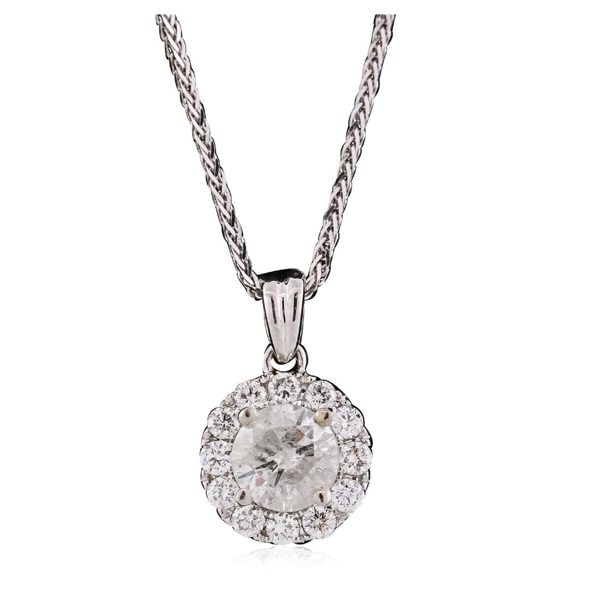 One electronically tested 14KT white gold ladies combination cast & assembled diamond pendant & chain 18.0" long, medium fancy cable with a lobster claw clasp with a bright polish finish. Identified with markings of "14K". Condition is new. Containing: One prong set round brilliant cut diamond, measuring 5.64 - 5.62 x 3.54mm (depth est.) approximate weight of 0.68ct. Clarity: I-3. Color: I, Cut is Good. Twelve prong set round brilliant cut diamonds, measuring 1.80 - 1.80 x 1.08mm (depth est.) approximate total weight of 12 Stones = 0.26ct. Clarity: SI-2 to I-2. Color: H - J, Cut is Good. All diamonds are graded in the mounting, unless otherwise stated. Total Weight of Diamonds 0.94ct. Total Weight of Pendant & Chain 2.70 grams. GGL Appraised at $3,165.00.