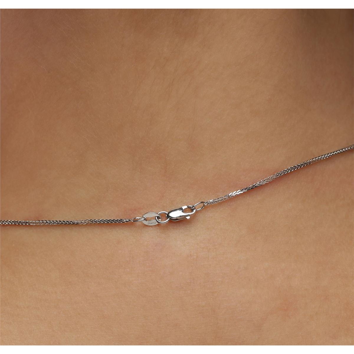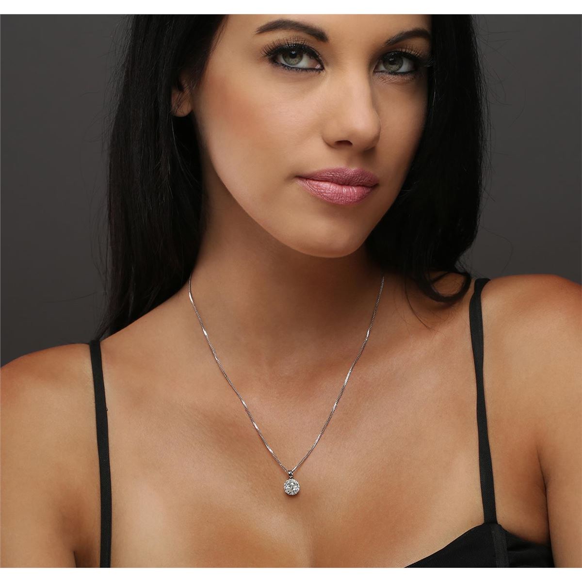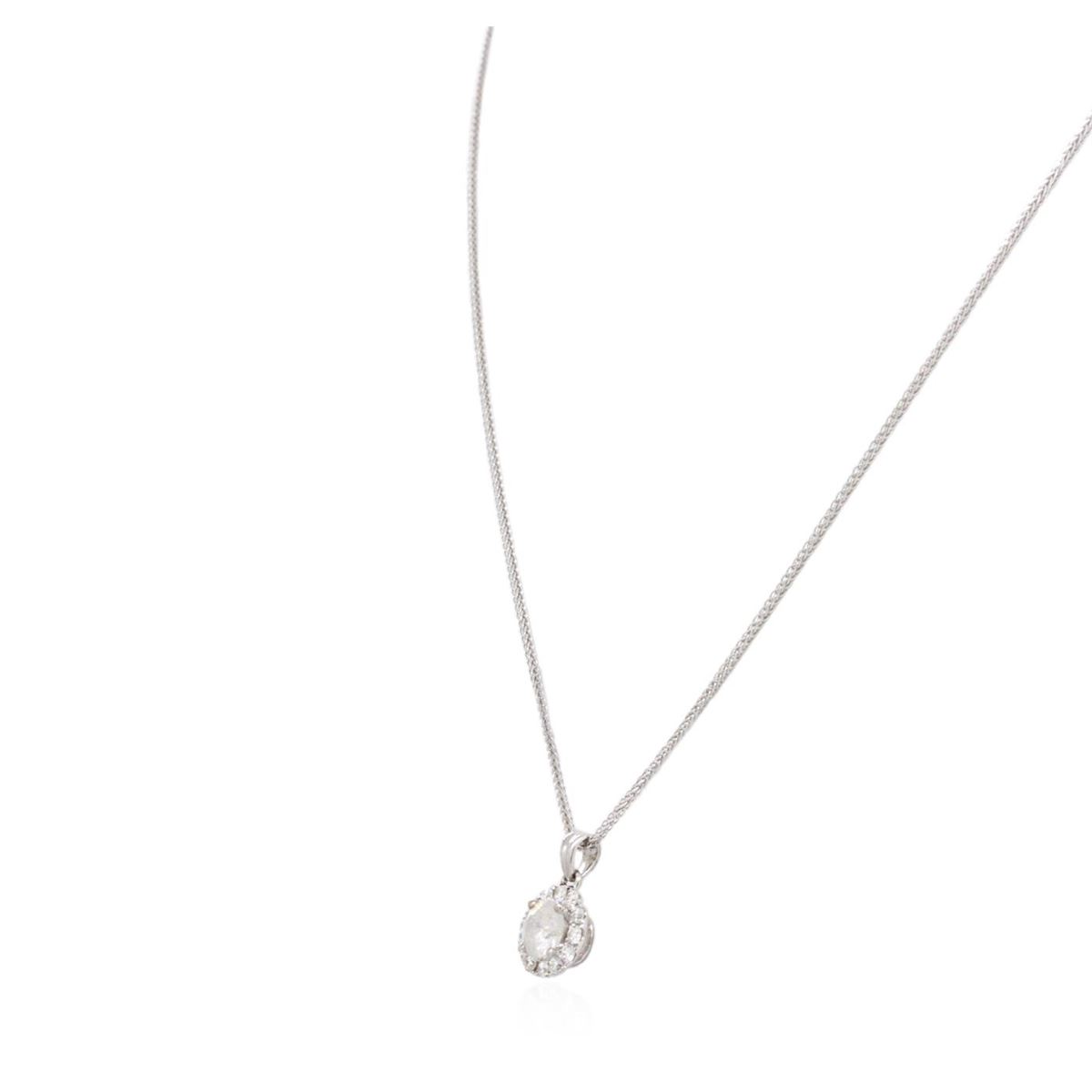 One electronically tested 14KT white gold ladies combination cast & assembled diamond pendant & chain 18.0" long, medium fancy cable with a lobster claw clasp with a bright polish finish. Identified with markings of "14K". Condition is new. Containing: One prong set round brilliant cut diamond, measuring 5.64 - 5.62 x 3.54mm (depth est.) approximate weight of 0.68ct. Clarity: I-3. Color: I, Cut is Good. Twelve prong set round brilliant cut diamonds, measuring 1.80 - 1.80 x 1.08mm (depth est.) approximate total weight of 12 Stones = 0.26ct. Clarity: SI-2 to I-2. Color: H - J, Cut is Good. All diamonds are graded in the mounting, unless otherwise stated. Total Weight of Diamonds 0.94ct. Total Weight of Pendant & Chain 2.70 grams. GGL Appraised at $3,165.00.