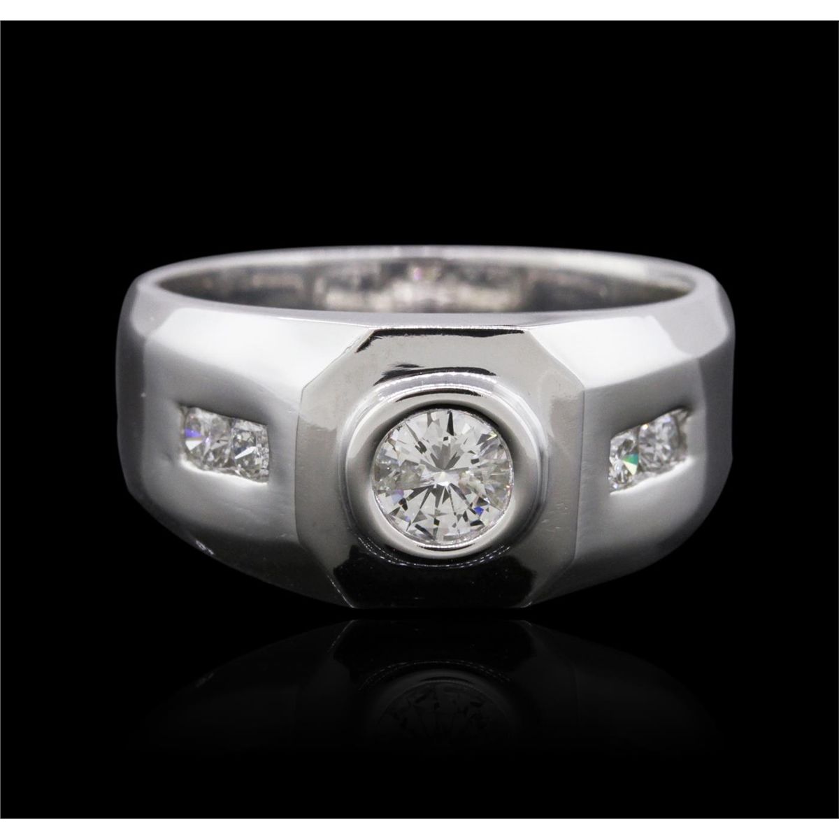 One electronically tested 14KT white gold mens combination cast & assembled diamond ring with a bright polish finish. Identified with markings of "K14". Condition is new. Containing: One bezel set round brilliant cut diamond, measuring 5.80 - 5.80 x 3.48mm (depth est.) approximate weight of 0.71ct. Clarity: SI-2. Color: J, Cut is Good. Four channel set round brilliant cut diamonds, measuring 2.50 - 2.50 x 1.50mm (depth est.) approximate total weight of 4 Stones = 0.23ct. Clarity: SI-1 to SI-2. Color: J, Cut is Good. All diamonds are graded in the mounting, unless otherwise stated. Total Weight of Diamonds 0.94ct. Total Weight of Ring 11.90 grams. GGL Appraised at $8,165.00.