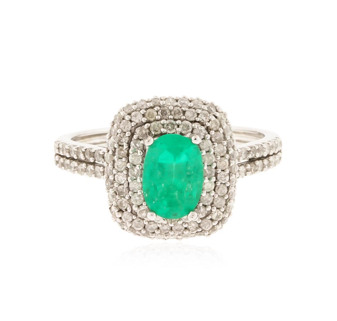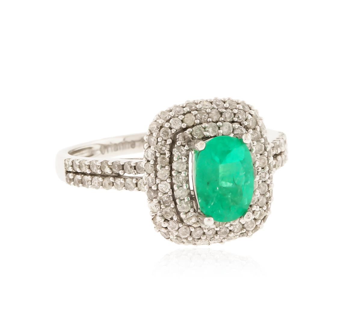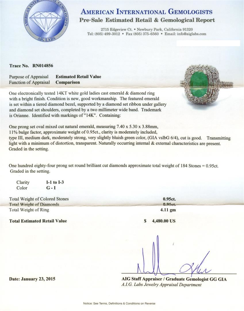 One electronically tested 14KT white gold ladies cast emerald & diamond ring with a bright finish. The featured emerald is set within a tiered diamond bezel, supported by a diamond set ribbon under gallery and diamond set shoulders, completed by a two millimeter wide band. Trademark is Orianne. Identified with markings of "14K". Condition is new, good workmanship. Containing: One prong set oval mixed cut natural emerald, measuring 7.40 x 5.30 x 3.88mm, 11%. bulge factor, approximate weight of 0.95ct., clarity is moderately included, type III, medium dark, moderately strong, very slightly bluish green color, (GIA vslbG 6/4), cut is good. Transmitting light with a minimum of distortion, transparent. Naturally occurring internal & external characteristics are present. Graded in the setting. One Hundred Eighty-Four prong set round brilliant cut diamonds approximate total weight of 184 Stones = 0.95ct. Graded in the setting. Clarity: I-1 to I-3. Color: G - I. Total Weight of Colored Stones 0.95ct. Total Weight of Diamonds 0.95ct. Total Weight of Ring 4.11 grams. AIG Appraised at $4,480.00.