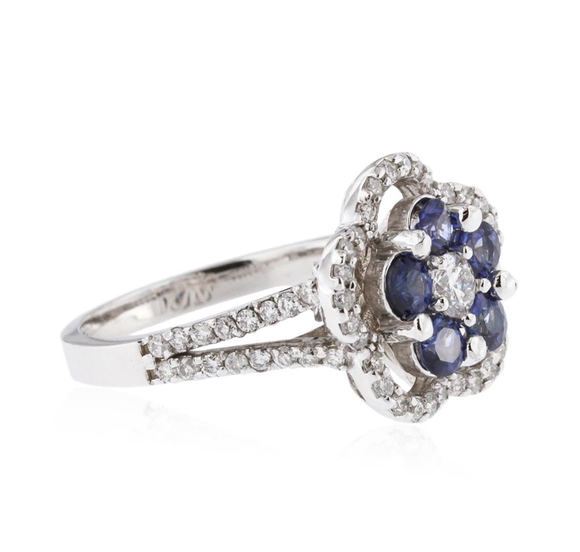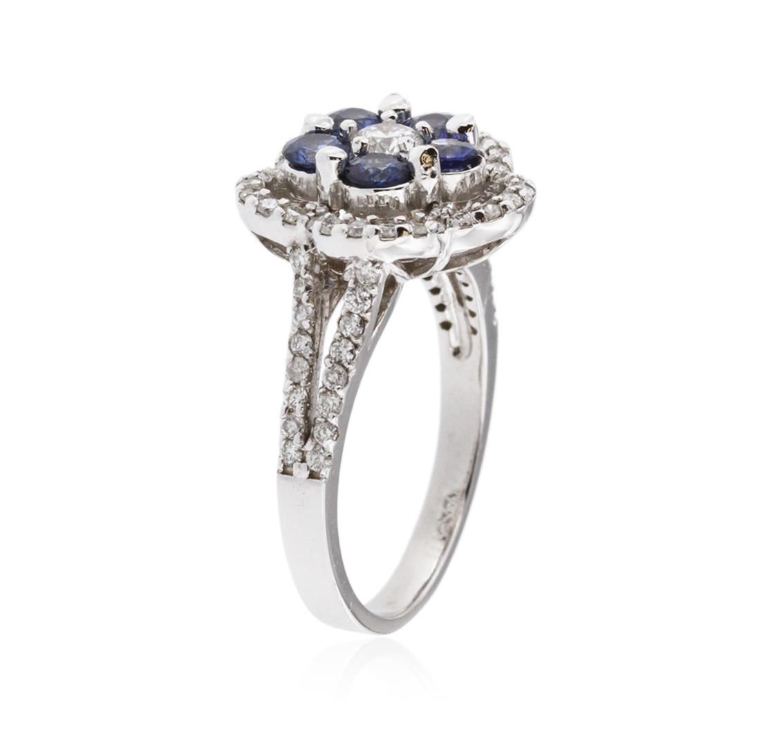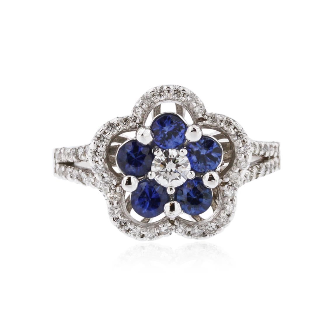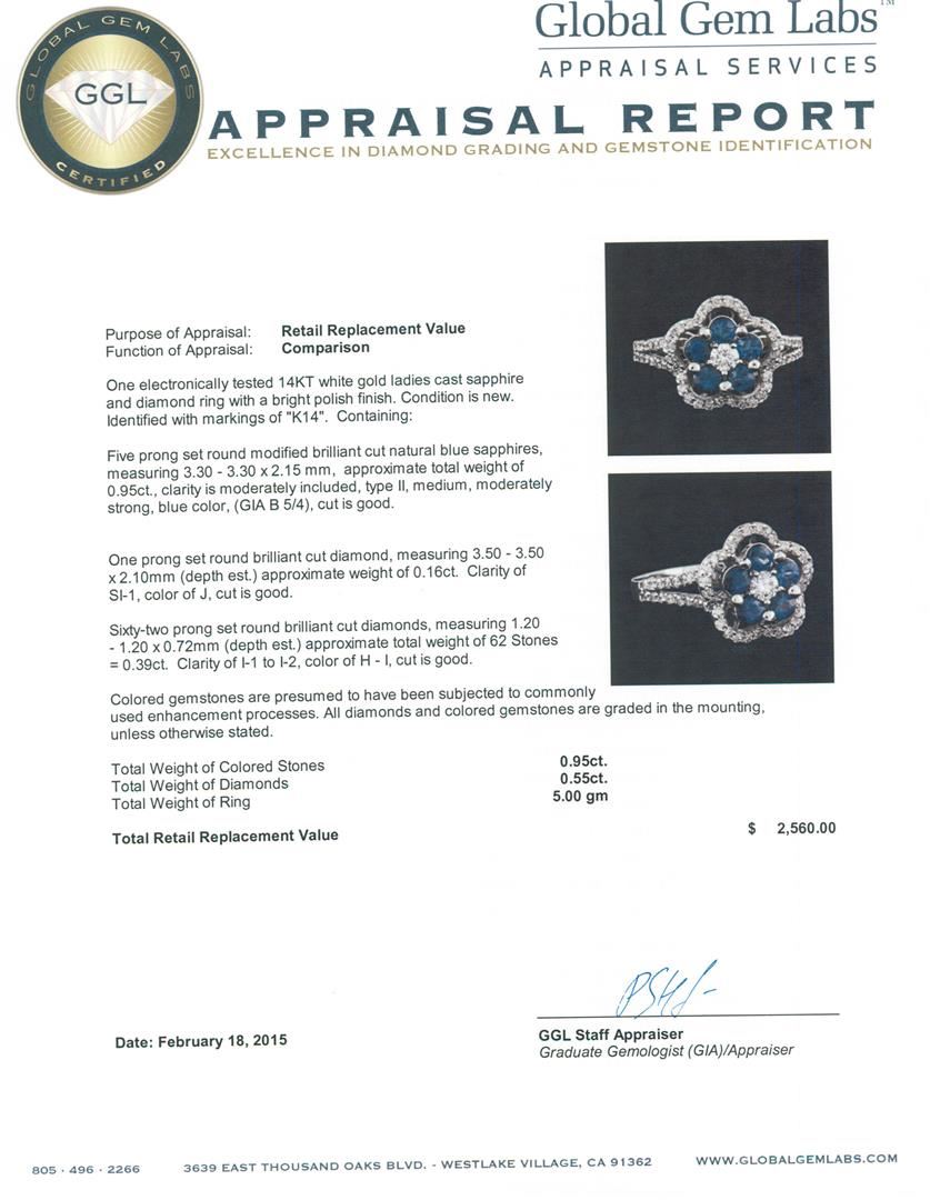 One electronically tested 14KT white gold ladies cast sapphire and diamond ring with a bright polish finish. Identified with markings of "K14". Condition is new. Containing: Five prong set round modified brilliant cut natural blue sapphires, measuring 3.30 - 3.30 x 2.15 mm, approximate total weight of 0.95ct., clarity is moderately included, type II, medium, moderately strong, blue color, (GIA B 5/4), cut is good. One prong set round brilliant cut diamond, measuring 3.50 - 3.50 x 2.10mm (depth est.) approximate weight of 0.16ct. Clarity: SI-1. Color: J, Cut is Good. Sixty-Two prong set round brilliant cut diamonds, measuring 1.20 - 1.20 x 0.72mm (depth est.) approximate total weight of 62 Stones = 0.39ct. Clarity: I-1 to I-2. Color: H - I, Cut is Good. Colored gemstones are presumed to have been subjected to commonly used enhancement processes. All diamonds and colored gemstones are graded in the mounting, unless otherwise stated. Total Weight of Colored Stones 0.95ct. Total Weight of Diamonds 0.55ct. Total Weight of Ring 5.00 grams. GGL Appraised at $2,560.00.