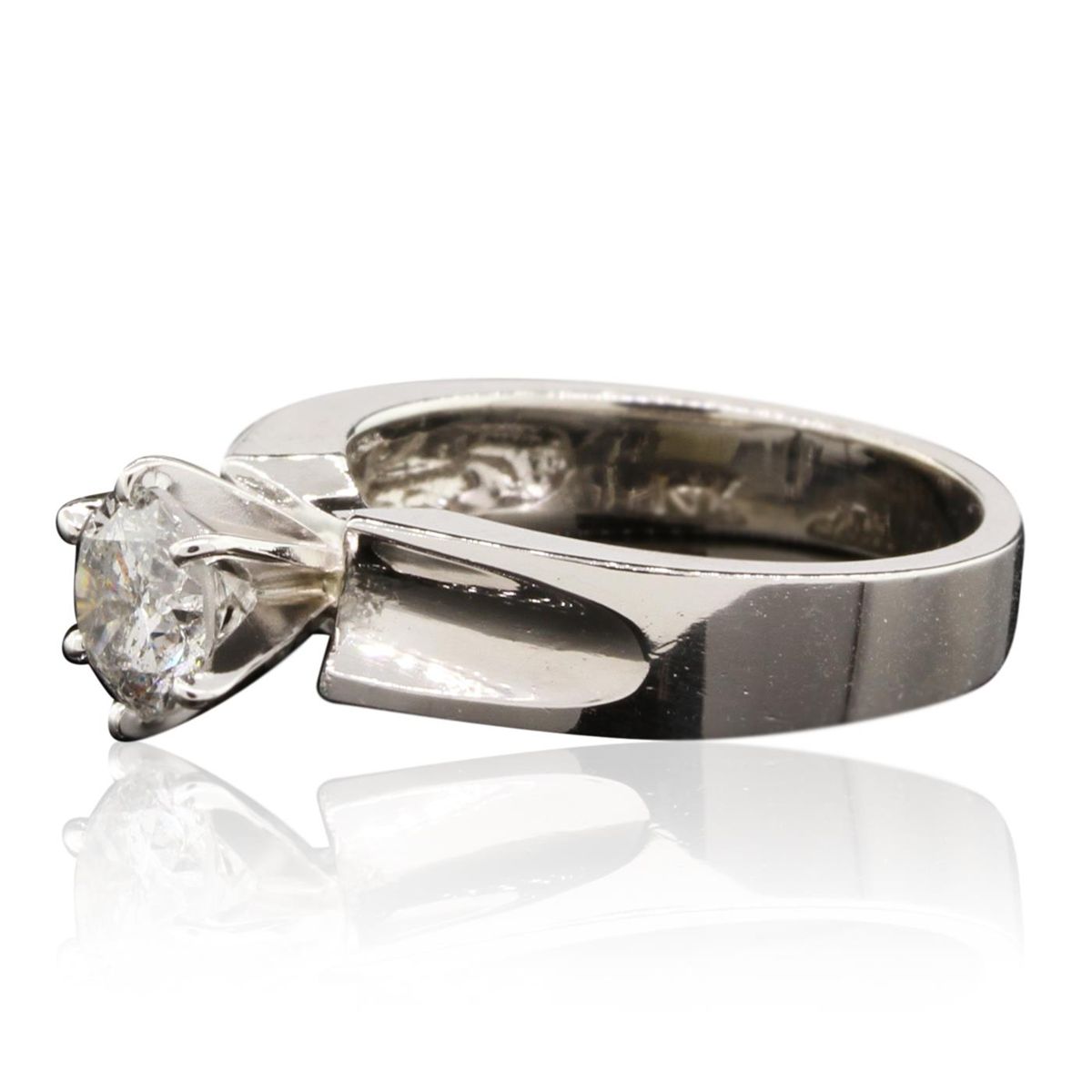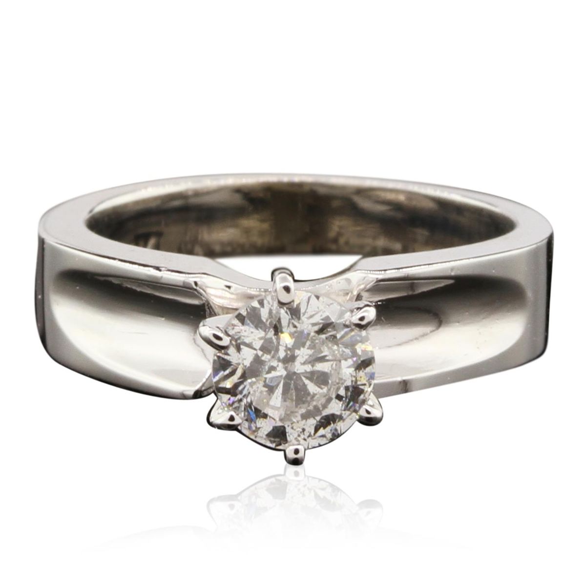 One electronically tested 14KT white gold ladies cast & assembled diamond solitaire ring with a bright polish finish. The ring is completed by a three millimeter wide band. Identified with markings of "14K". Condition is new, good workmanship. Containing: One prong set round brilliant cut diamond, measuring 6.05 - 6.00 x 4.10mm (depth est.), 5.00%. GTCF approximate weight of 0.95ct. Graded in the setting. Clarity: I-1 . Color: HDepth 68.0%. Table 66.3%... Total Weight of Diamonds 0.95ct. AIG Appraised at $9,945.00.