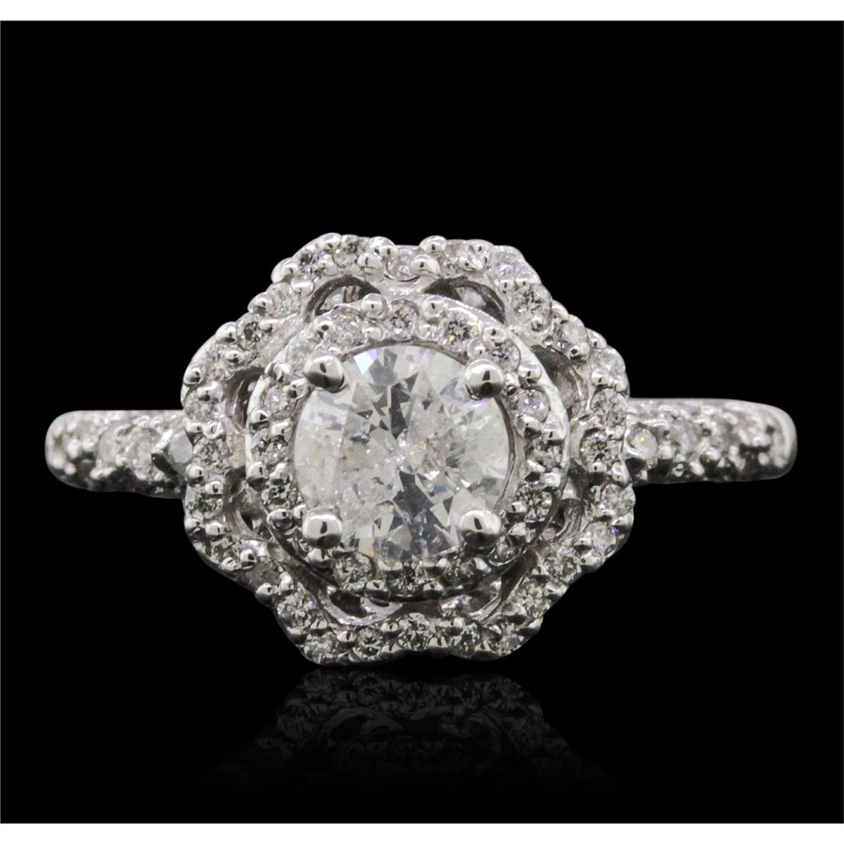 One electronically tested 14KT white gold ladies combination cast & assembled engagement ring with a flat shank with a bright polish finish. Identified with markings of "14K". Condition is new. Containing: One prong set round brilliant cut diamond, measuring 5.50 - 5.50 x 3.30mm (depth est.) approximate weight of 0.61ct. Clarity: I-2. Color: J, Cut is Good. Seventy prong set round brilliant cut diamonds, measuring 1.10 - 1.10 x 0.66mm (depth est.) approximate total weight of 70 Stones = 0.34ct. Clarity: I-1 to I-2. Color: I - J, Cut is Good. All diamonds are graded in the mounting, unless otherwise stated. Total Weight of Diamonds 0.95ct. Total Weight of Ring 3.50 grams. GGL Appraised at $4,755.00. GGL Appraised at $12,315.00.