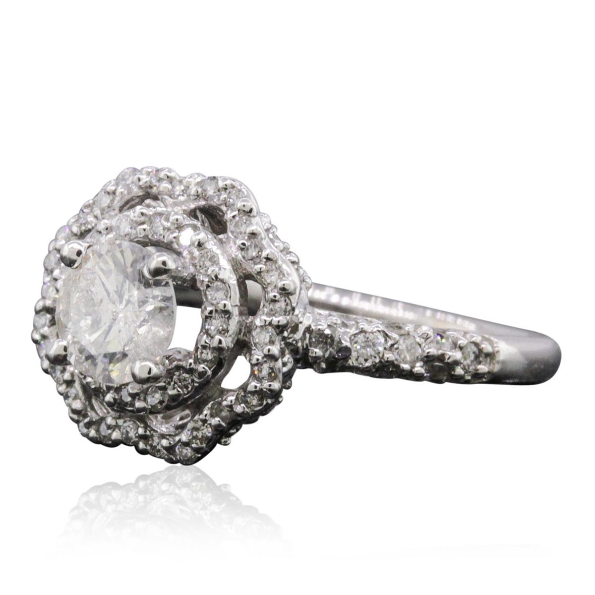 One electronically tested 14KT white gold ladies combination cast & assembled engagement ring with a flat shank with a bright polish finish. Identified with markings of "14K". Condition is new. Containing: One prong set round brilliant cut diamond, measuring 5.50 - 5.50 x 3.30mm (depth est.) approximate weight of 0.61ct. Clarity: I-2. Color: J, Cut is Good. Seventy prong set round brilliant cut diamonds, measuring 1.10 - 1.10 x 0.66mm (depth est.) approximate total weight of 70 Stones = 0.34ct. Clarity: I-1 to I-2. Color: I - J, Cut is Good. All diamonds are graded in the mounting, unless otherwise stated. Total Weight of Diamonds 0.95ct. Total Weight of Ring 3.50 grams. GGL Appraised at $4,755.00.