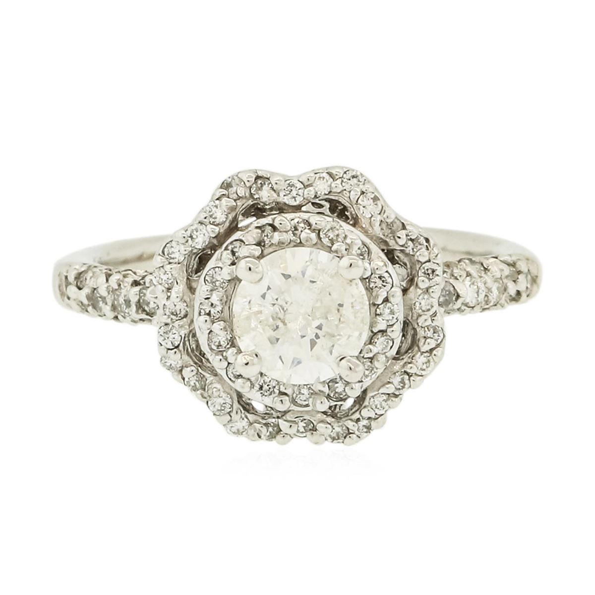 One electronically tested 14KT white gold ladies combination cast & assembled engagement ring with a flat shank with a bright polish finish. Identified with markings of "14K". Condition is new. Containing: One prong set round brilliant cut diamond, measuring 5.50 - 5.50 x 3.30mm (depth est.) approximate weight of 0.61ct. Clarity: I-2. Color: J, Cut is Good. Seventy prong set round brilliant cut diamonds, measuring 1.10 - 1.10 x 0.66mm (depth est.) approximate total weight of 70 Stones = 0.34ct. Clarity: I-1 to I-2. Color: I - J, Cut is Good. All diamonds are graded in the mounting, unless otherwise stated. Total Weight of Diamonds 0.95ct. Total Weight of Ring 3.50 grams. GGL Appraised at $4,755.00.