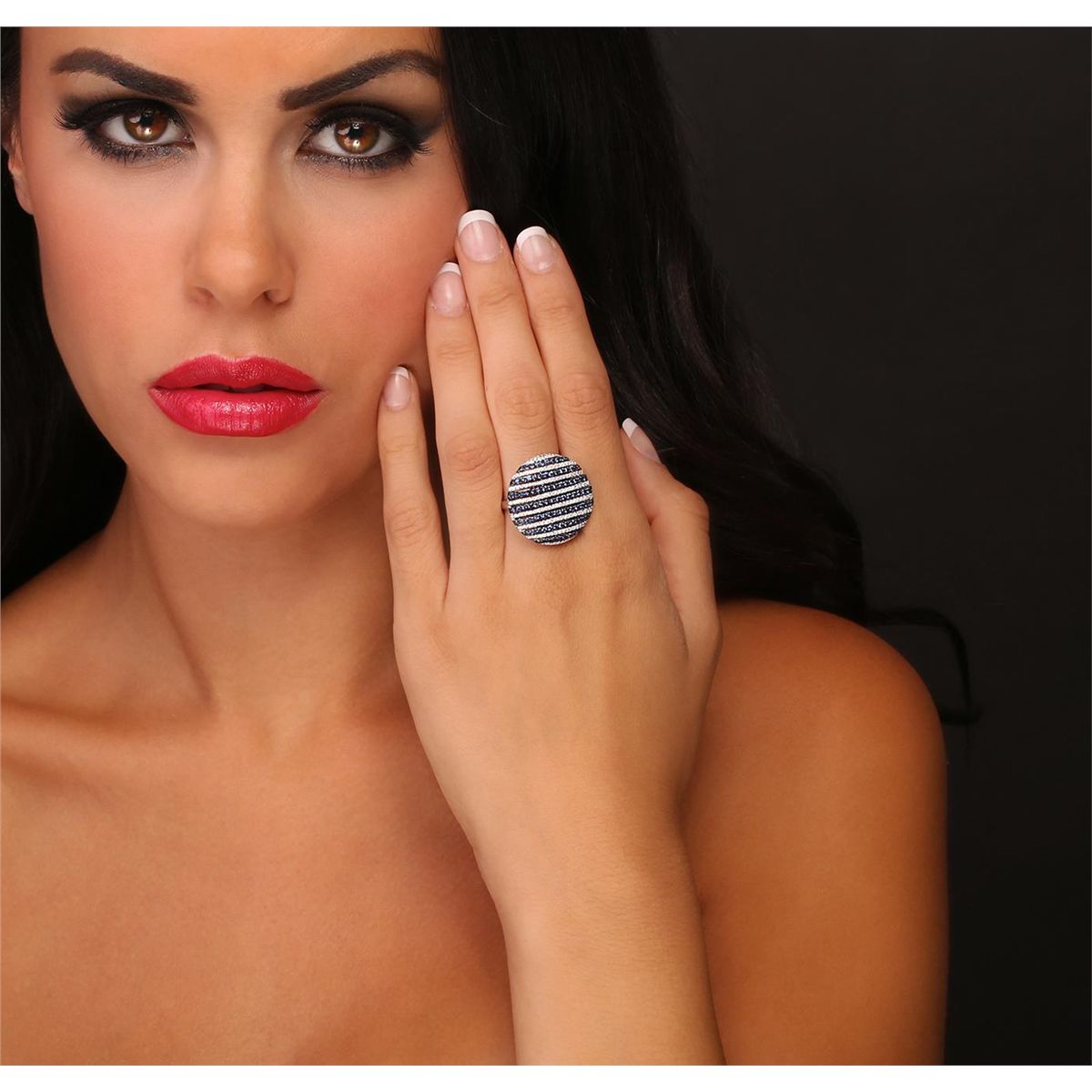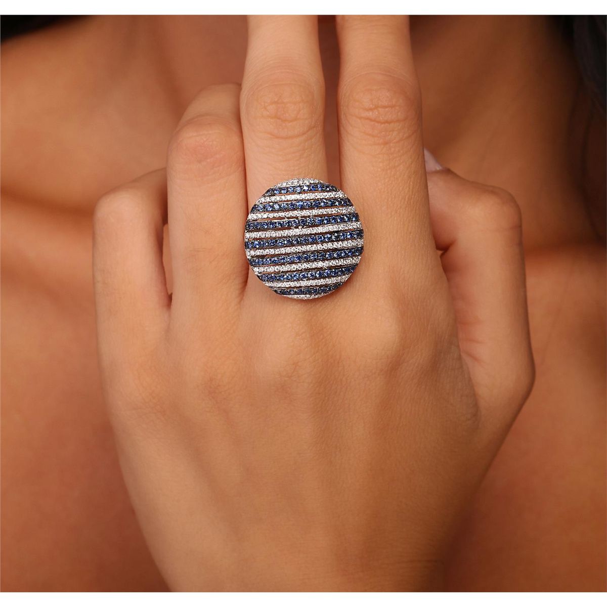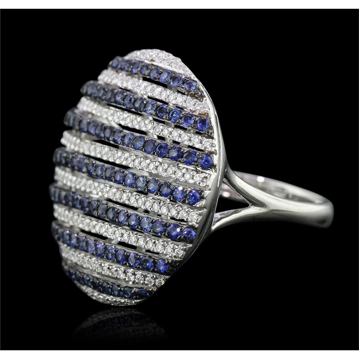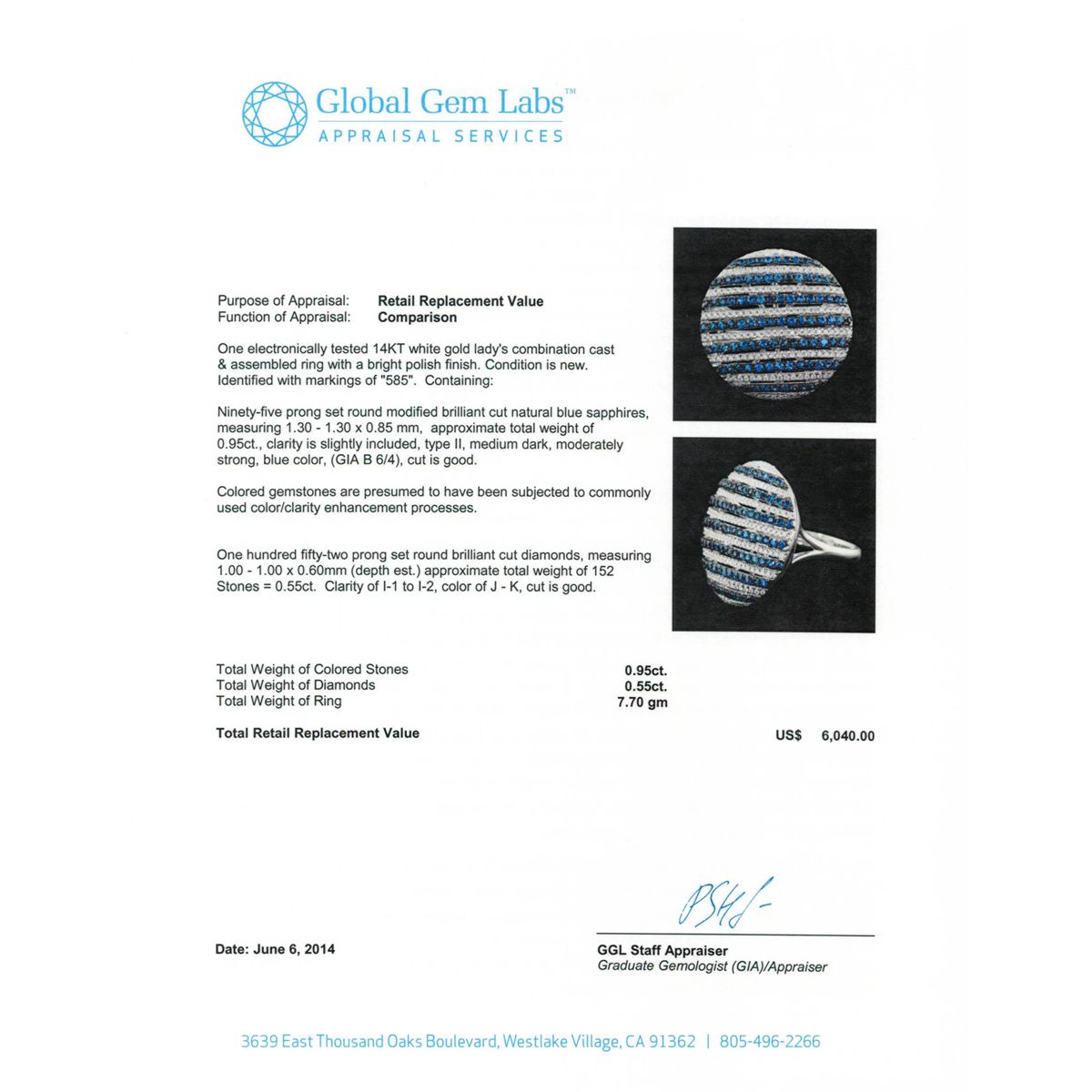 One electronically tested 14KT white gold Ladies combination cast & assembled ring with a bright polish finish. Condition is new. Identified with markings of "585". Containing: Ninety-five prong set round modified brilliant cut natural blue sapphires, measuring 1.30 - 1.30 x 0.85 mm, approximate. Total Weight of 0.95ct., clarity is slightly included, type II, medium dark, moderately strong, blue color, (GIA B 6/4), cut is good. Colored gemstones are presumed to have been subjected to commonly used color/clarity enhancement processes. One Hundred Fifty-Two prong set round brilliant cut diamonds, measuring 1.00 - 1.00 x 0.60mm (depth est.) approximate. Total Weight of 152 Stones = 0.55ct. Clarity: I-1 to I-2. Color: J - K, Cut is Good. Total Weight of Colored Stones 0.95ct. Total Weight of Diamonds 0.55ct. Total Weight of Ring 7.70 grams. GGL Appraised at $6,040.00.