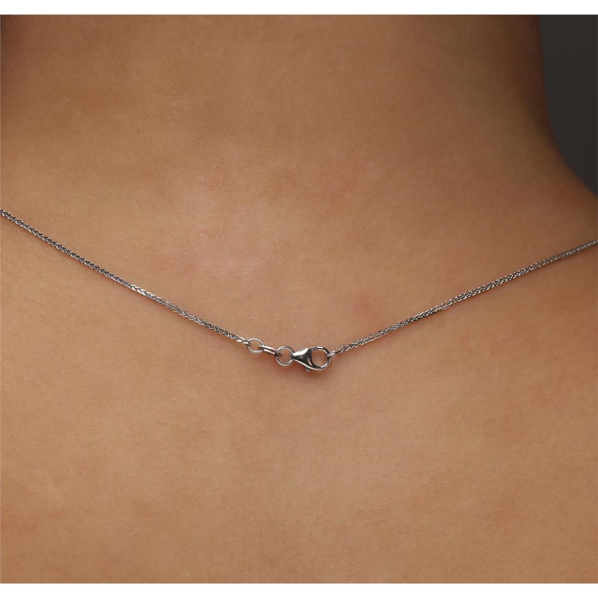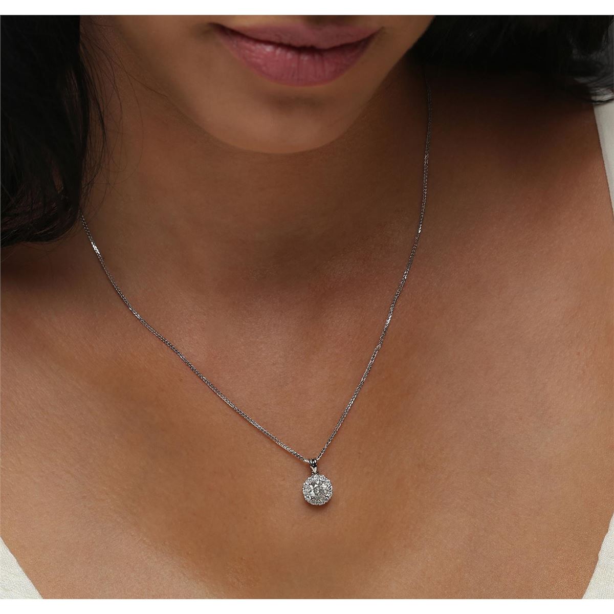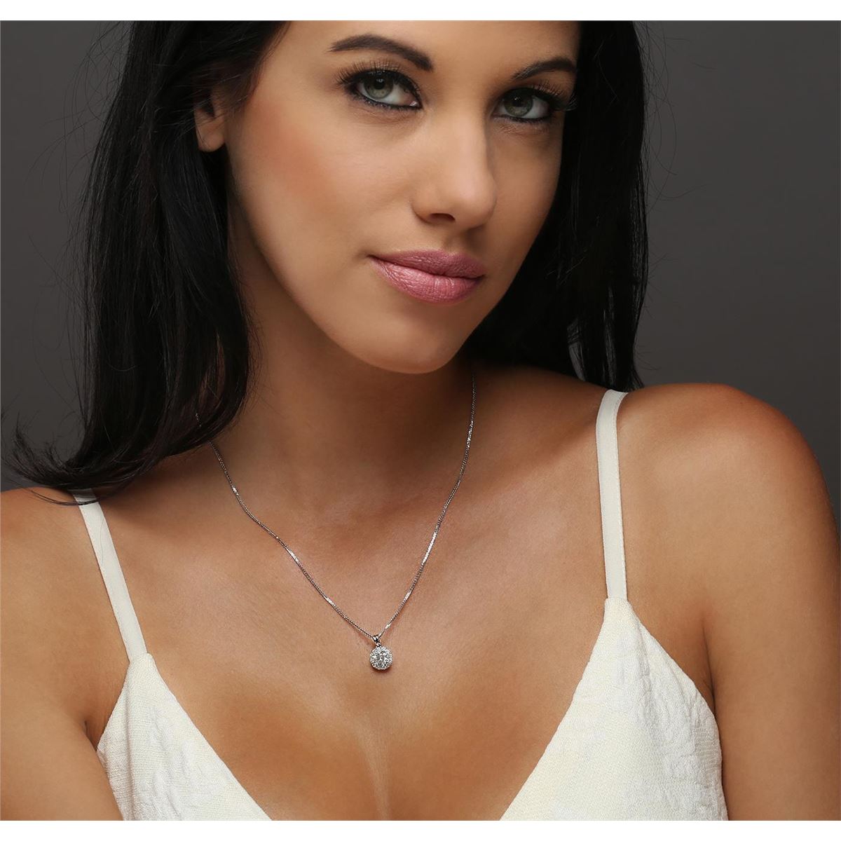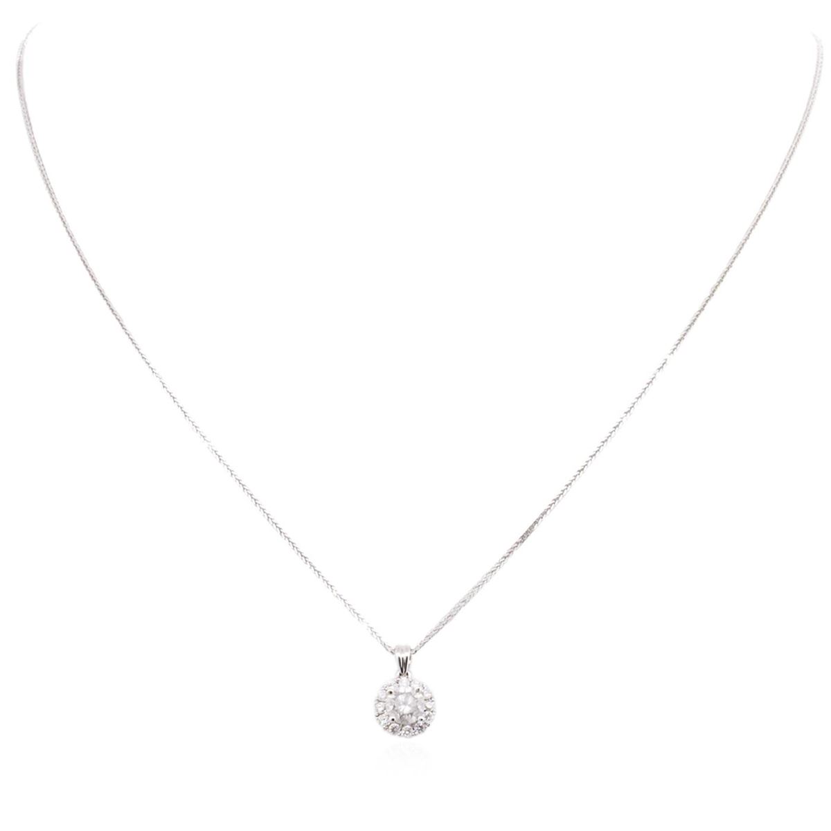 One electronically tested 14KT white gold ladies combination cast & assembled diamond pendant & chain 18.0" long, medium fancy cable with a lobster claw clasp with a bright polish finish. Identified with markings of "14K". Condition is new. Containing: One prong set round brilliant cut diamond, measuring 5.77 - 5.76 x 3.45mm (depth est.) approximate weight of 0.70ct. Clarity: I-3. Color: G, Cut is Good. Twelve prong set round brilliant cut diamonds, measuring 1.80 - 1.80 x 1.08mm (depth est.) approximate total weight of 12 Stones = 0.26ct. Clarity: SI-2 to I-2. Color: H - I, Cut is Good. All diamonds are graded in the mounting, unless otherwise stated. Total Weight of Diamonds 0.96ct. Total Weight of Pendant & Chain 2.70 grams. GGL Appraised at $3,375.00.