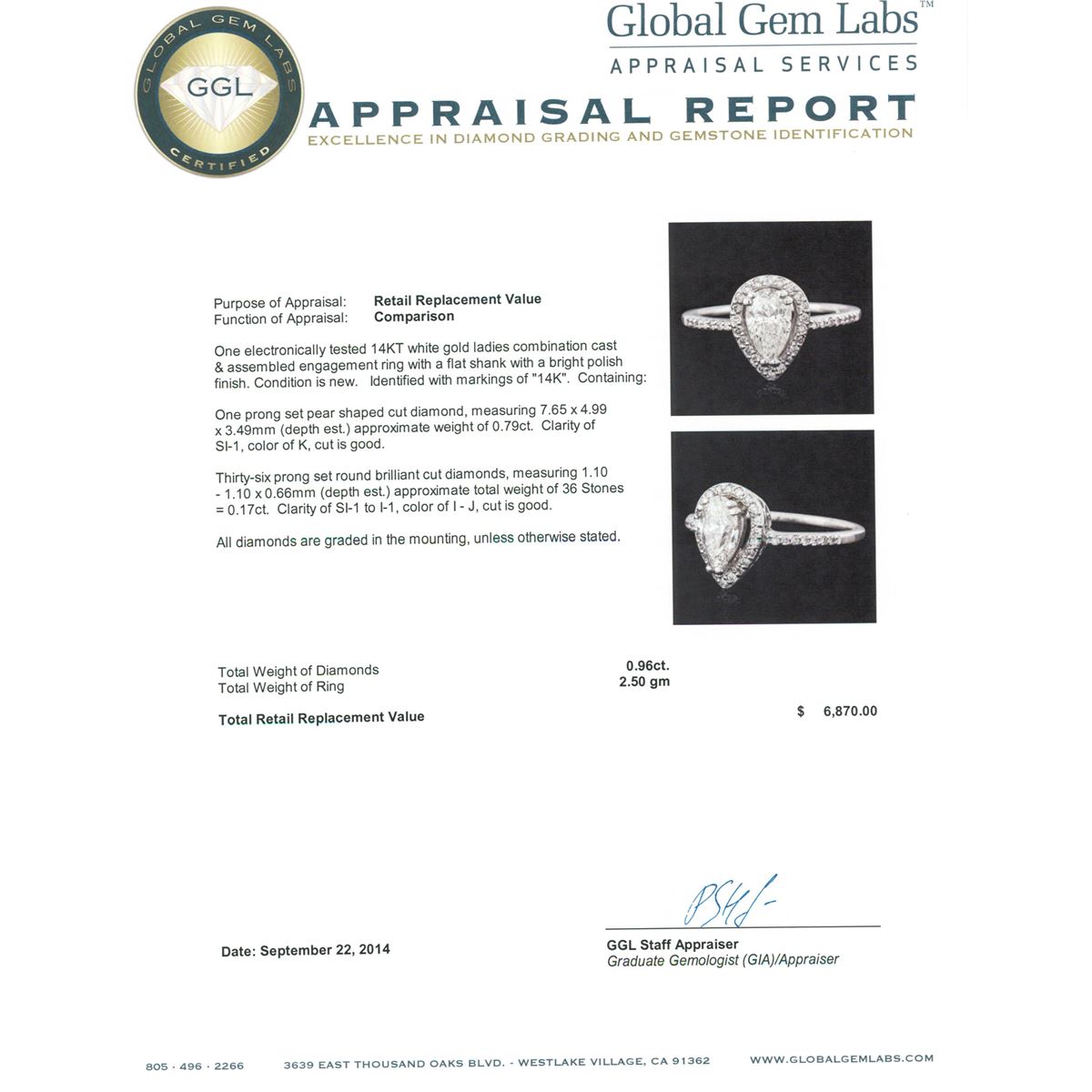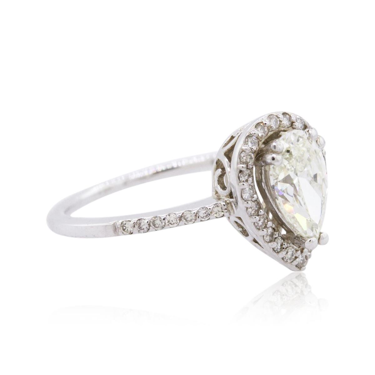 One electronically tested 14KT white gold ladies combination cast & assembled engagement ring with a flat shank with a bright polish finish. Identified with markings of "14K". Condition is new. Containing: One prong set pear shaped cut diamond, measuring 7.65 x 4.99 x 3.49mm (depth est.) approximate weight of 0.79ct. Clarity: SI-1. Color: K, Cut is Good. Thirty-Six prong set round brilliant cut diamonds, measuring 1.10 - 1.10 x 0.66mm (depth est.) approximate total weight of 36 Stones = 0.17ct. Clarity: SI-1 to I-1. Color: I - J, Cut is Good. All diamonds are graded in the mounting, unless otherwise stated. Total Weight of Diamonds 0.96ct. Total Weight of Ring 2.50 grams. GGL Appraised at $6,870.00.