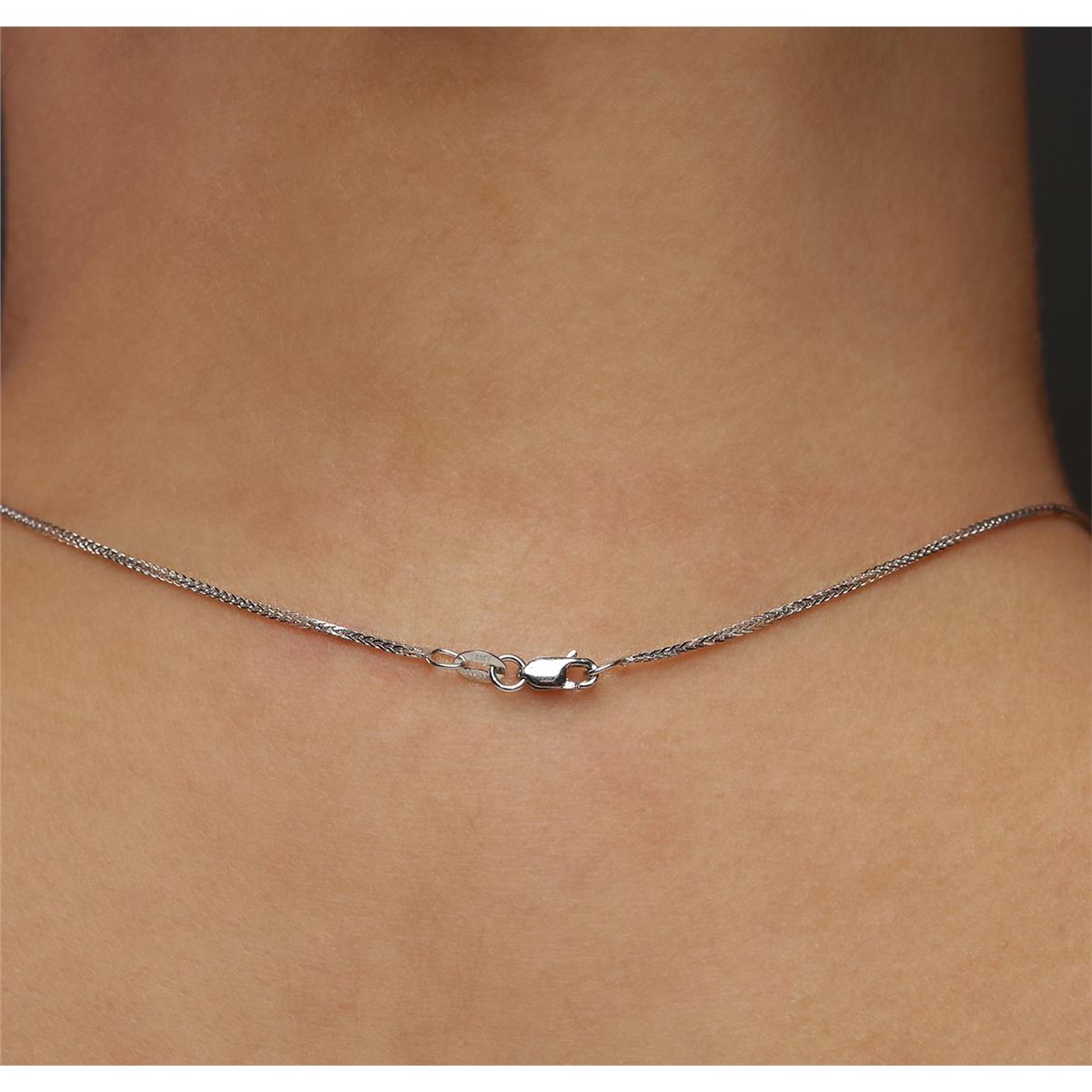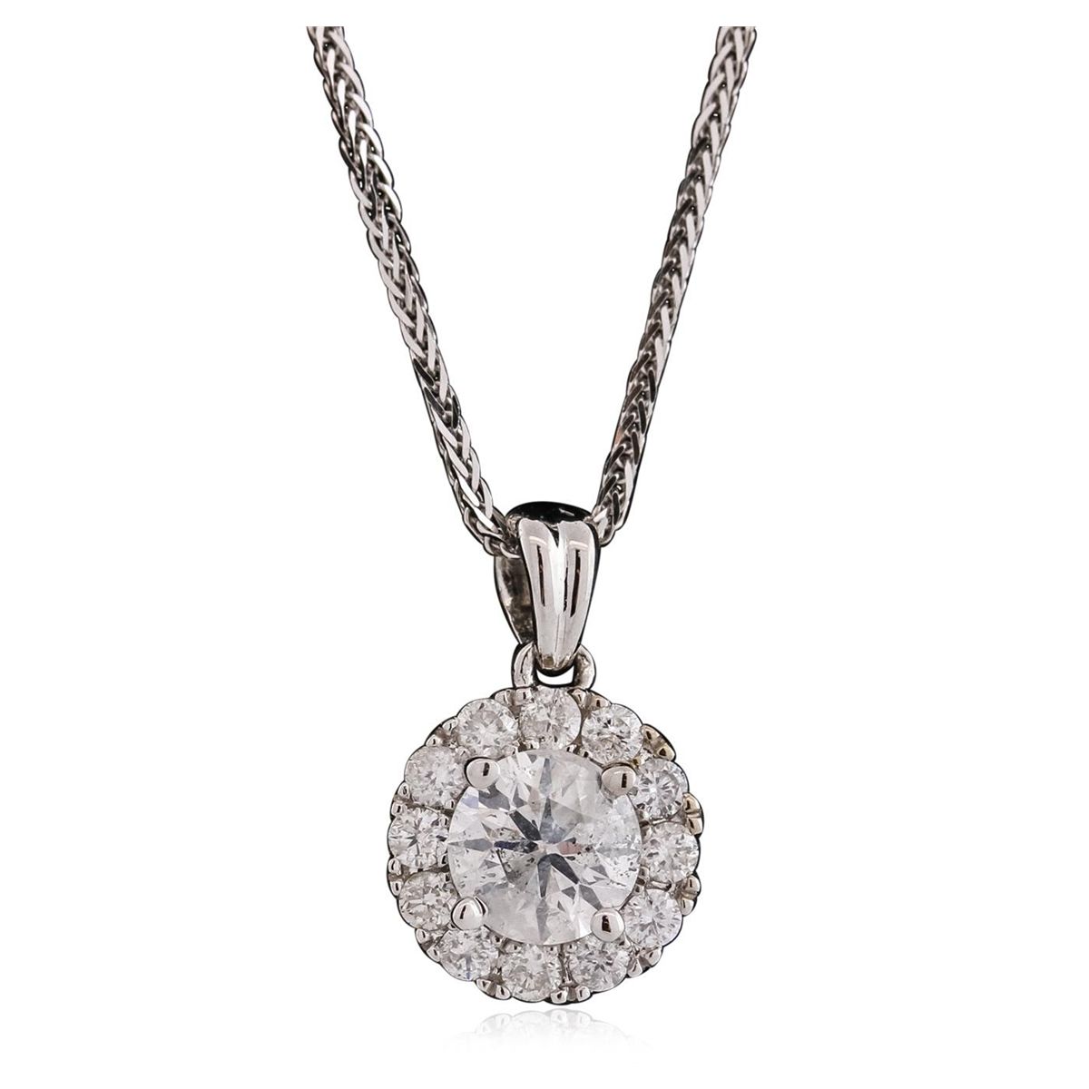 One electronically tested 14KT white gold ladies combination cast & assembled diamond pendant & chain 18.0" long, medium fancy cable with a lobster claw clasp with a bright polish finish. Identified with markings of "14K". Condition is new. Containing: One prong set round brilliant cut diamond, measuring 5.63 - 5.59 x 3.65mm (depth est.) approximate weight of 0.70ct. Clarity: I-3. Color: H, Cut is Good. Twelve prong set round brilliant cut diamonds, measuring 1.80 - 1.80 x 1.08mm (depth est.) approximate total weight of 12 Stones = 0.26ct. Clarity: SI-2 to I-2. Color: H - J, Cut is Good. All diamonds are graded in the mounting, unless otherwise stated. Total Weight of Diamonds 0.96ct. Total Weight of Pendant & Chain 2.70 grams. GGL Appraised at $3,870.00.