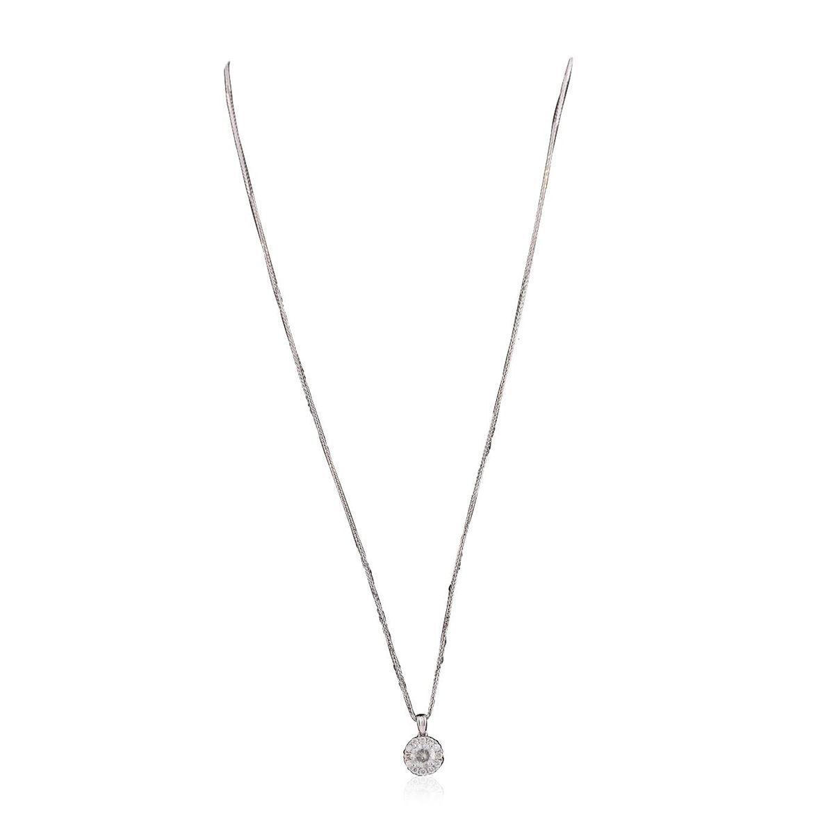 One electronically tested 14KT white gold ladies combination cast & assembled diamond pendant & chain 18.0" long, medium fancy cable with a lobster claw clasp with a bright polish finish. Identified with markings of "14K". Condition is new. Containing: One prong set round brilliant cut diamond, measuring 5.77 - 5.76 x 3.45mm (depth est.) approximate weight of 0.70ct. Clarity: I-3. Color: G, Cut is Good. Twelve prong set round brilliant cut diamonds, measuring 1.80 - 1.80 x 1.08mm (depth est.) approximate total weight of 12 Stones = 0.26ct. Clarity: SI-2 to I-2. Color: H - I, Cut is Good. All diamonds are graded in the mounting, unless otherwise stated. Total Weight of Diamonds 0.96ct. Total Weight of Pendant & Chain 2.70 grams. GGL Appraised at $3,375.00.