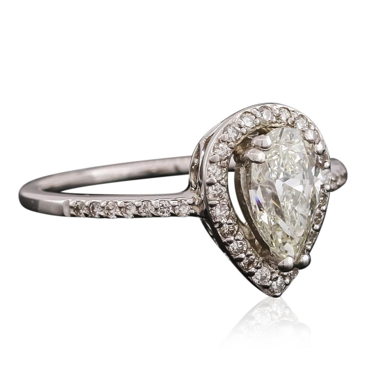 One electronically tested 14KT white gold ladies combination cast & assembled engagement ring with a flat shank with a bright polish finish. Identified with markings of "14K". Condition is new. Containing: One prong set pear shaped cut diamond, measuring 7.65 x 4.99 x 3.49mm (depth est.) approximate weight of 0.79ct. Clarity: SI-1. Color: K, Cut is Good. Thirty-Six prong set round brilliant cut diamonds, measuring 1.10 - 1.10 x 0.66mm (depth est.) approximate total weight of 36 Stones = 0.17ct. Clarity: SI-1 to I-1. Color: I - J, Cut is Good. All diamonds are graded in the mounting, unless otherwise stated. Total Weight of Diamonds 0.96ct. Total Weight of Ring 2.50 grams. GGL Appraised at $6,870.00.