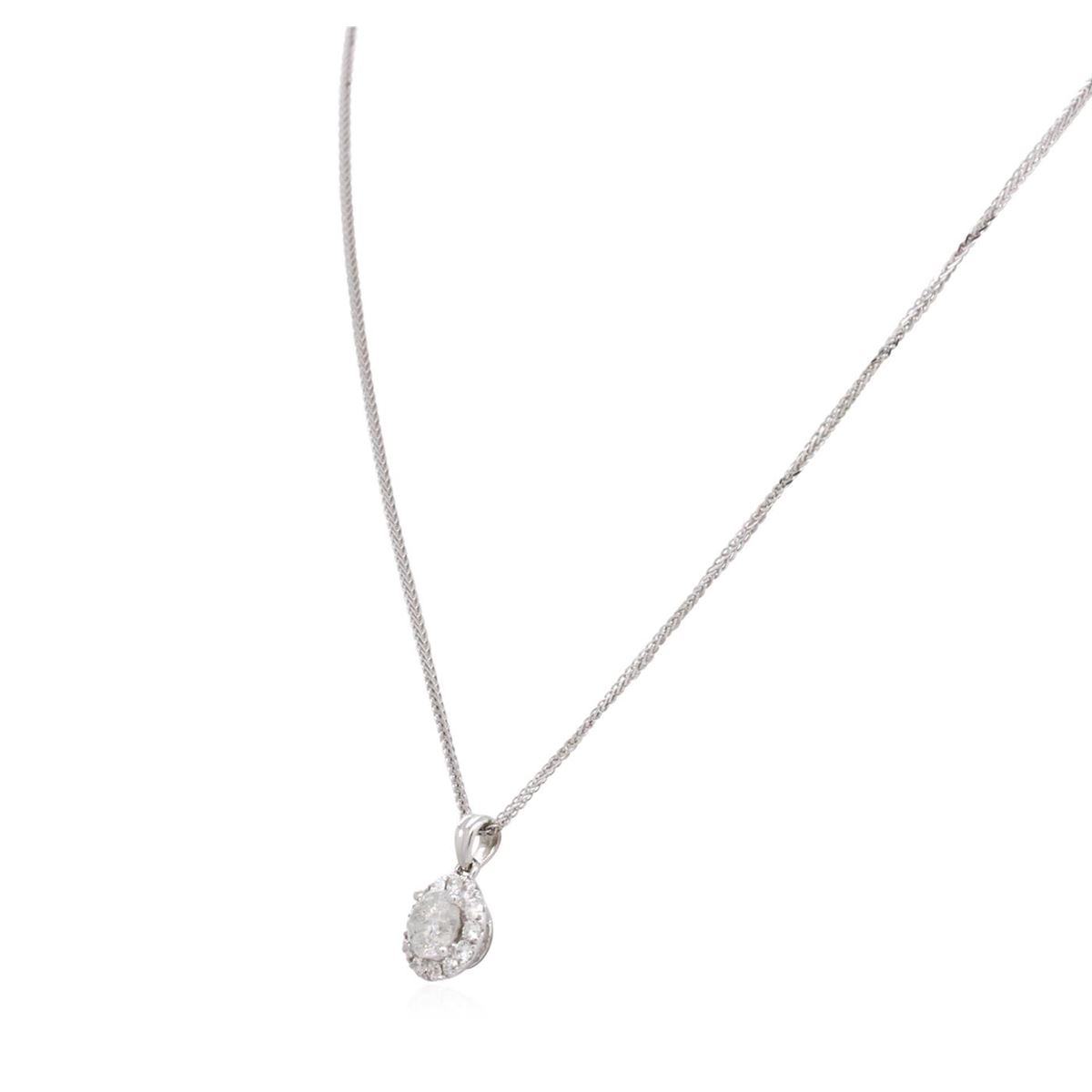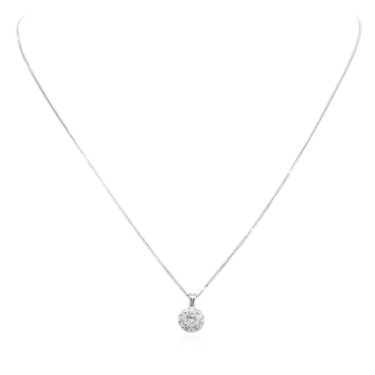 One electronically tested 14KT white gold ladies combination cast & assembled diamond pendant & chain 18.0" long, medium fancy cable with a lobster claw clasp with a bright polish finish. Identified with markings of "14K". Condition is new. Containing: One prong set round brilliant cut diamond, measuring 5.73 - 5.72 x 3.59mm (depth est.) approximate weight of 0.72ct. Clarity: I-3. Color: H, Cut is Good. Twelve prong set round brilliant cut diamonds, measuring 1.80 - 1.80 x 1.08mm (depth est.) approximate total weight of 12 Stones = 0.26ct. Clarity: SI-2 to I-2. Color: H - J, Cut is Good. All diamonds are graded in the mounting, unless otherwise stated. Total Weight of Diamonds 0.97ct. Total Weight of Pendant & Chain 2.70 grams. GGL Appraised at $3,930.00.