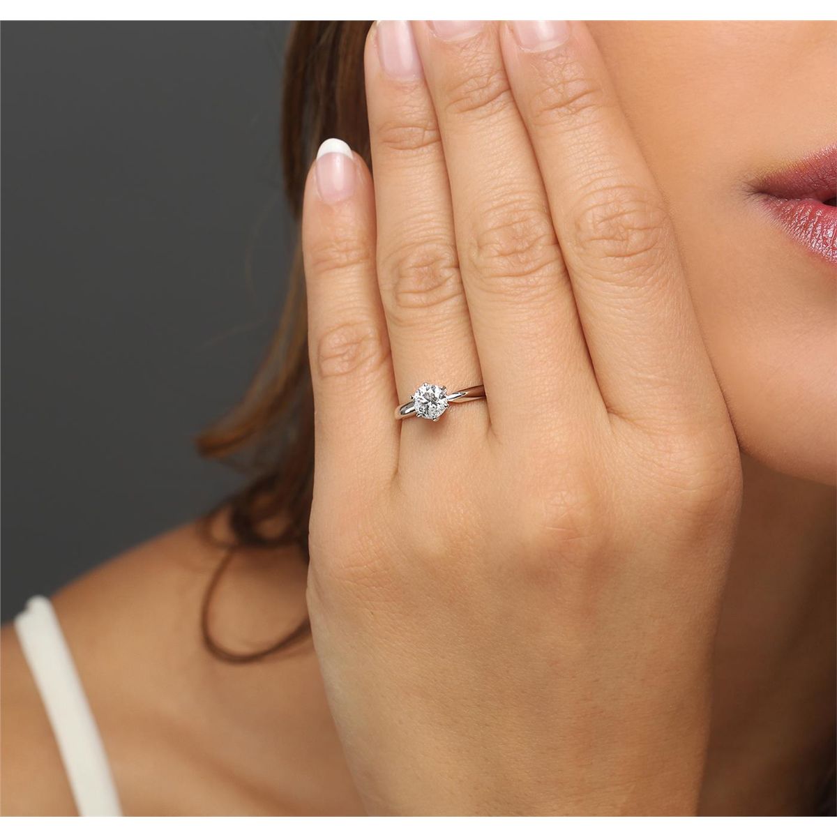 One electronically tested 14KT white gold ladies cast diamond solitaire ring with a bright polish finish. The ring is completed by a two millimeter wide band. Identified with markings of "14K". Condition is new, good workmanship. Containing: One prong set round brilliant cut diamond, measuring 5.90 - 5.85 x 4.00mm (depth est.), 4.00.%. GTCF approximate weight of 0.97ct. Graded in the setting. Clarity: I-1. Color: F. Depth 68.0%. Table 59.5%. Total Weight of Diamonds 0.97ct. Total Weight of Ring 2.62 grams. AIG Appraised at $10,840.00.