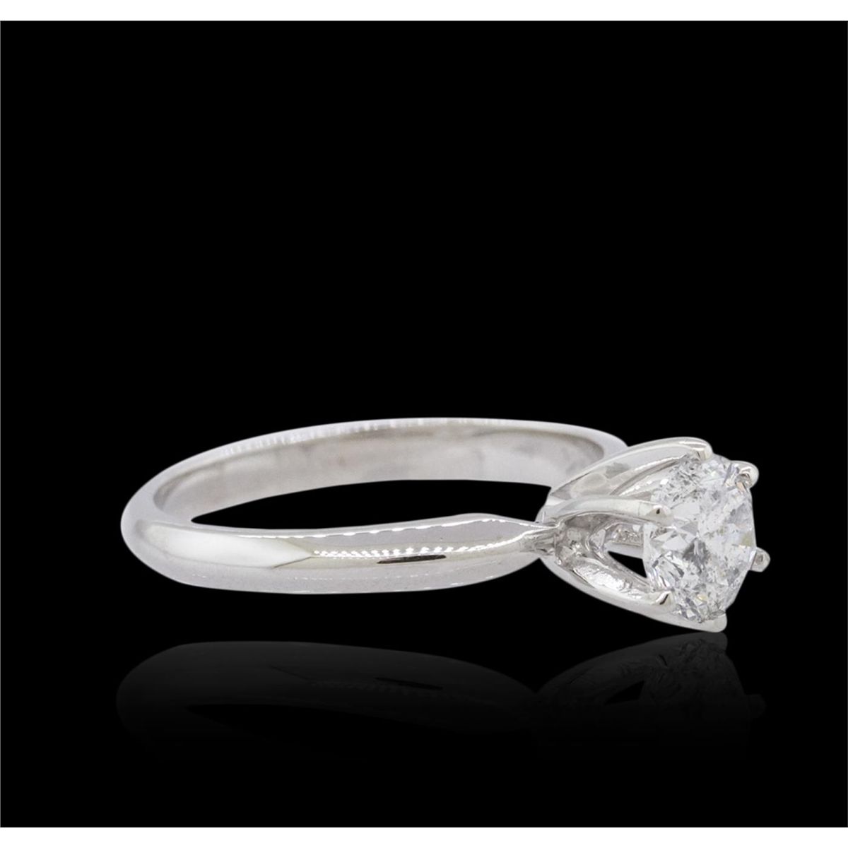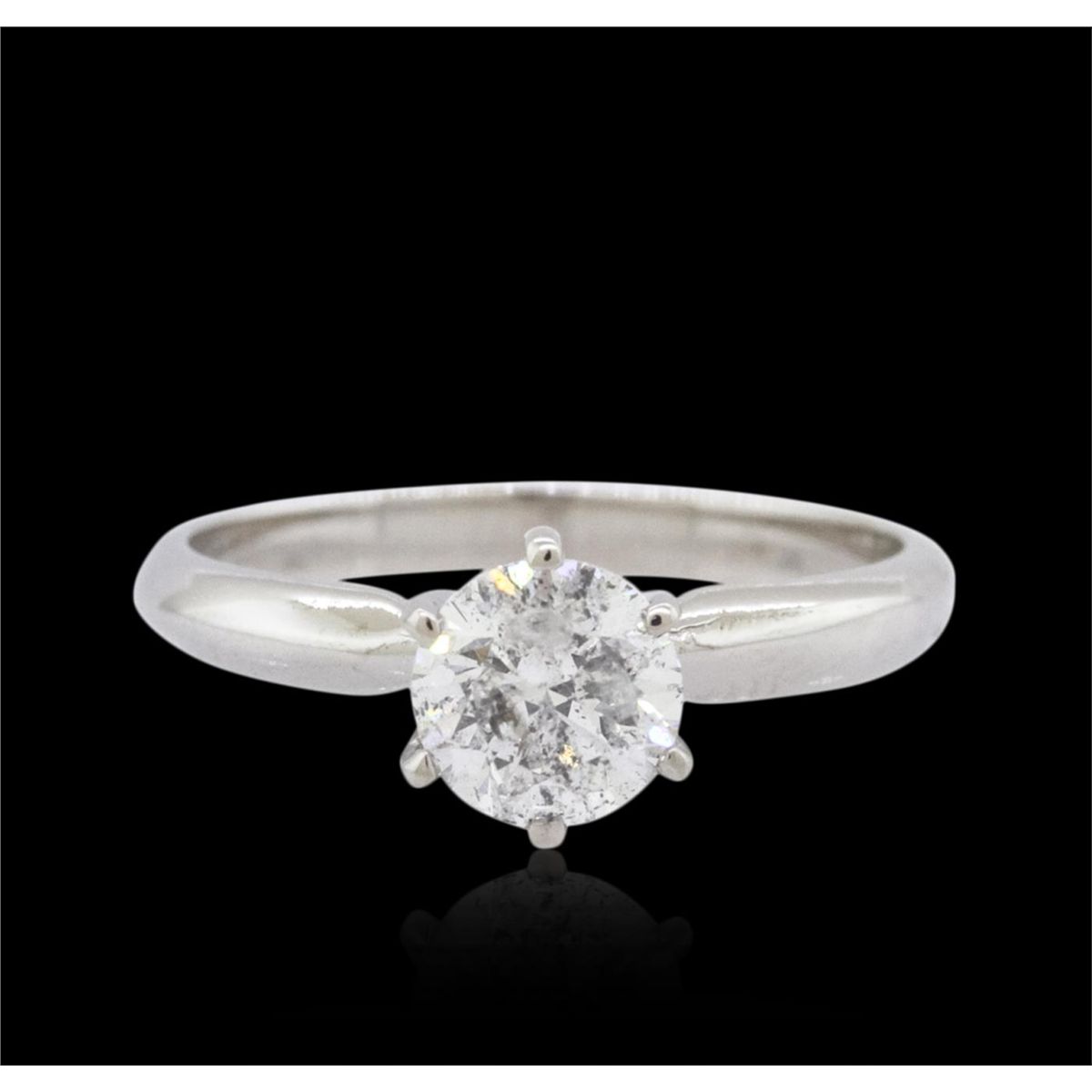 One electronically tested 14KT white gold ladies cast diamond solitaire ring with a bright polish finish. The ring is completed by a two millimeter wide band. Identified with markings of "14K". Condition is new, good workmanship. Containing: One prong set round brilliant cut diamond, measuring 5.90 - 5.85 x 4.00mm (depth est.), 4.00.%. GTCF approximate weight of 0.97ct. Graded in the setting. Clarity: I-1. Color: F. Depth 68.0%. Table 59.5%. Total Weight of Diamonds 0.97ct. Total Weight of Ring 2.62 grams. AIG Appraised at $10,840.00.