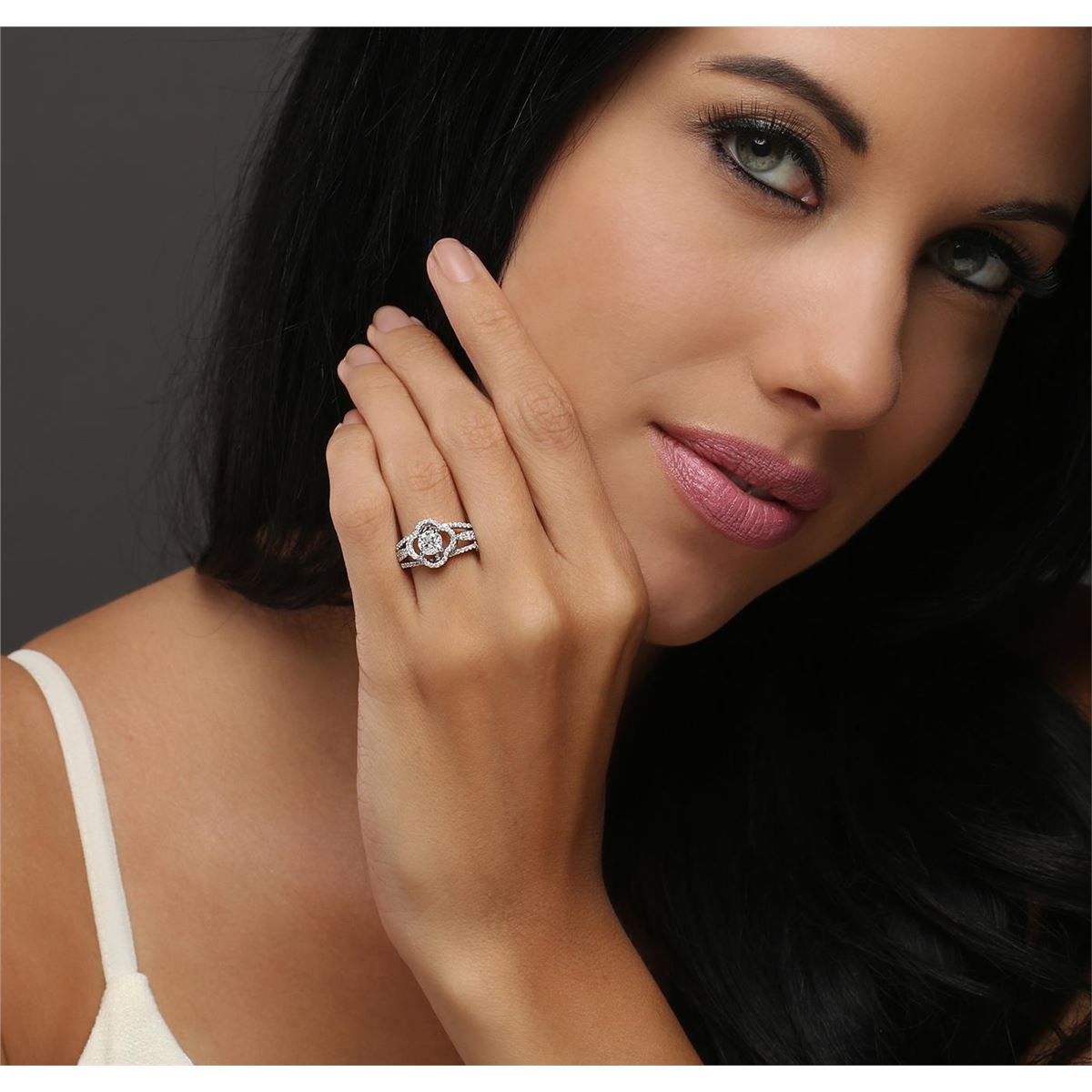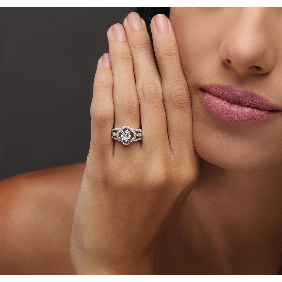 One electronically tested 14KT white gold ladies combination cast & assembled engagement ring with a split shank with a bright polish finish. Identified with markings of "14K". Condition is new. Containing: One prong set round brilliant cut diamond, measuring 5.40 - 5.40 x 3.07mm (depth est.) approximate weight of 0.55ct. Clarity: I-1. Color: H, Cut is Good. One Hundred Two prong set round brilliant cut diamonds, measuring 1.10 - 1.00 x 0.63mm (depth est.) approximate total weight of 102 Stones = 0.43ct. Clarity: I-1 to I-2. Color: H - I, Cut is Good. All diamonds are graded in the mounting, unless otherwise stated. Total Weight of Diamonds 0.97ct. Total Weight of Ring 4.30 grams. GGL Appraised at $6,225.00.