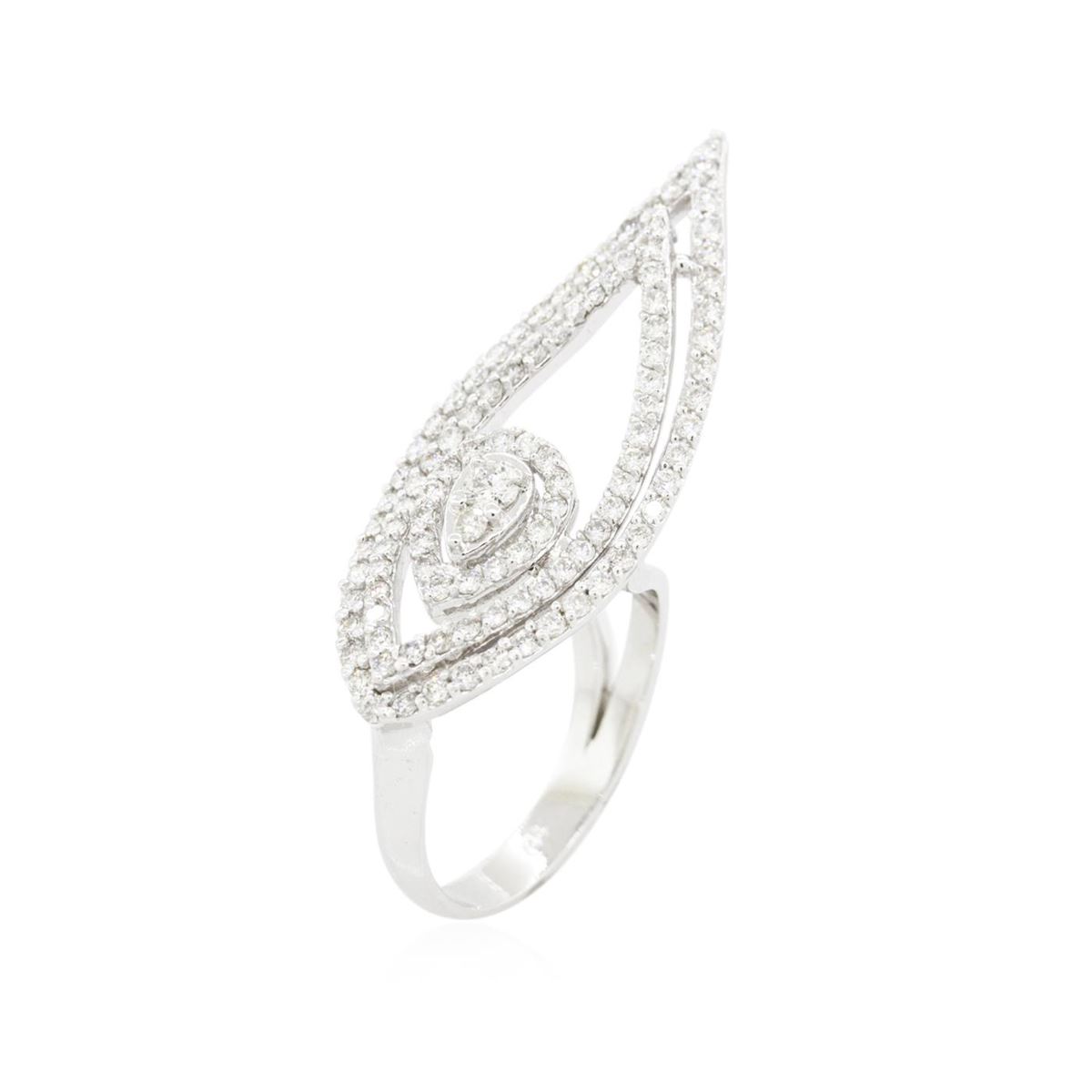One electronically tested 14KT white gold ladies cast diamond ring with a bright polish finish. Identified with markings of "K14". Condition is new. Containing: One prong set round brilliant cut diamond, measuring 2.80 - 2.80 x 1.68mm (depth est.) approximate weight of 0.08ct. Clarity: I-1. Color: I, Cut is Good. One Hundred Twelve prong set round brilliant cut diamonds, measuring 1.50 - 1.10 x 0.78mm (depth est.) approximate total weight of 112 Stones = 0.90ct. Clarity: I-1 to I-2. Color: I - J, Cut is Good. All diamonds are graded in the mounting, unless otherwise stated. Total Weight of Diamonds 0.98ct. Total Weight of Ring 5.80 grams. GGL Appraised at $4,850.00.
