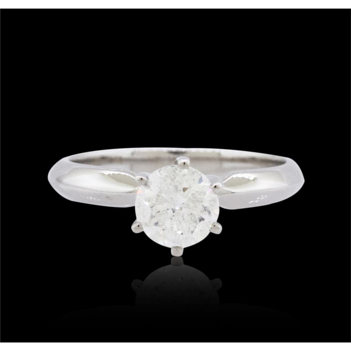 One electronically tested 14KT white gold ladies cast diamond solitaire ring with a bright polish finish. The ring is completed by a two and one-half millimeter wide band. Identified with markings of "14K". Condition is new, good workmanship. Containing: One prong set round brilliant cut diamond, measuring 5.95 - 5.90 x 3.95mm (depth est.), 5.00.%. GTCF approximate weight of 0.98ct. Graded in the setting. Clarity: I-2. Color: I. Depth 66.6%. Table 60.7%. Total Weight of Diamonds 0.98ct. Total Weight of Ring 2.99 grams. AIG Appraised at $6,240.00.