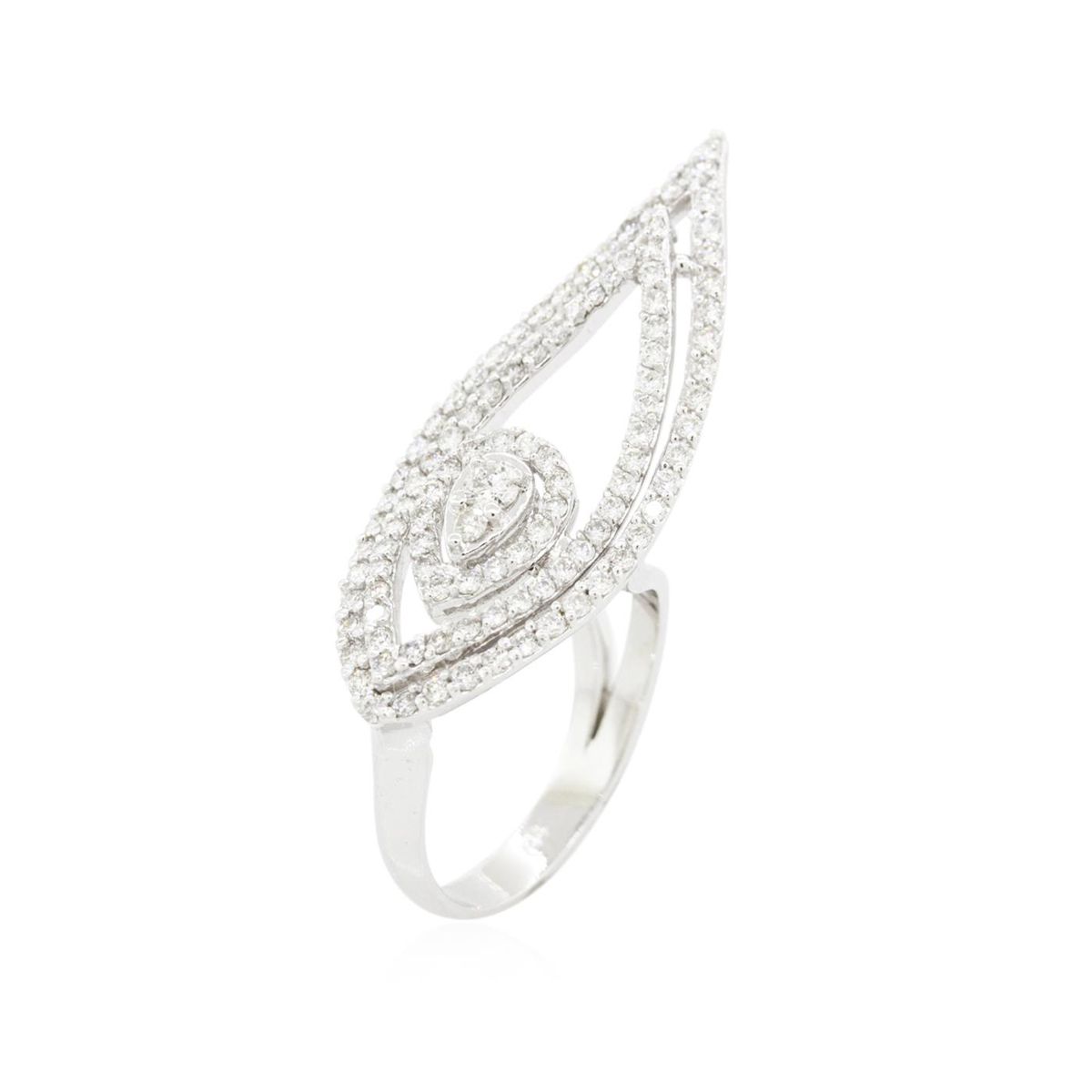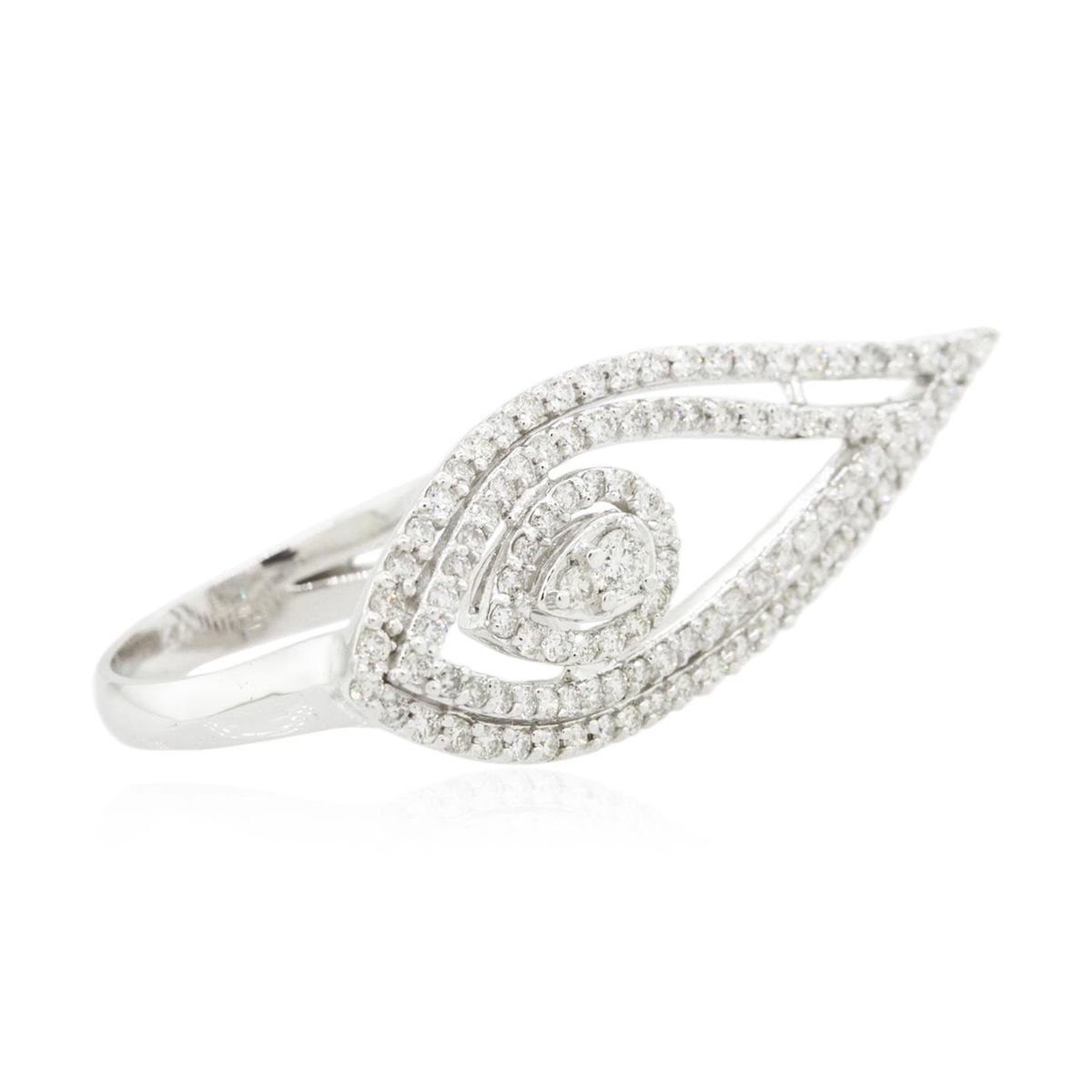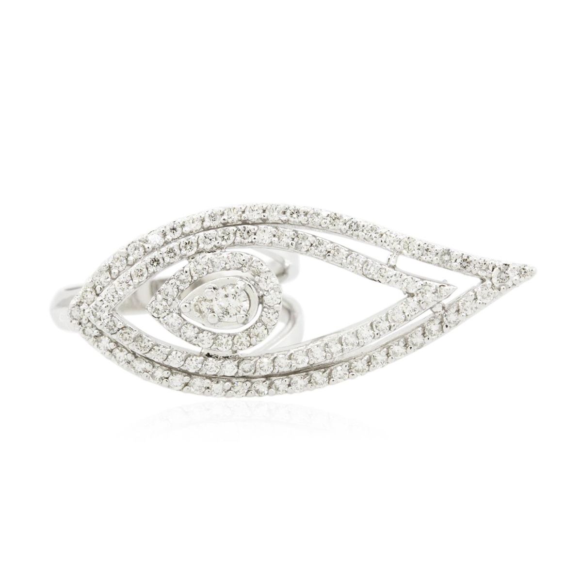 One electronically tested 14KT white gold ladies cast diamond ring with a bright polish finish. Identified with markings of "K14". Condition is new. Containing: One prong set round brilliant cut diamond, measuring 2.80 - 2.80 x 1.68mm (depth est.) approximate weight of 0.08ct. Clarity: I-1. Color: I, Cut is Good. One Hundred Twelve prong set round brilliant cut diamonds, measuring 1.50 - 1.10 x 0.78mm (depth est.) approximate total weight of 112 Stones = 0.90ct. Clarity: I-1 to I-2. Color: I - J, Cut is Good. All diamonds are graded in the mounting, unless otherwise stated. Total Weight of Diamonds 0.98ct. Total Weight of Ring 5.80 grams. GGL Appraised at $4,850.00.