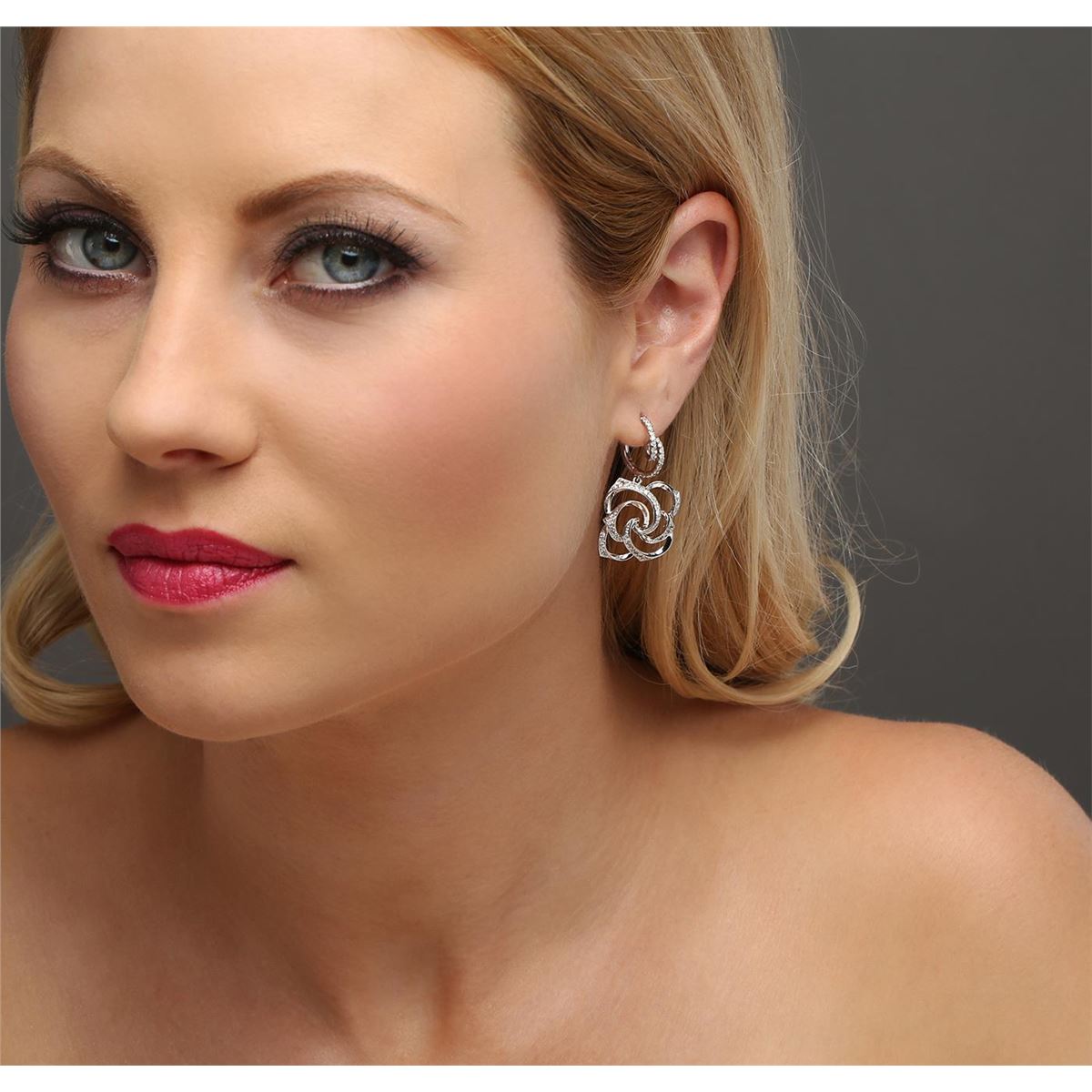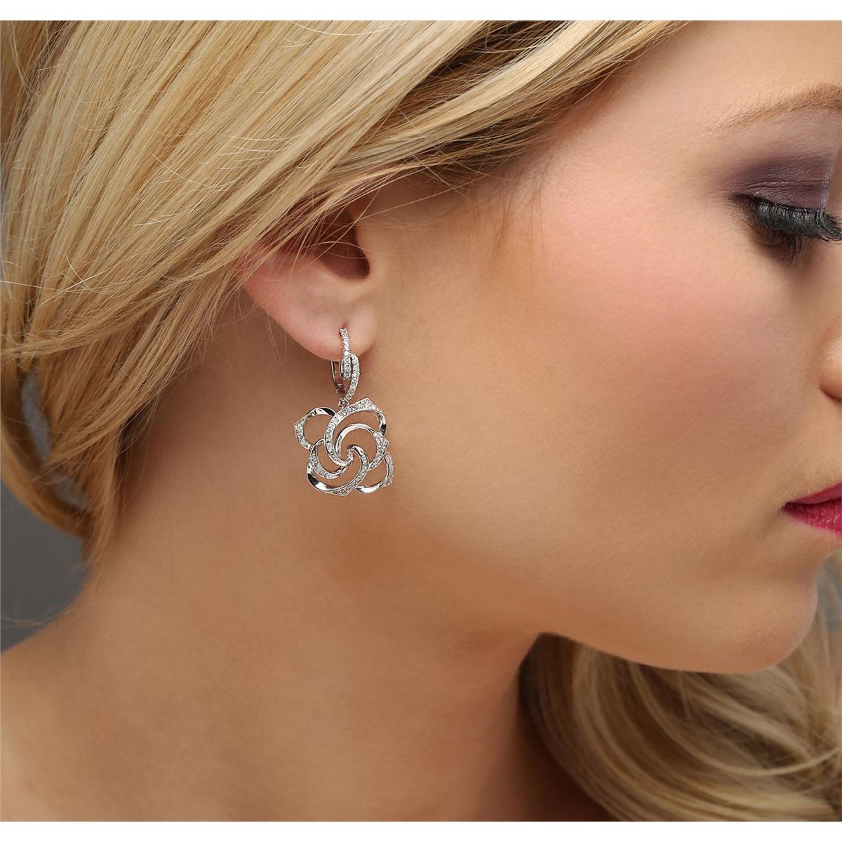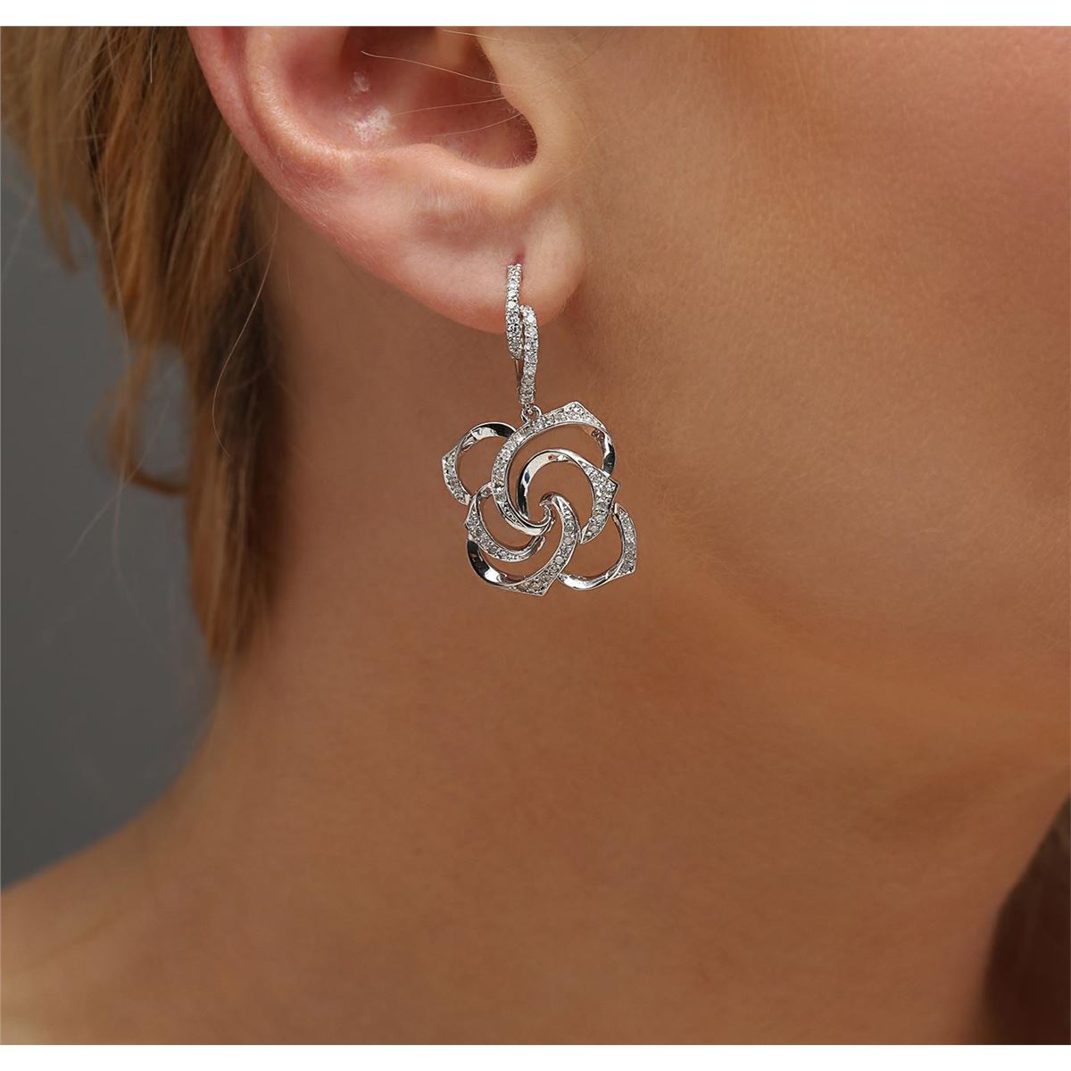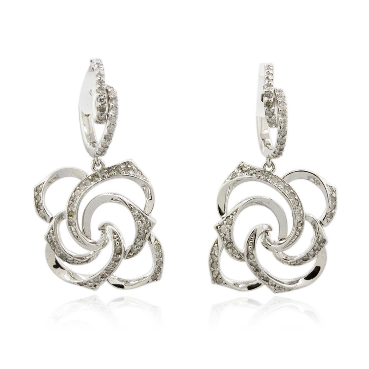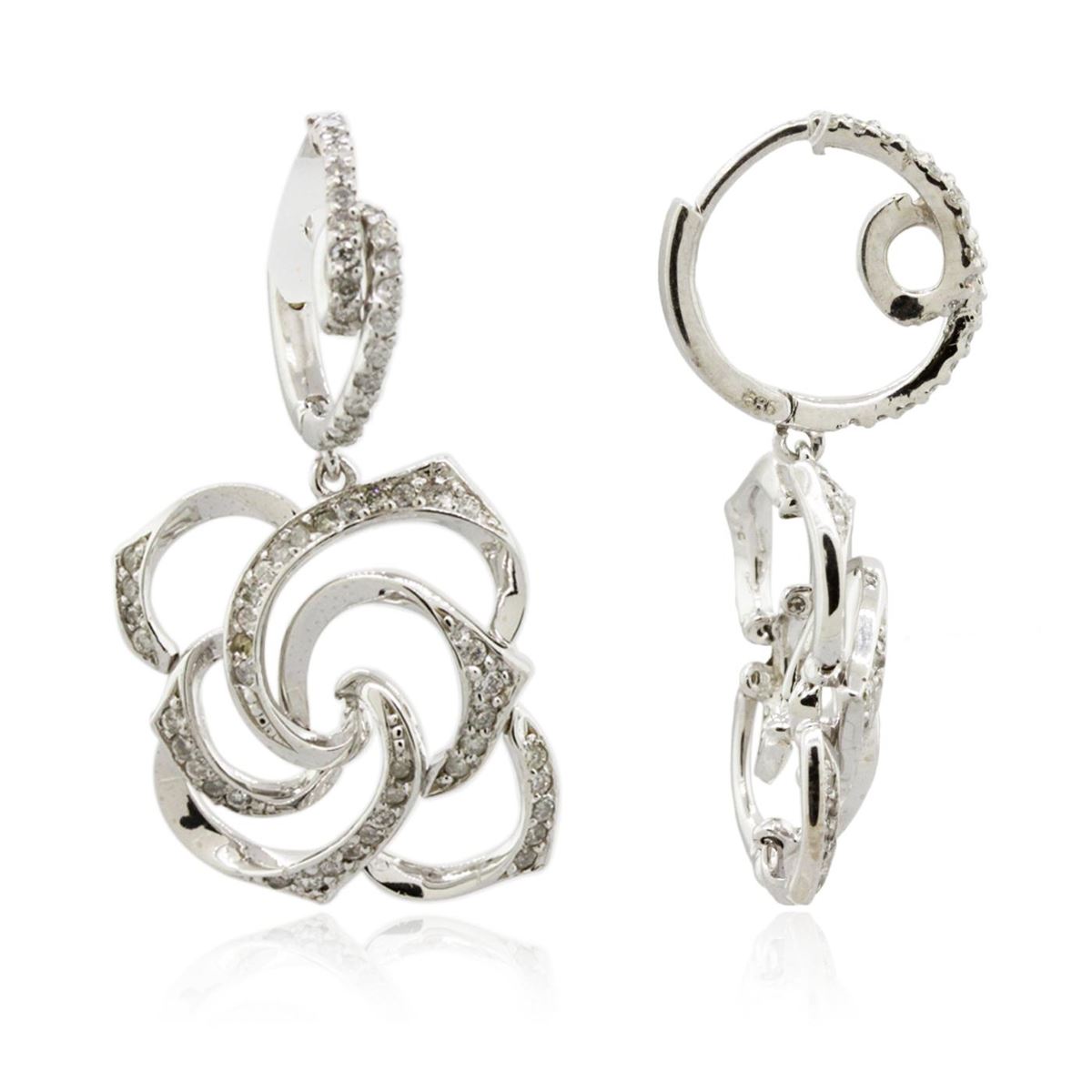 One pair electronically tested 14KT white gold ladies combination cast & assembled diamond earrings with lever backs with a bright polish finish. Identified with markings of "585". Condition is new. Containing: One Hundred Twenty-Four prong set round brilliant cut diamonds, measuring 1.30 - 1.30 x 0.78mm (depth est.) approximate total weight of 124 Stones = 0.99ct. Clarity: SI-2 to I-2. Color: I - J. All diamonds are graded in the mounting, unless otherwise stated. Total Weight of Diamonds 0.99ct. Total Weight of Earrings 7.70 grams. GGL Appraised at $3,170.00.