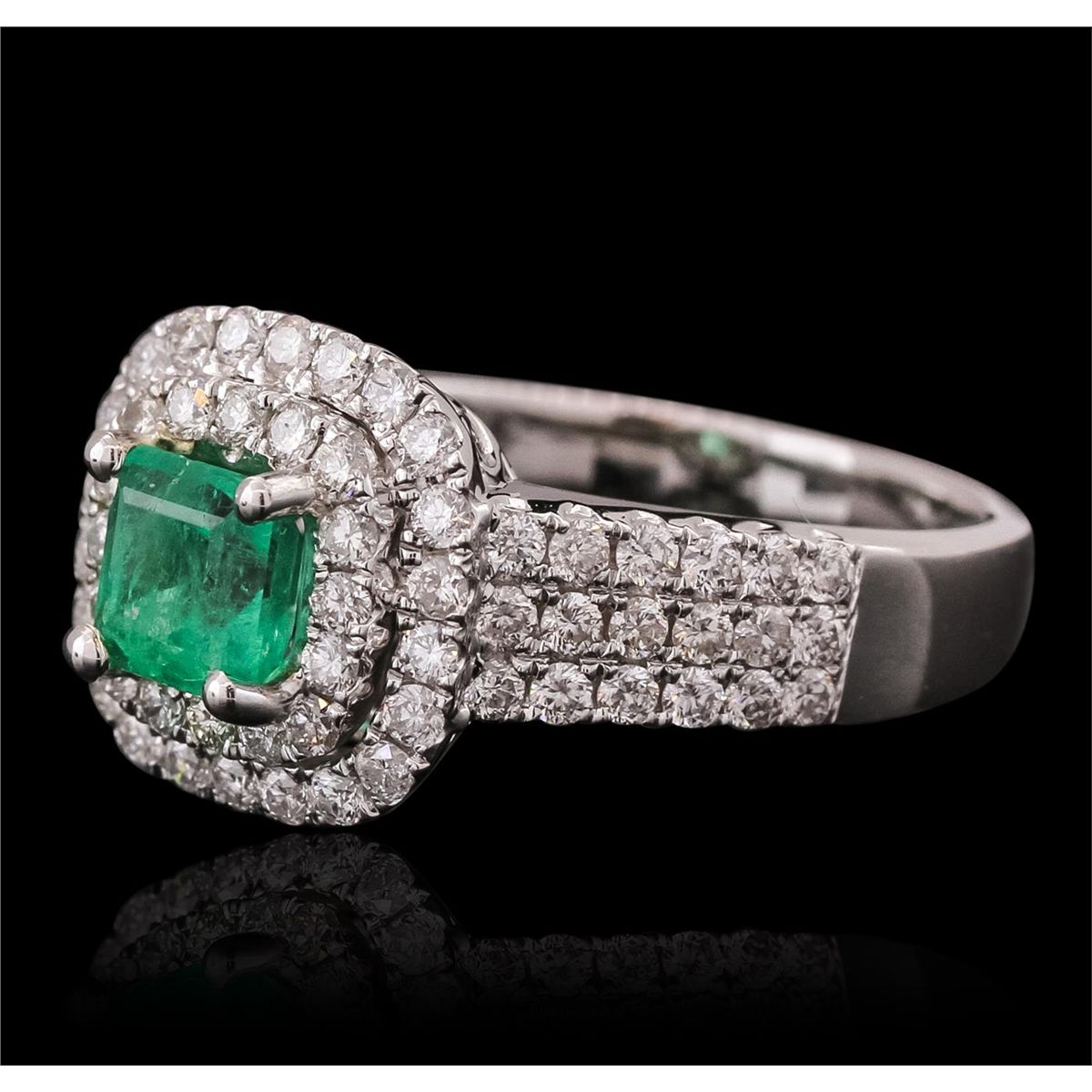 One electronically tested 14KT white gold ladies combination cast & assembled emerald and diamond ring with a tapered shank with a bright polish finish. Identified with markings of "14K". Condition is new. Containing: One prong set emerald standard step cut natural emerald, measuring 5.50 x 5.45 x 4.50mm, approximate weight of 0.99ct., clarity is moderately included, type III, medium, moderately strong, green color, (GIA G 5/4), cut is good. Seventy-Four prong set round brilliant cut diamonds, measuring 1.50 - 1.50 x 0.90mm (depth est.) approximate total weight of 74 Stones = 0.91ct. . Clarity: I-1 to I-2. Color: H - I, Cut is Good. Colored gemstones are presumed to have been subjected to commonly used enhancement processes. All diamonds and colored gemstones are graded in the mounting, unless otherwise stated.. Total Weight of Colored Stones 0.99ct.. Total Weight of Diamonds 0.91ct.. Total Weight of Ring 5.70 grams. GGL Appraised at $6,005.00.