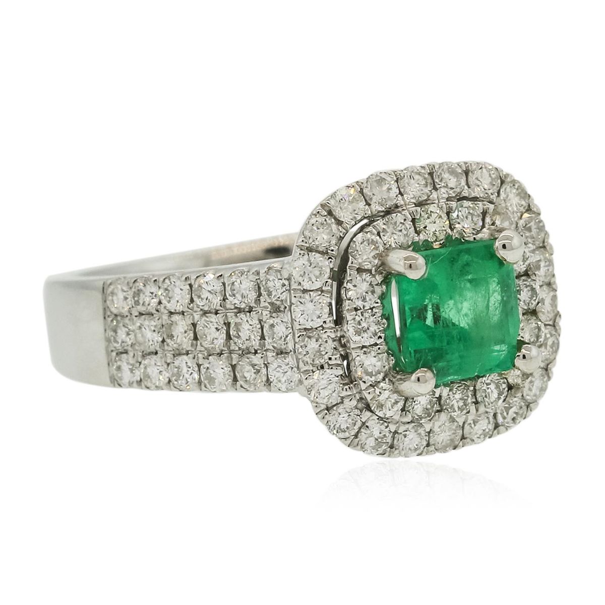 One electronically tested 14KT white gold ladies combination cast & assembled emerald and diamond ring with a tapered shank with a bright polish finish. Identified with markings of "14K". Condition is new. Containing: One prong set emerald standard step cut natural emerald, measuring 5.50 x 5.45 x 4.50mm, approximate weight of 0.99ct., clarity is moderately included, type III, medium, moderately strong, green color, (GIA G 5/4), cut is good. Seventy-Four prong set round brilliant cut diamonds, measuring 1.50 - 1.50 x 0.90mm (depth est.) approximate total weight of 74 Stones = 0.91ct. . Clarity: I-1 to I-2. Color: H - I, Cut is Good. Colored gemstones are presumed to have been subjected to commonly used enhancement processes. All diamonds and colored gemstones are graded in the mounting, unless otherwise stated.. Total Weight of Colored Stones 0.99ct.. Total Weight of Diamonds 0.91ct.. Total Weight of Ring 5.70 grams. GGL Appraised at $6,005.00.