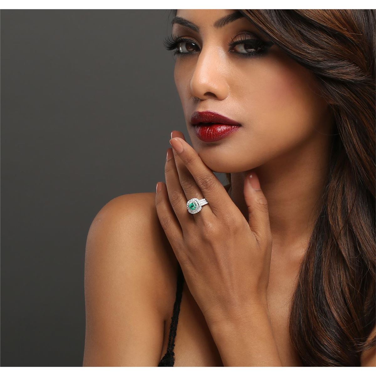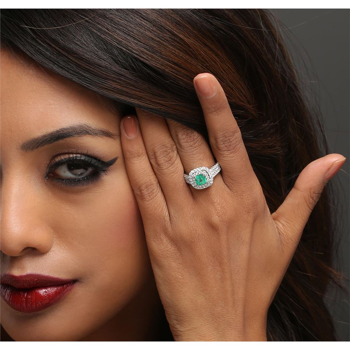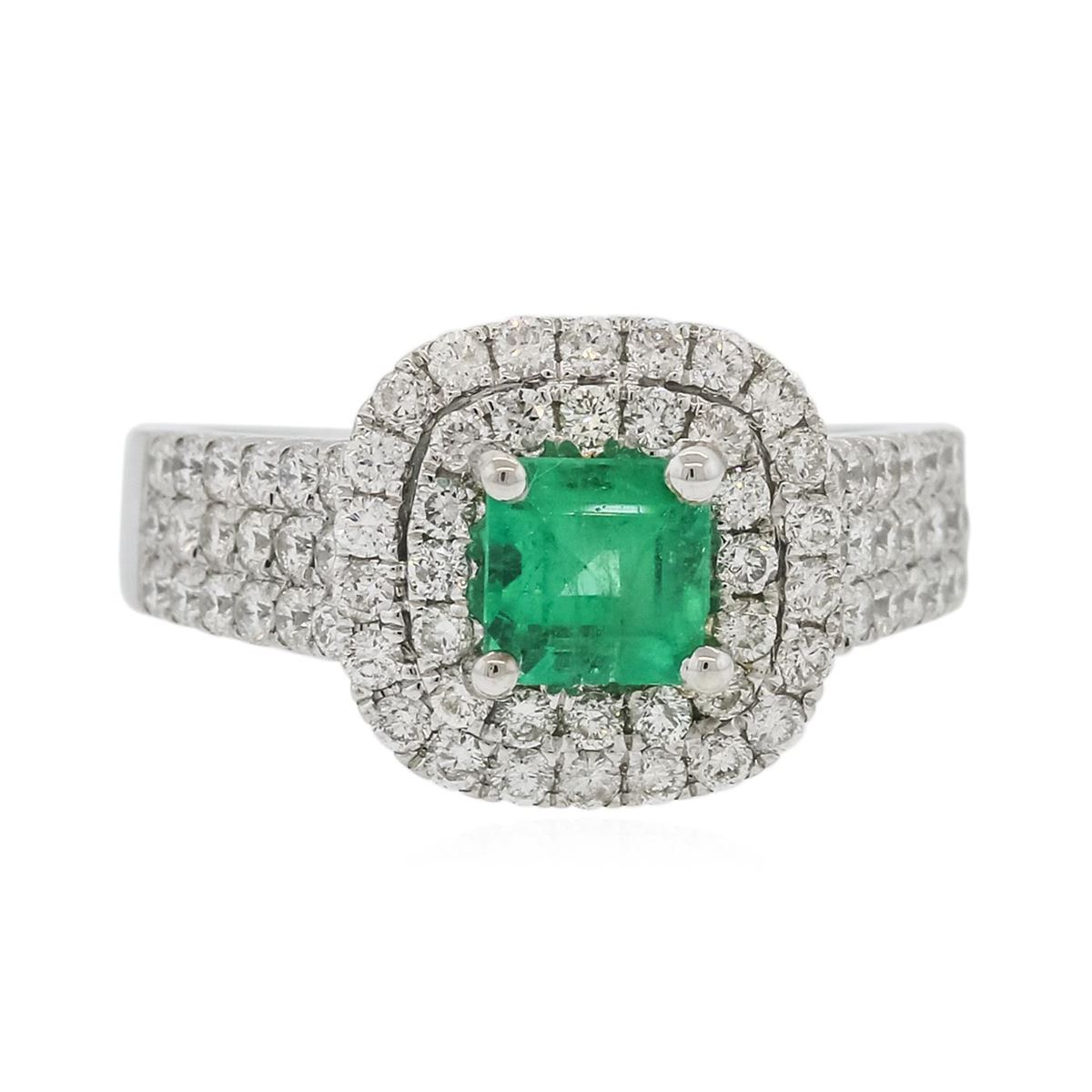 One electronically tested 14KT white gold ladies combination cast & assembled emerald and diamond ring with a tapered shank with a bright polish finish. Identified with markings of "14K". Condition is new. Containing: One prong set emerald standard step cut natural emerald, measuring 5.50 x 5.45 x 4.50mm, approximate weight of 0.99ct., clarity is moderately included, type III, medium, moderately strong, green color, (GIA G 5/4), cut is good. Seventy-Four prong set round brilliant cut diamonds, measuring 1.50 - 1.50 x 0.90mm (depth est.) approximate total weight of 74 Stones = 0.91ct. . Clarity: I-1 to I-2. Color: H - I, Cut is Good. Colored gemstones are presumed to have been subjected to commonly used enhancement processes. All diamonds and colored gemstones are graded in the mounting, unless otherwise stated.. Total Weight of Colored Stones 0.99ct.. Total Weight of Diamonds 0.91ct.. Total Weight of Ring 5.70 grams. GGL Appraised at $6,005.00.