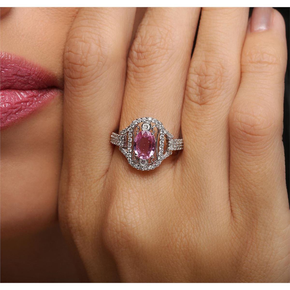 One ring featuring: 18KT white gold weighing 4.00 grams containing one pink sapphire center stone with a total weight of 0.99ct and 78 round cut diamonds with a total weight of 0.56cts.