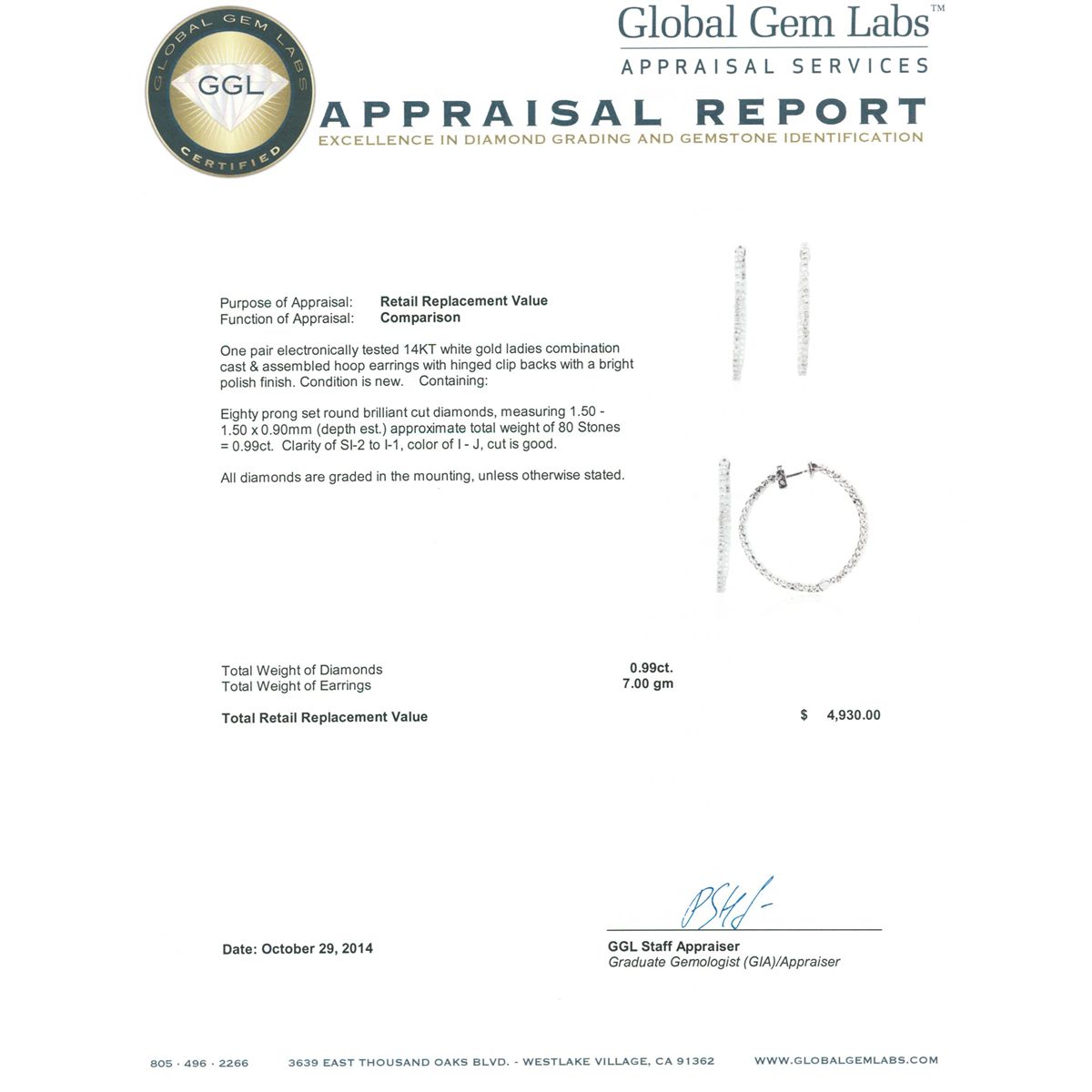 One pair electronically tested 14KT white gold ladies combination cast & assembled hoop earrings with hinged clip backs with a bright polish finish. Condition is new. Containing: Eighty prong set round brilliant cut diamonds, measuring 1.50 - 1.50 x 0.90mm (depth est.) approximate total weight of 80 Stones = 0.99ct. Clarity: SI-2 to I-1. Color: I - J, Cut is Good. All diamonds are graded in the mounting, unless otherwise stated. Total Weight of Diamonds 0.99ct. Total Weight of Earrings 7.00 grams. GGL Appraised at $4,930.00.