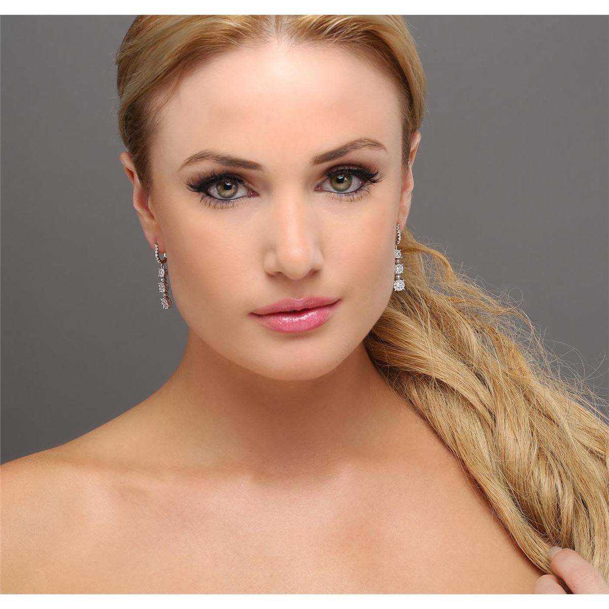 One pair electronically tested 14KT white gold ladies combination cast & assembled diamond dangle earrings with hinged clip backs with a bright polish finish. Condition is new. Containing: Sixty prong set round brilliant cut diamonds, measuring 1.50 - 1.30 x 0.84mm (depth est.) approximate total weight of 60 Stones = 0.60ct. . Clarity: SI-2 to I-1. Color: I - J, Cut is Good. Six prong set round brilliant cut diamonds, measuring 3.00 - 2.20 x 1.56mm (depth est.) approximate total weight of 6 Stones = 0.39ct. . Clarity: SI-1 to SI-2. Color: I - J, Cut is Good. All diamonds are graded in the mounting, unless otherwise stated. Total Weight of Diamonds 0.99ct. Total Weight of Dangle Earrings 5.90 grams. GGL Appraised at $4,340.00.