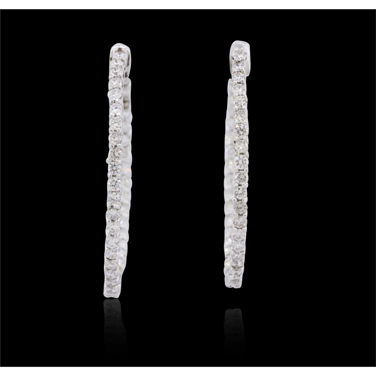 One pair electronically tested 14KT white gold ladies combination cast & assembled hoop earrings with hinged clip backs with a bright polish finish. Condition is new. Containing: Eighty prong set round brilliant cut diamonds, measuring 1.50 - 1.50 x 0.90mm (depth est.) approximate total weight of 80 Stones = 0.99ct. Clarity: SI-2 to I-1. Color: I - J, Cut is Good. All diamonds are graded in the mounting, unless otherwise stated. Total Weight of Diamonds 0.99ct. Total Weight of Earrings 7.00 grams. GGL Appraised at $4,930.00.