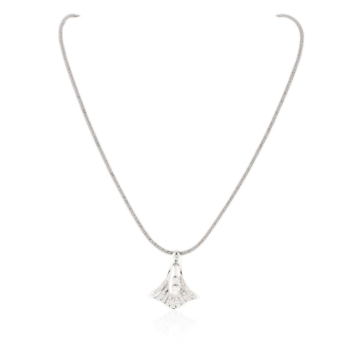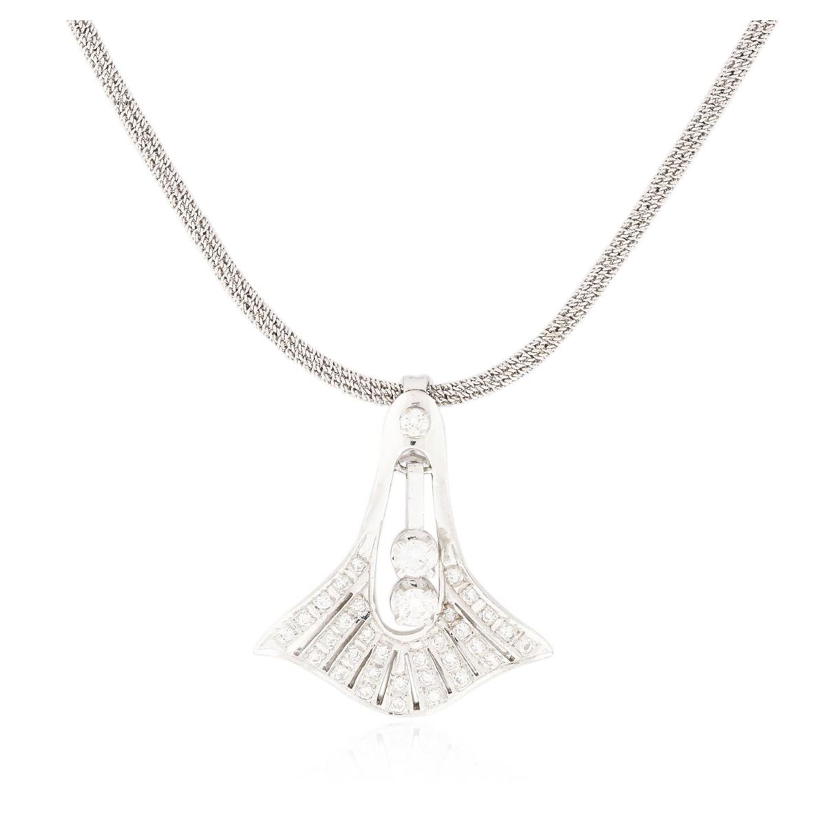 One electronically tested 14KT white gold ladies cast & assembled diamond pendant with chain. Condition is good. The pendant is supported by a twenty inch length 14KT white gold designer style woven chain, terminating in lobster claw clasp. Bright polish finish. Identified with markings of "14K". Containing: Two prong set round brilliant cut diamonds, measuring 3.20 - 3.20 x 1.92mm (depth est.) approximate total weight of 2 Stones = 0.35ct. Graded in the setting. Clarity VVS-1 to VVS-2. Color Thirty-three bead and prong set round brilliant cut diamonds, measuring 1.50 - 1.50 x 0.90mm (depth est.) approximate total weight of 33 Stones = 0.65ct. Graded in the setting. Clarity VVS-1 to VVS-2. Color G - H. Total Weight of Diamonds 1.00ct. Total Weight of Pendant With Chain 16.65gm. AIG Appraised at $7,840.00.
