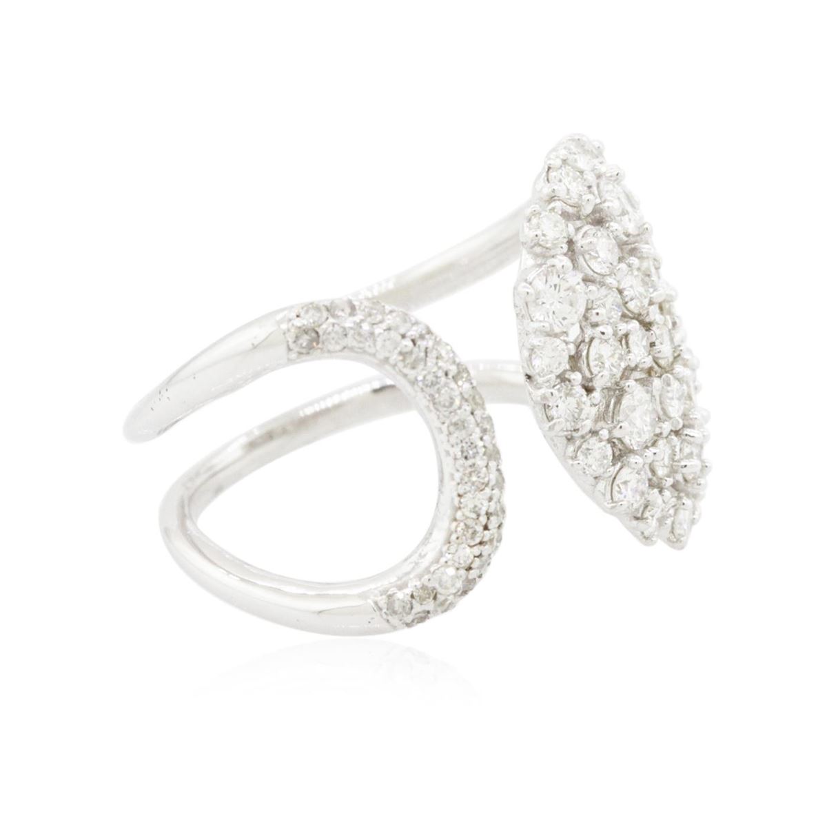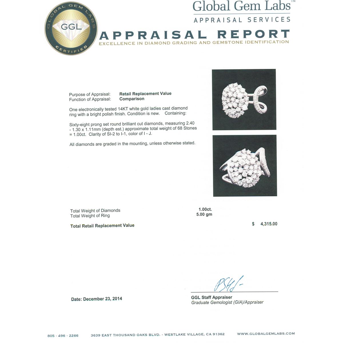One electronically tested 14KT white gold ladies cast diamond ring with a bright polish finish. Condition is new. Containing: Sixty-Eight prong set round brilliant cut diamonds, measuring 2.40 - 1.30 x 1.11mm (depth est.) approximate total weight of 68 Stones = 1.00ct. Clarity: SI-2 to I-1. Color: I - J. All diamonds are graded in the mounting, unless otherwise stated. Total Weight of Diamonds 1.00ct. Total Weight of Ring 5.00 grams. GGL Appraised at $4,315.00.