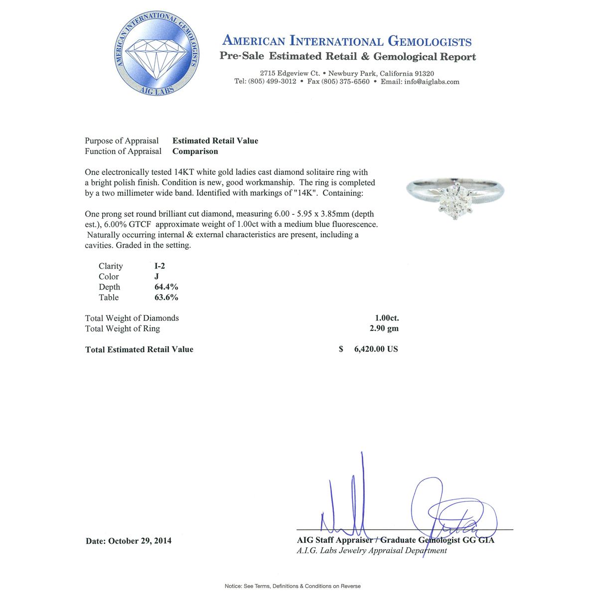One electronically tested 14KT white gold ladies cast diamond solitaire ring with a bright polish finish. The ring is completed by a two millimeter wide band. Identified with markings of "14K". Condition is new, good workmanship. Containing: One prong set round brilliant cut diamond, measuring 6.00 - 5.95 x 3.85mm (depth est.), 6.00.%. GTCF approximate weight of 1.00ct with a medium blue fluorescence. Naturally occurring internal & external characteristics are present, including a cavities. Graded in the setting. Clarity: I-2. Color: 64.4%. Table 63.6%. Total Weight of Diamonds 1.00ct. Total Weight of Ring 2.90 grams. AIG Appraised at $6,420.00.