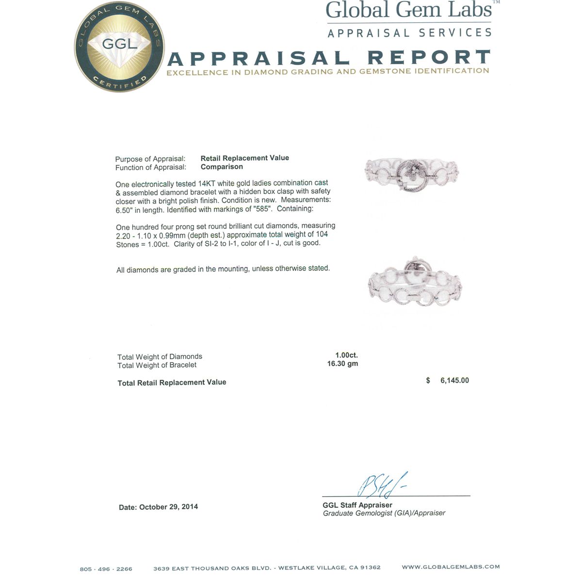 One electronically tested 14KT white gold ladies combination cast & assembled diamond bracelet with a hidden box clasp with safety closer with a bright polish finish. Measurements: 6.50 in length. Identified with markings of 585. Condition is new. Containing: One Hundred Four prong set round brilliant cut diamonds, measuring 2.20 - 1.10 x 0.99mm (depth est.) approximate total weight of 104 Stones = 1.00ct. Clarity: SI-2 to I-1. Color: I - J, Cut is Good. All diamonds are graded in the mounting, unless otherwise stated. Total Weight of Diamonds 1.00ct. Total Weight of Bracelet 16.30 grams. GGL Appraised at $6,145.00.