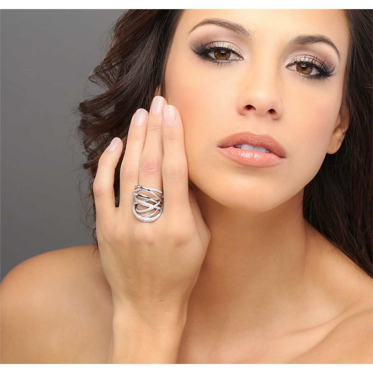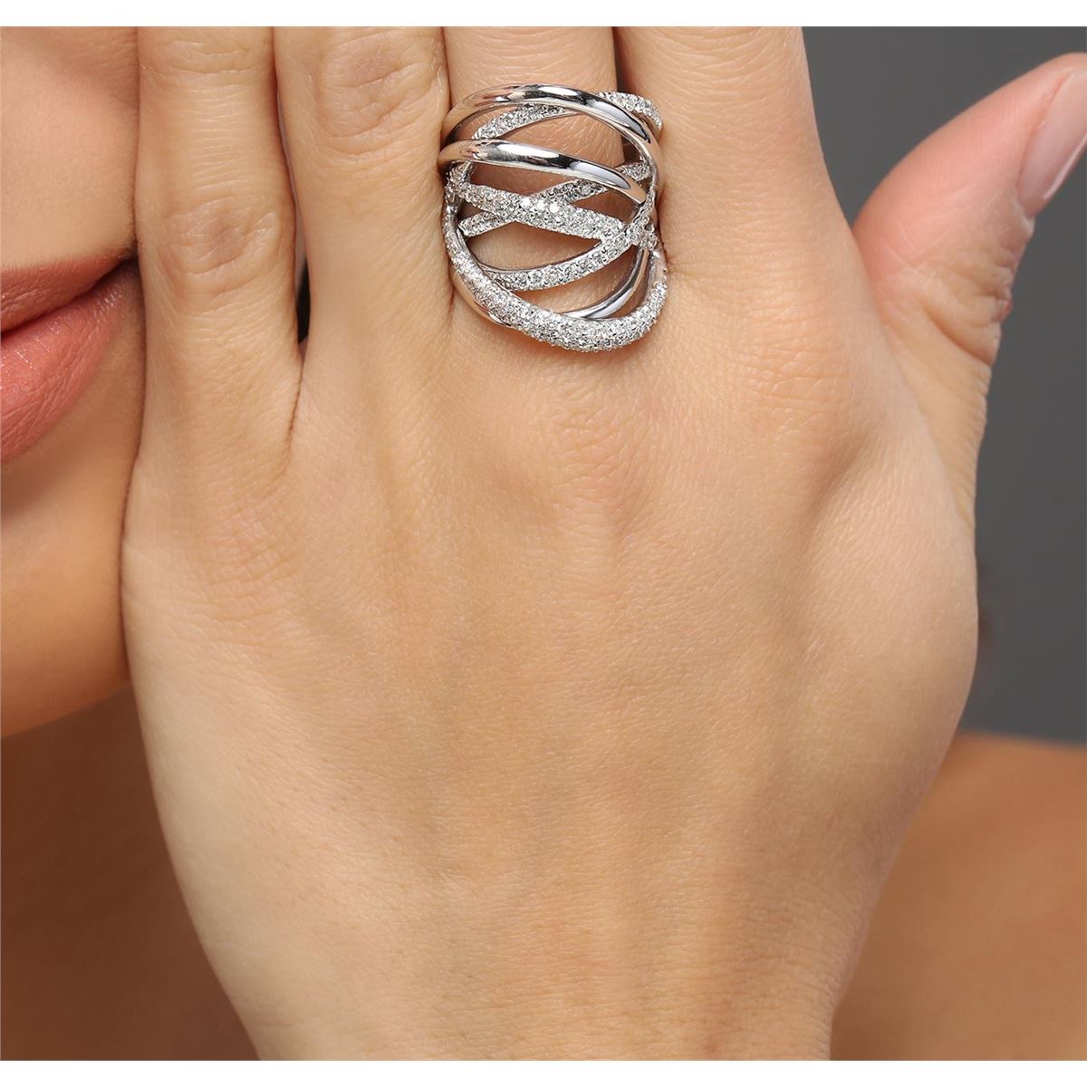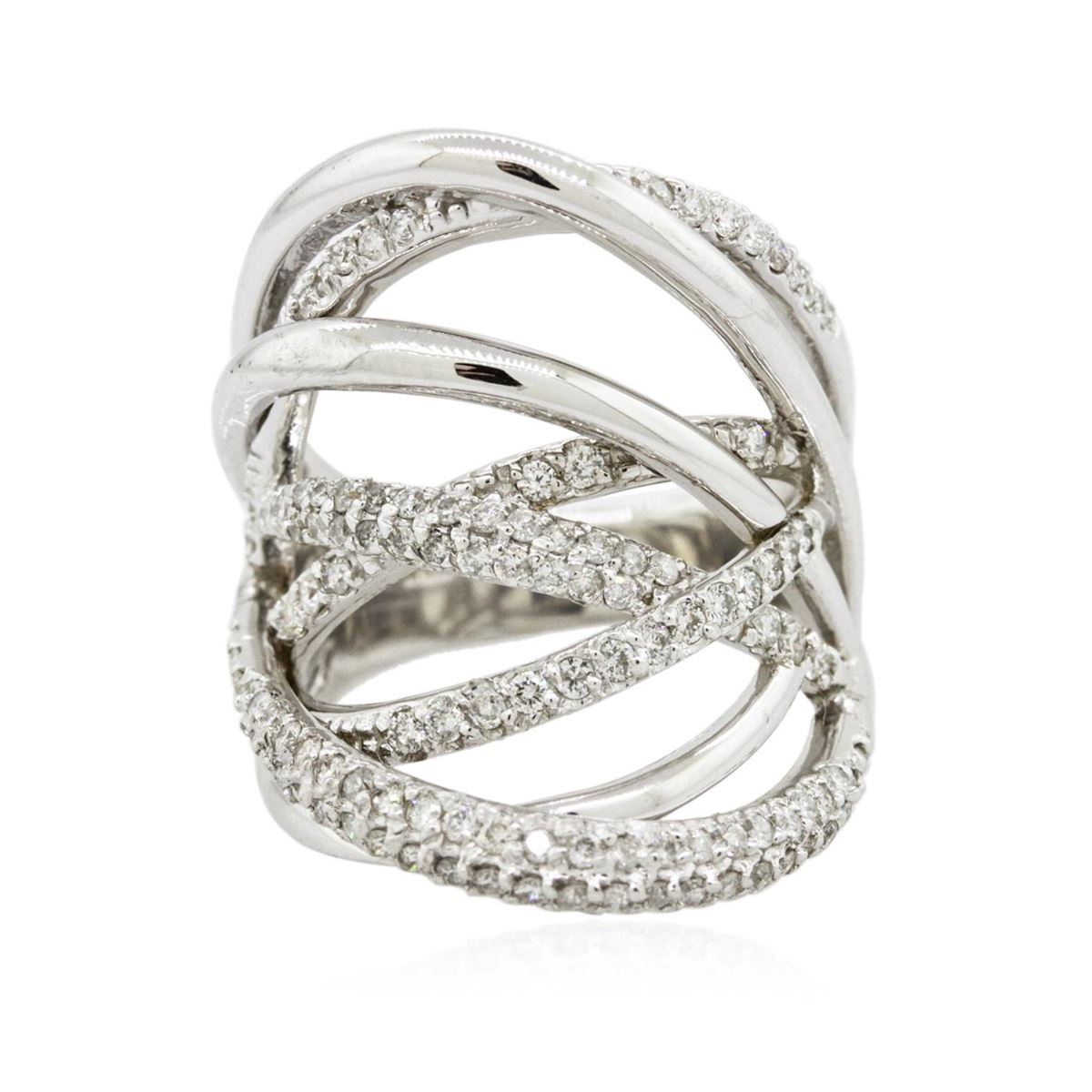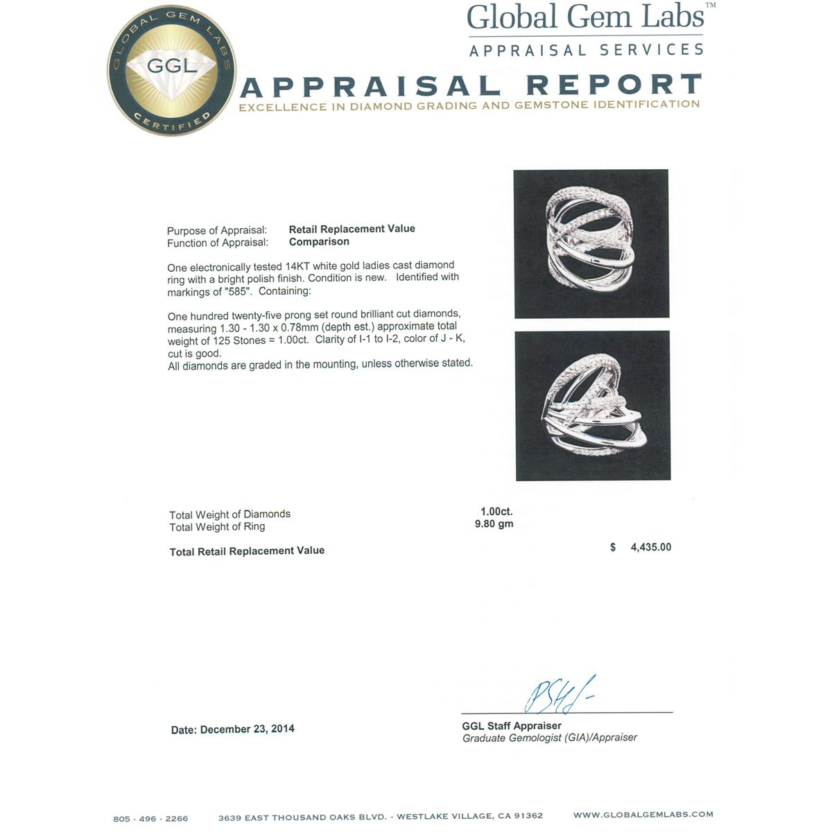 One electronically tested 14KT white gold ladies cast diamond ring with a bright polish finish. Identified with markings of "585". Condition is new. Containing: One Hundred Twenty-Five prong set round brilliant cut diamonds, measuring 1.30 - 1.30 x 0.78mm (depth est.) approximate total weight of 125 Stones = 1.00ct. Clarity: I-1 to I-2. Color: J - K, Cut is Good. All diamonds are graded in the mounting, unless otherwise stated. Total Weight of Diamonds 1.00ct. Total Weight of Ring 9.80 grams. GGL Appraised at $4,435.00.