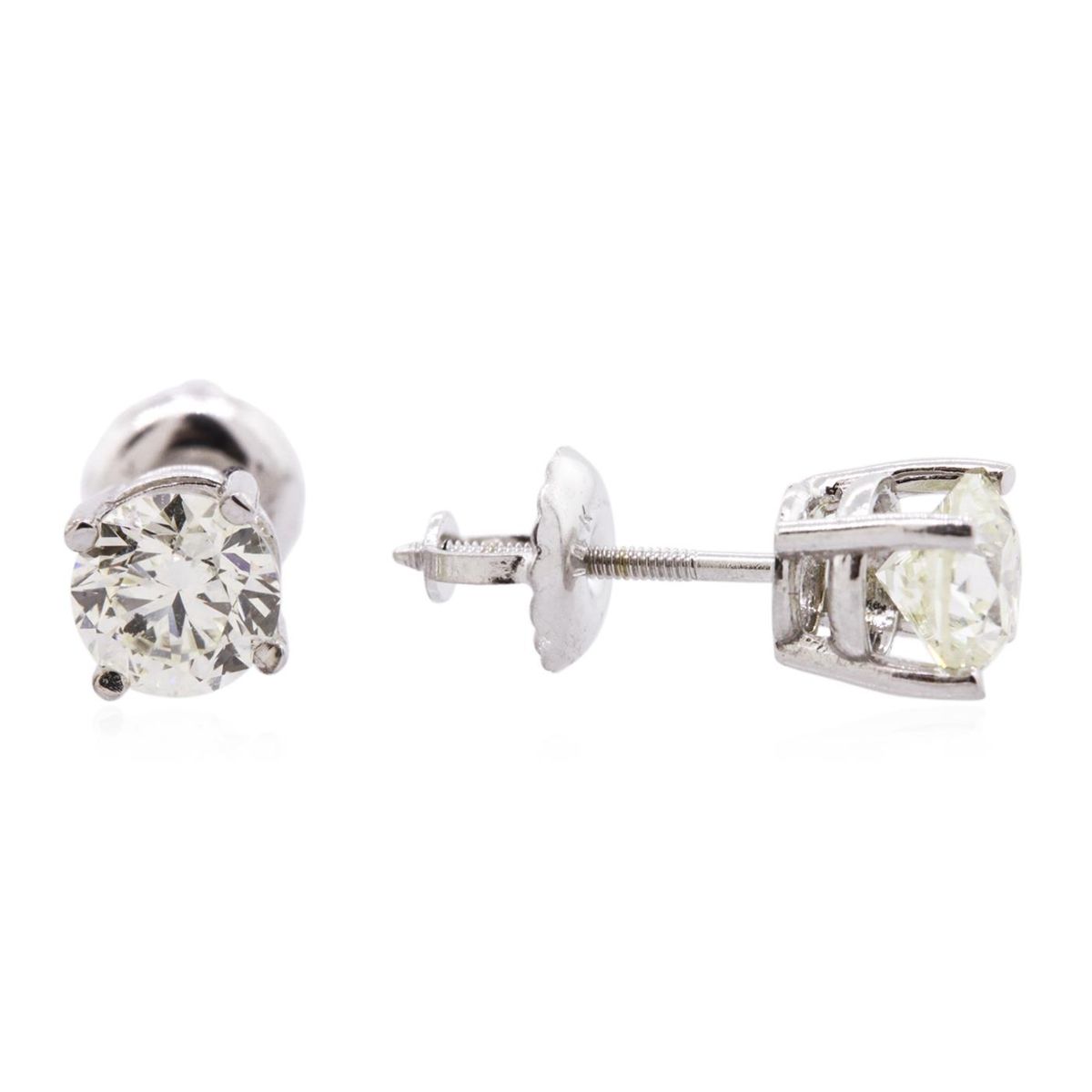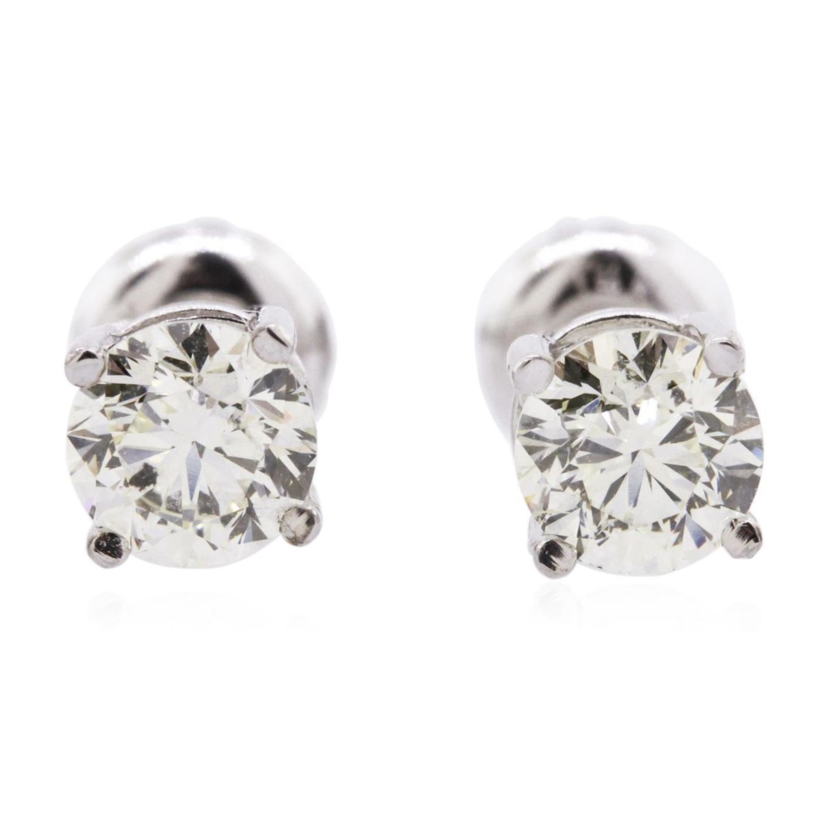 One pair electronically tested 14KT white gold cast & assembled diamond solitaire earrings with screw backs. Identified with markings of "14K". Condition is new, good workmanship. Containing: One prong set round brilliant cut diamond, measuring 4.90 - 4.90 x 3.25mm (depth est.), 3.00% GTCF approximate weight of 0.50ct with a strong blue fluorescence. Graded in the setting. Clarity: SI-2. Color: 66.3%. Table 57.1%. One prong set round brilliant cut diamond, measuring 4.90 - 4.90 x 3.20mm (depth est.), 4.00% GTCF approximate weight of 0.50ct with a medium blue fluorescence. Graded in the setting. Clarity: SI-2. Color: 65.3%. Table 52.0%. Total Weight of Diamonds 1.00ct. Total Weight of Earrings 1.01 grams. AIG Appraised at $3,980.00.