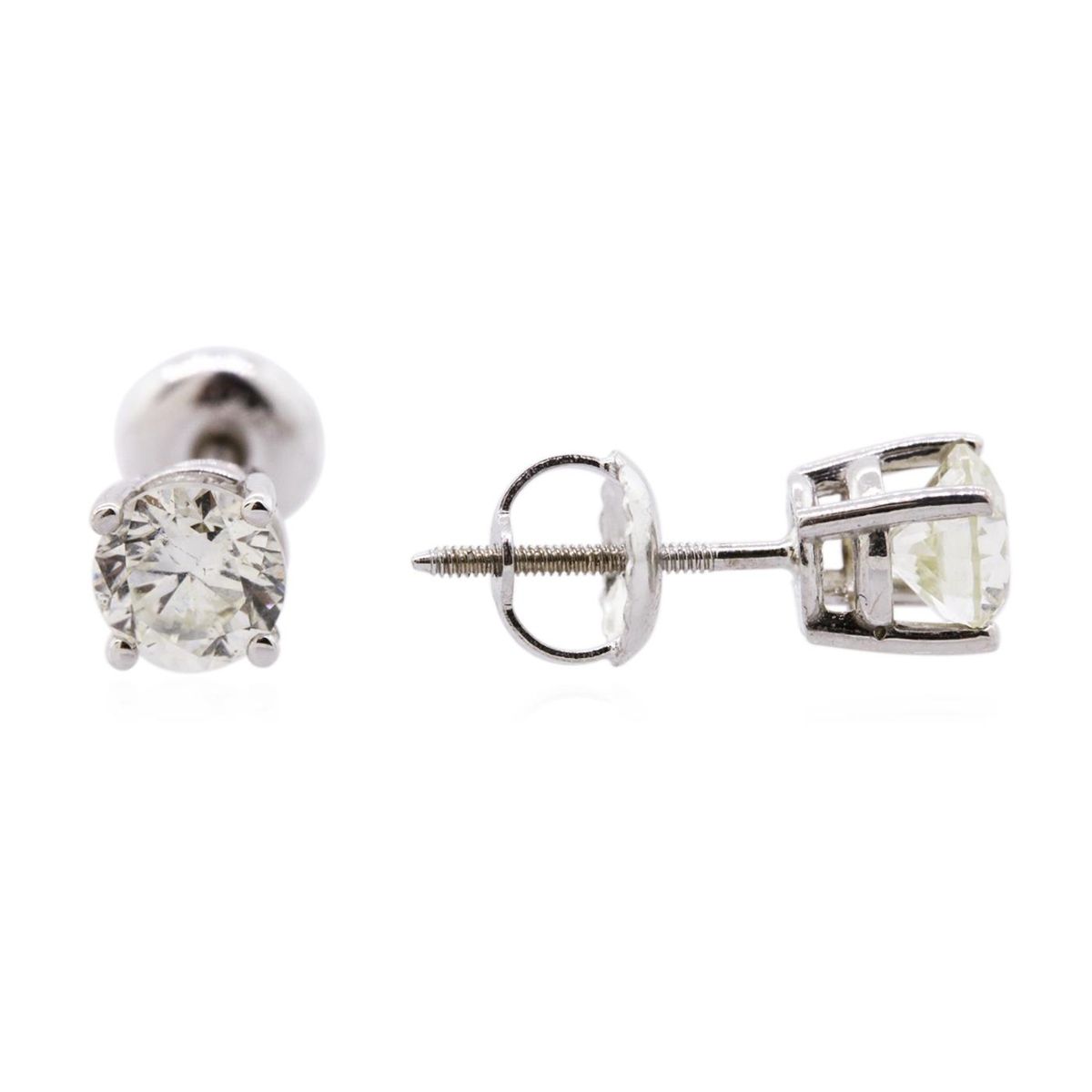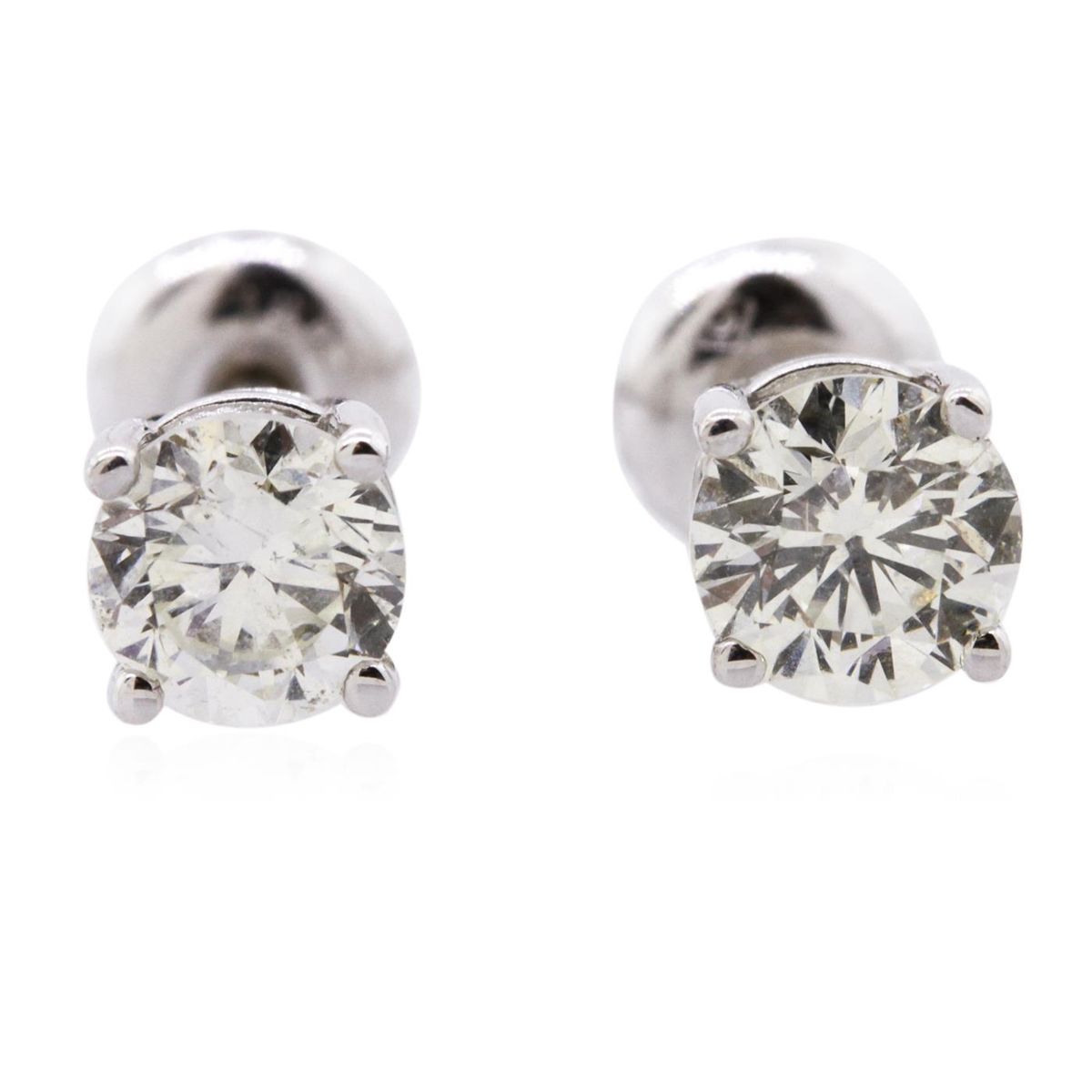 One pair electronically tested 14KT white gold cast & assembled diamond solitaire earrings with screw backs. Condition is new, good workmanship. Containing: One prong set round brilliant cut diamond, measuring 5.03 - 5.01 x 3.31mm (depth est.), 2.00% GTCF approximate weight of 0.52ct with a very strong blue fluorescence. Graded in the setting. Clarity: SI-2. Color:  65.9%. Table 53.4%. One prong set round brilliant cut diamond, measuring 4.83 - 4.80 x 3.01mm (depth est.), 10.00% GTCF approximate weight of 0.48ct with a very strong blue fluorescence. Graded in the setting. Clarity: SI-2. Color: K. Depth 62.5%. Table 61.2%. Total Weight of Diamonds 1.00ct. Total Weight of Earrings 1.00 grams. AIG Appraised at $4,200.00.