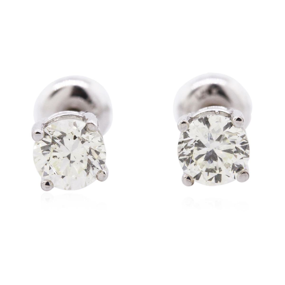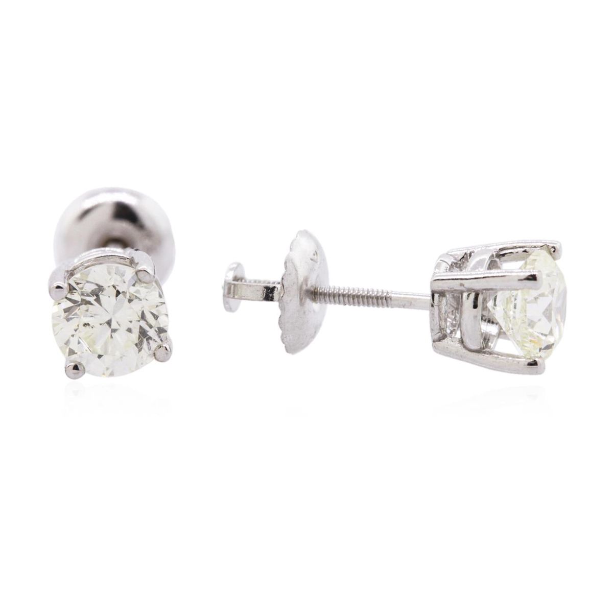 One pair electronically tested 14KT white gold cast & assembled diamond solitaire earrings with screw backs. Condition is new, good workmanship. Containing: One prong set round brilliant cut diamond, measuring 4.90 - 4.90 x 3.22mm (depth est.), 7.00% GTCF approximate weight of 0.51ct. Graded in the setting. Clarity: SI-1. Depth: 65.7%. Table 60.2%. One prong set round brilliant cut diamond, measuring 4.90 - 4.90 x 3.20mm (depth est.), 3.00% GTCF approximate weight of 0.49ct with a medium strong blue fluorescence. Graded in the setting. Clarity: SI-2. Depth: 65.3%. Table 56.1%. Total Weight of Diamonds 1.00ct. Total Weight of Earrings 1.02 grams. AIG Appraised at $3,350.00.