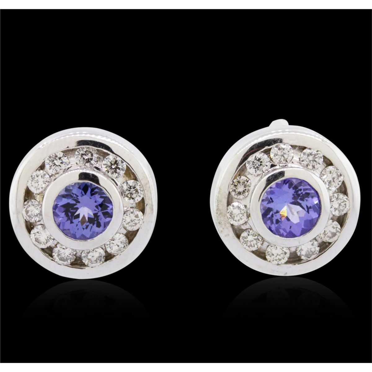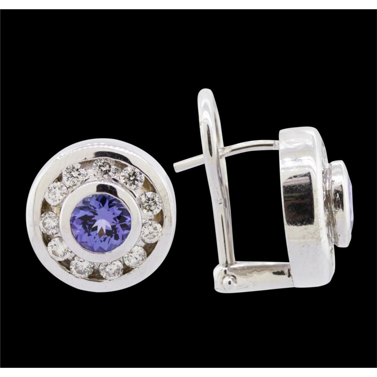 One pair of earrings featuring: 14KT white gold weighing 6.70 grams containing two tanzanites with a total weight of 1.00cts and 22 brilliant cut diamonds with a total weight of 0.62cts.