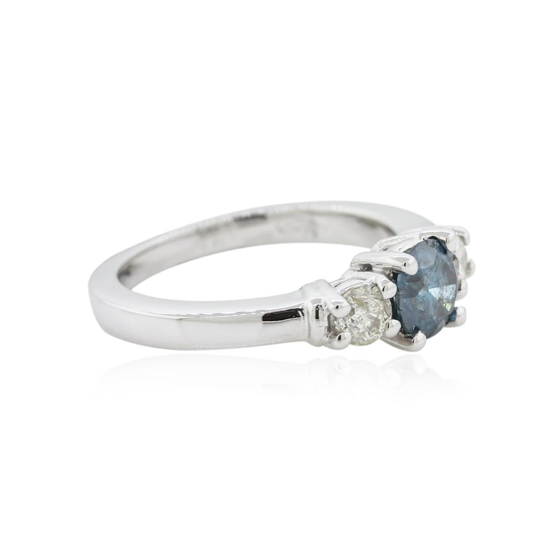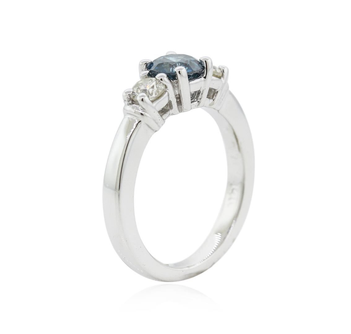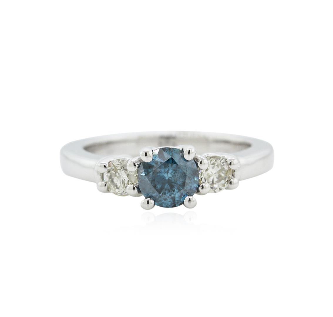 One ring featuring: 14KT white gold weighing 4.00 grams containing one blue diamond center stone with a total weight of 0.64ct and two side diamonds with a total weight of 0.37ct.