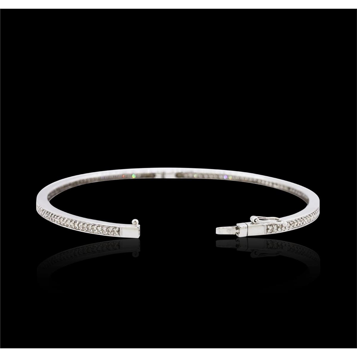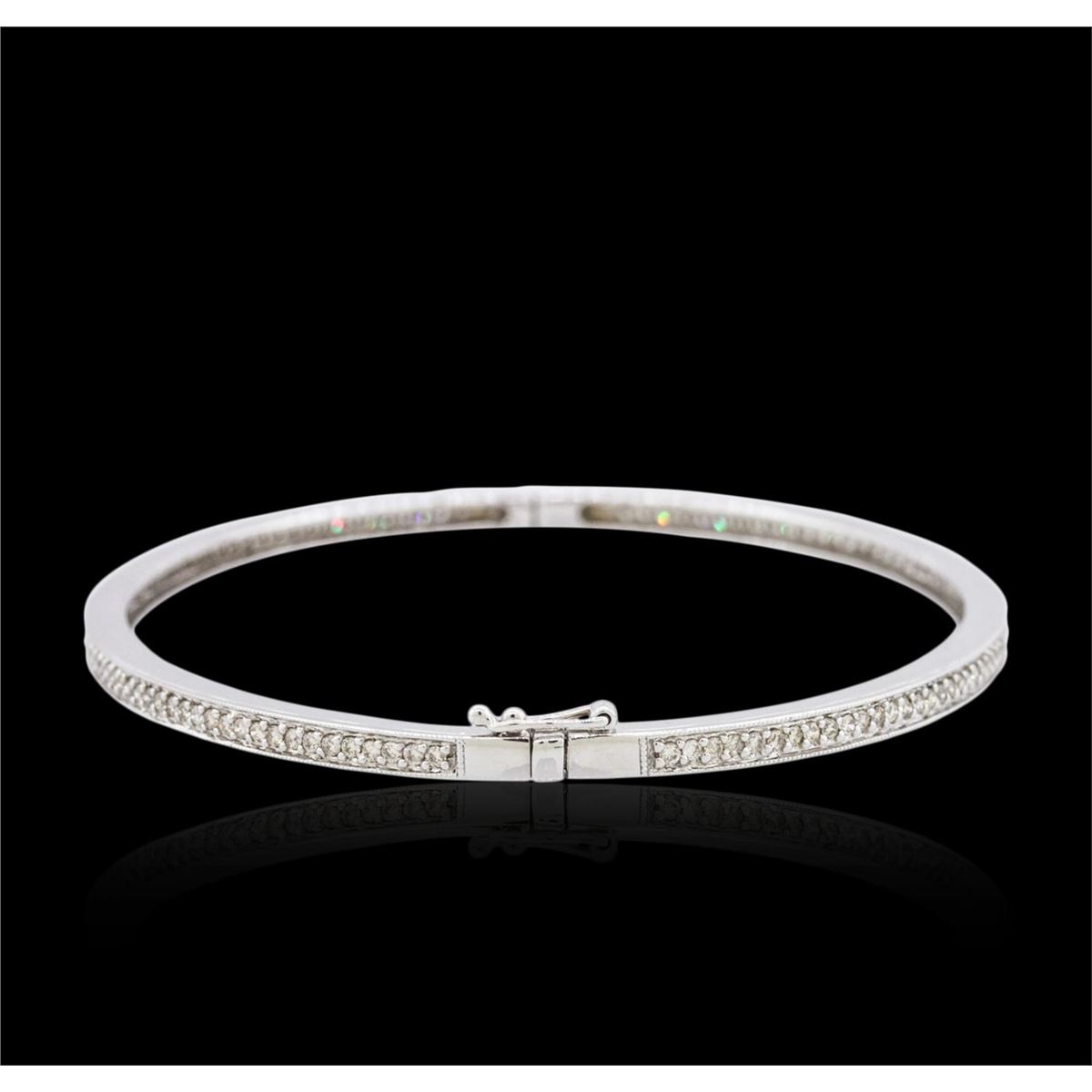 One electronically tested 14KT white gold ladies cast & assembled diamond bangle bracelet. Six and one-half inch wearable length bangle bracelet features mirroring diamond set curvatures supported by a hinged shoulder, completed by a concealed clasp with safety. Bright polish finish with milgrain detailing. Identified with markings of "14K". Condition is new, good workmanship. Containing: One Hundred Twenty-Four bead set round brilliant cut diamonds, measuring 1.30 - 1.30 x 0.78mm (depth est.) approximate total weight of 124 Stones = 1.01ct. Faint brown secondary color throughout. Graded in the setting. Clarity: SI-2 to I-1. Color: J - L. Total Weight of Diamonds 1.01ct. Total Weight of Bangle Bracelet 9.91 grams. AIG Appraised at $4,595.00.