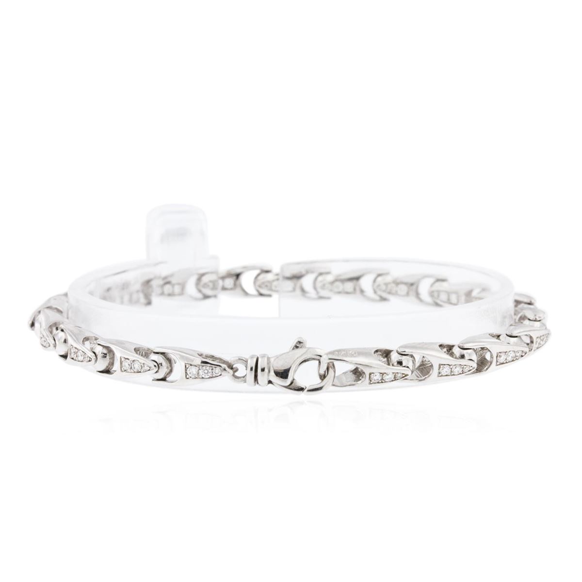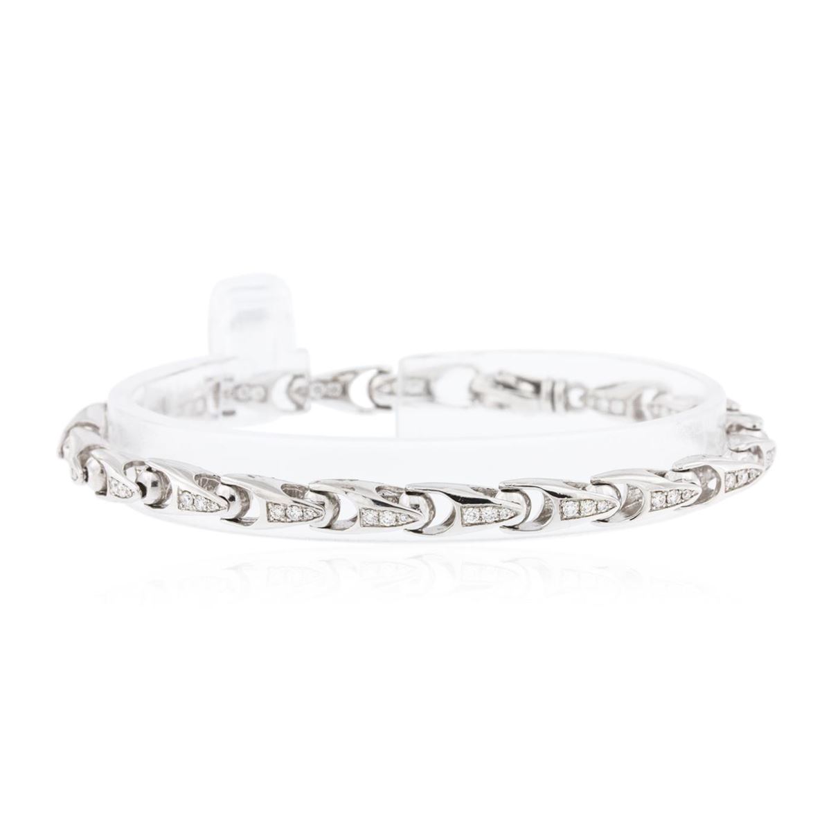 One electronically tested 14KT white gold ladies cast diamond bracelet with a bright polish finish. Condition is new, good workmanship. Seven and one-quarter inch length terminating in a lobster claw clasp. Identified with markings of "14K". Containing: One Hundred Fourteen bead set round brilliant cut diamonds, measuring 1.50 - 1.10 x 0.78mm (depth est.) approximate. Total Weight of 114 Stones = 1.01ct. Graded in the setting. Clarity: VVS-2 to VS-2. Color: G - I. Total Weight of Diamonds 1.01ct. Total Weight of Bracelet 16.00 grams. AIG Appraised at $7,635.00.