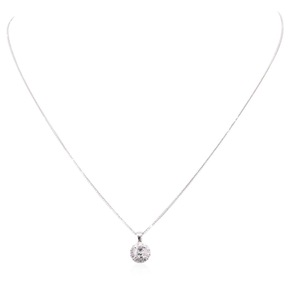 One electronically tested 14KT white gold ladies combination cast & assembled diamond pendant & chain 18.0" long, medium fancy cable with a lobster claw clasp with a bright polish finish. Identified with markings of "14K". Condition is new. Containing: One prong set round brilliant cut diamond, measuring 5.92 - 5.91 x 3.55mm (depth est.) approximate weight of 0.76ct. Clarity: I-2. Color: H, Cut is Good. Twelve prong set round brilliant cut diamonds, measuring 1.80 - 1.80 x 1.08mm (depth est.) approximate total weight of 12 Stones = 0.26ct. Clarity: SI-2 to I-2. Color: H - J, Cut is Good. All diamonds are graded in the mounting, unless otherwise stated. Total Weight of Diamonds 1.01ct. Total Weight of Pendant & Chain 2.70 grams. GGL Appraised at $5,305.00.