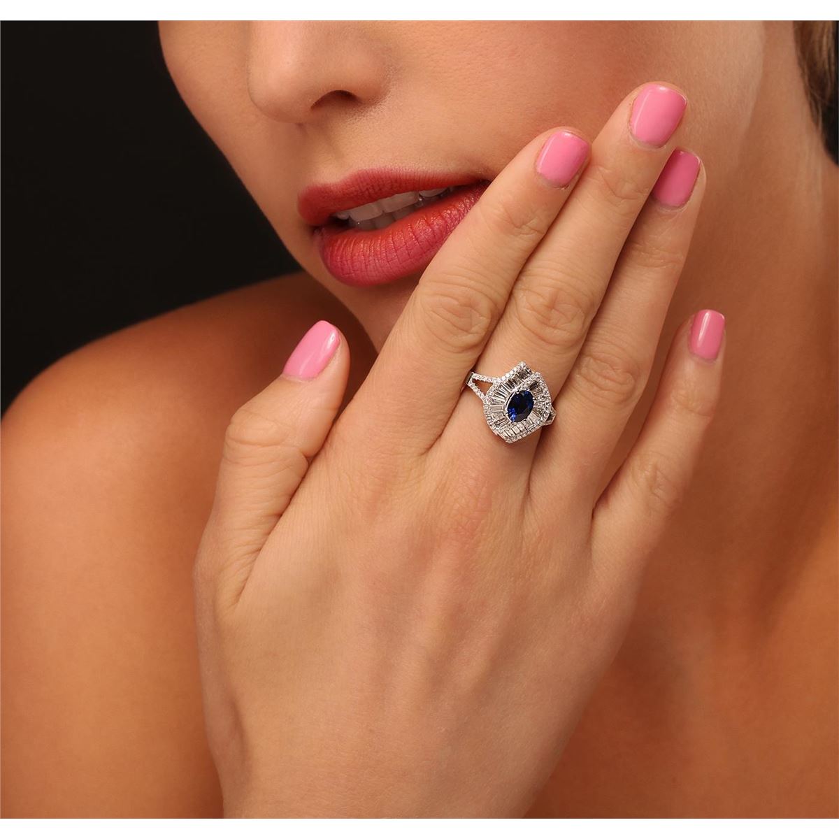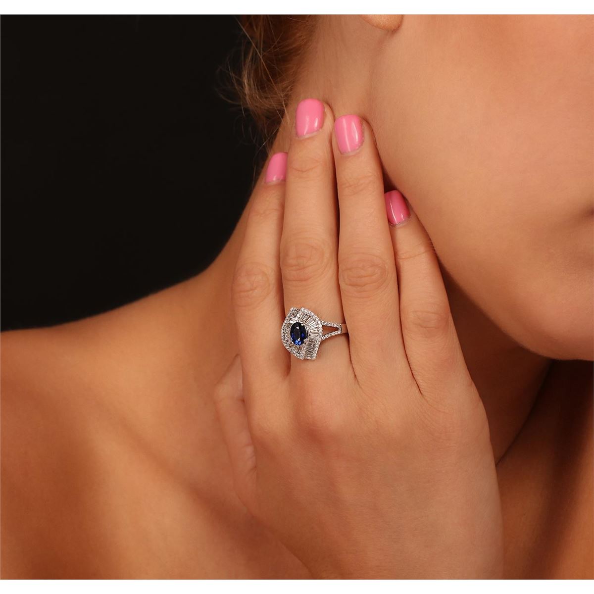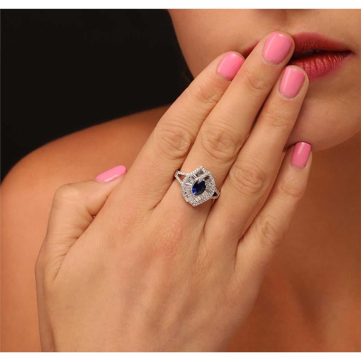 One electronically tested 14KT white gold ladies cast sapphire and diamond ring with a bright polish finish. Condition is new, good workmanship. The featured sapphire is set within a wrap around diamond bezel, supported by diamond set split shoulders and completed by a three millimeter wide band. Identified with markings of "14K". Containing: One prong set oval mixed cut natural blue sapphire, measuring 6.90 x 5.00 x 3.00mm, 6%. bulge factor, approximate weight of 1.01ct., clarity is eye clean, type II, medium dark, moderately strong, violetish blue color, (GIA vB 6/4), cut is good. Transmitting light with no distortion, transparent. Indications of laboratory high temperature diffusion treatment. Graded in the setting. Sixty-Eight prong set round brilliant cut diamonds, measuring 1.10 - 1.00 x 0.63mm (depth est.) approximate. Total Weight of 68 Stones = 0.38ct. Graded in the setting. Clarity: I-1 to I-2. Color: F - H Twenty-One channel set baguette cut diamonds, measuring from 2.40 x 1.20 x 0.84mm (depth est.) to 3.20 x 1.70 x 1.19mm (depth est.) approximate. Total Weight of 21 Stones = 0.79ct. Graded in the setting. Clarity: SI-1 to SI-2. Color: G - I. Total Weight of Colored Stones 1.01ct. Total Weight of Diamonds 1.17ct. Total Weight of Ring 5.80grams. AIG Appraised at $5,125.00.