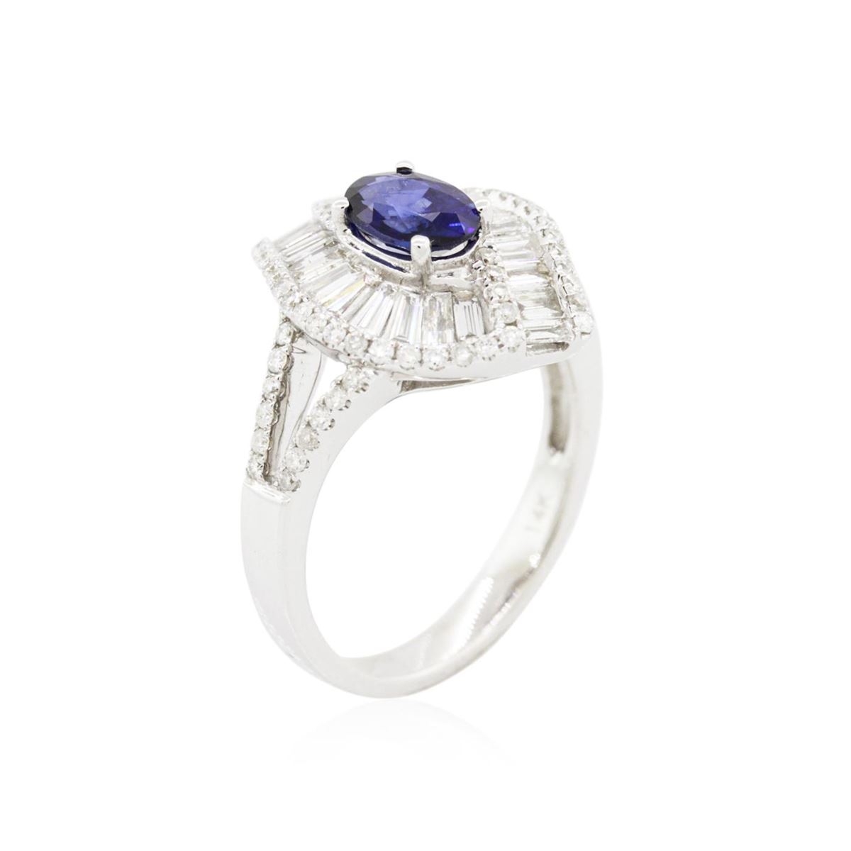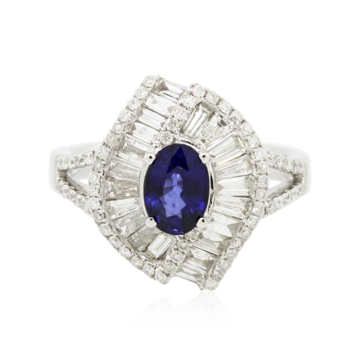 One electronically tested 14KT white gold ladies cast sapphire and diamond ring with a bright polish finish. Condition is new, good workmanship. The featured sapphire is set within a wrap around diamond bezel, supported by diamond set split shoulders and completed by a three millimeter wide band. Identified with markings of "14K". Containing: One prong set oval mixed cut natural blue sapphire, measuring 6.90 x 5.00 x 3.00mm, 6%. bulge factor, approximate weight of 1.01ct., clarity is eye clean, type II, medium dark, moderately strong, violetish blue color, (GIA vB 6/4), cut is good. Transmitting light with no distortion, transparent. Indications of laboratory high temperature diffusion treatment. Graded in the setting. Sixty-Eight prong set round brilliant cut diamonds, measuring 1.10 - 1.00 x 0.63mm (depth est.) approximate. Total Weight of 68 Stones = 0.38ct. Graded in the setting. Clarity: I-1 to I-2. Color: F - H Twenty-One channel set baguette cut diamonds, measuring from 2.40 x 1.20 x 0.84mm (depth est.) to 3.20 x 1.70 x 1.19mm (depth est.) approximate. Total Weight of 21 Stones = 0.79ct. Graded in the setting. Clarity: SI-1 to SI-2. Color: G - I. Total Weight of Colored Stones 1.01ct. Total Weight of Diamonds 1.17ct. Total Weight of Ring 5.80grams. AIG Appraised at $5,125.00.