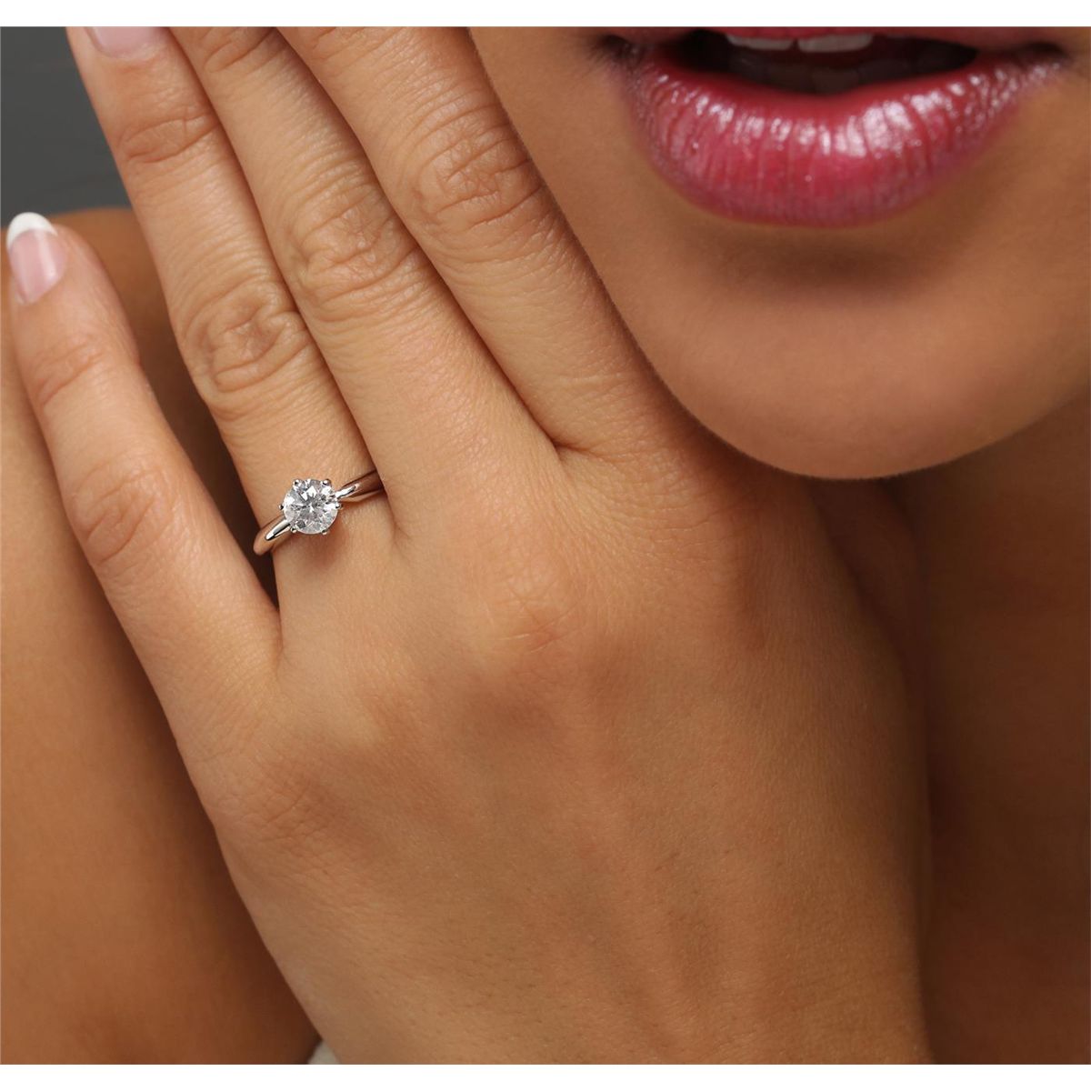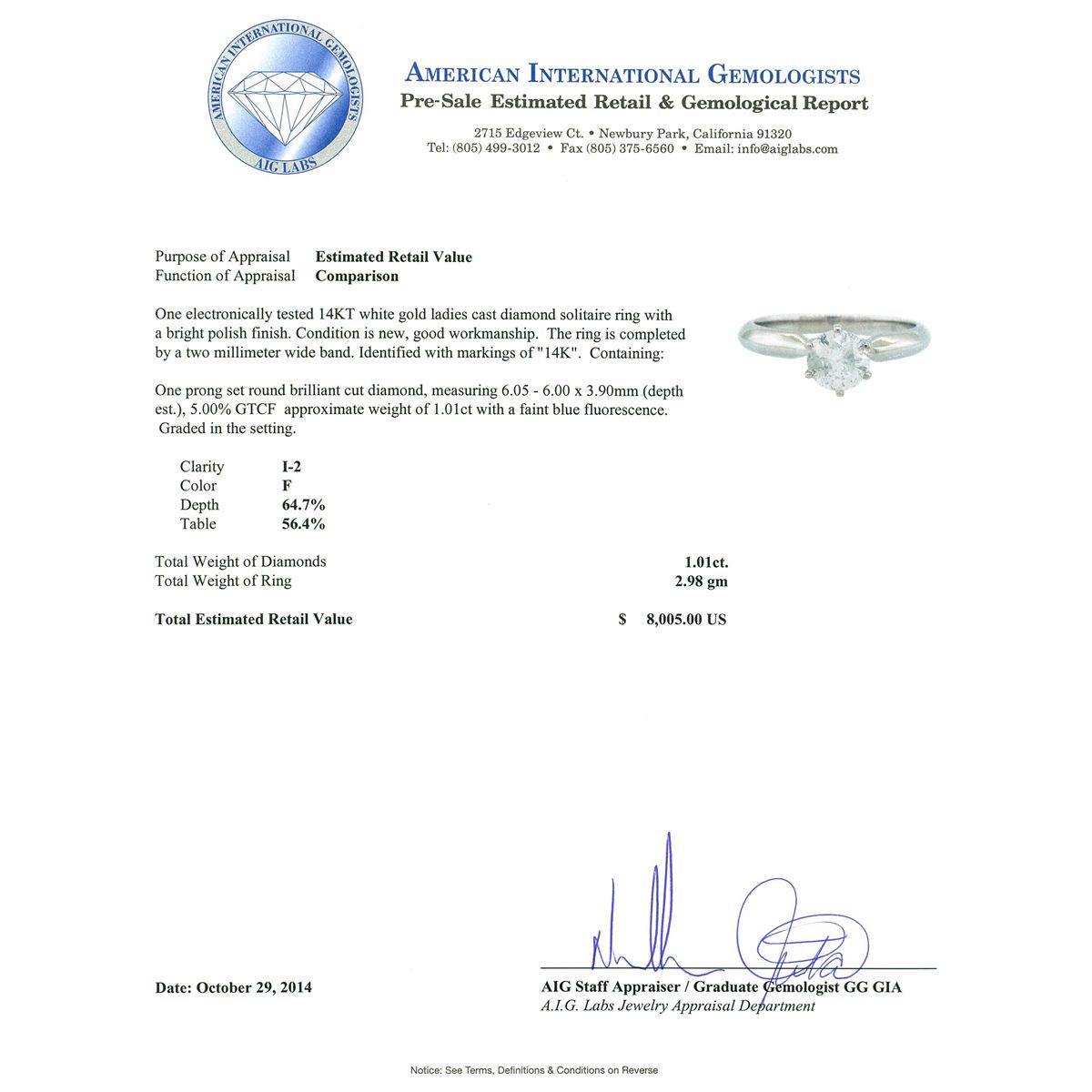 One electronically tested 14KT white gold ladies cast diamond solitaire ring with a bright polish finish. The ring is completed by a two millimeter wide band. Identified with markings of "14K". Condition is new, good workmanship. Containing: One prong set round brilliant cut diamond, measuring 6.05 - 6.00 x 3.90mm (depth est.), 5.00.%. GTCF approximate weight of 1.01ct with a faint blue fluorescence. Graded in the setting. Clarity: I-2. Color: 64.7%. Table 56.4%. Total Weight of Diamonds 1.01ct. Total Weight of Ring 2.98 grams. AIG Appraised at $8,005.00.