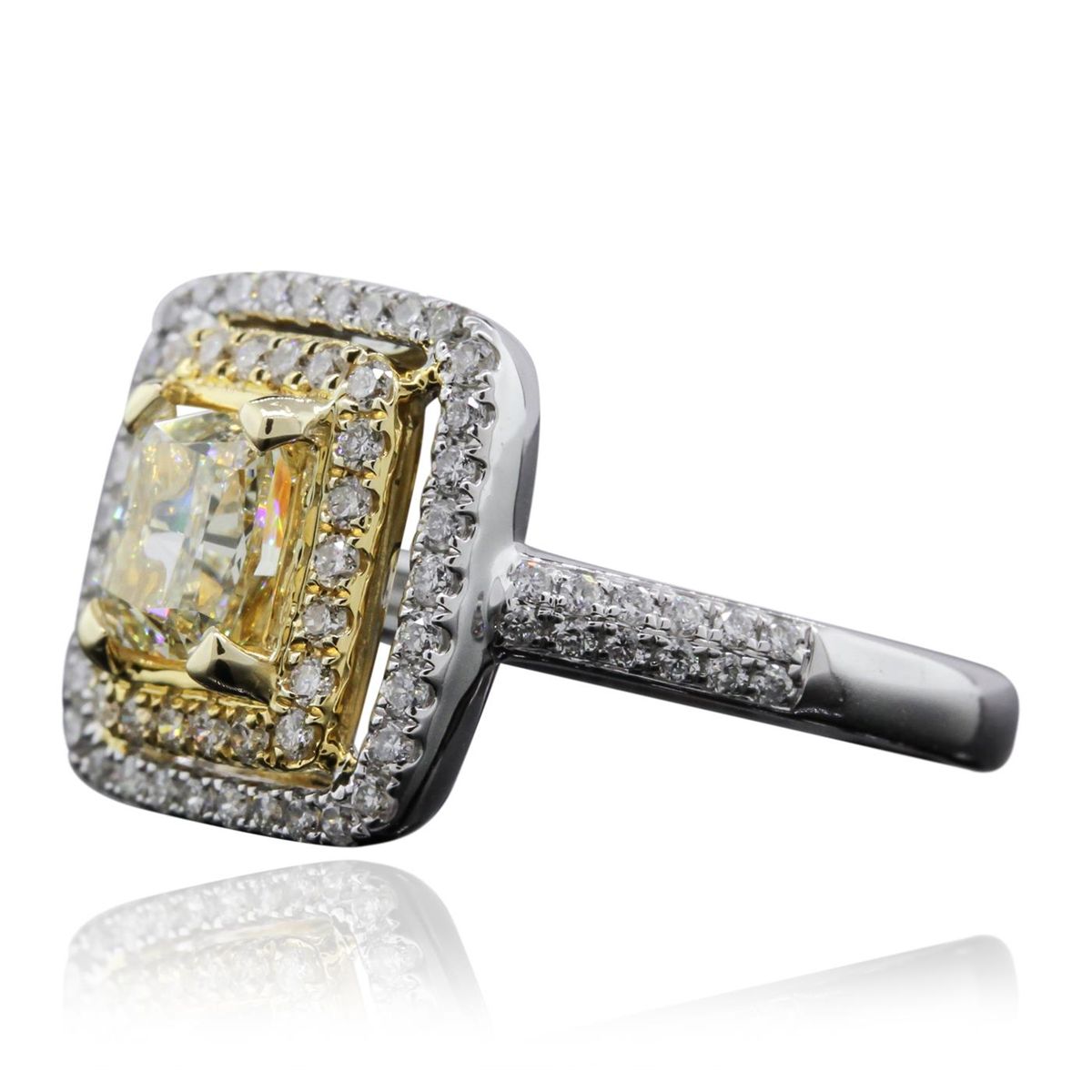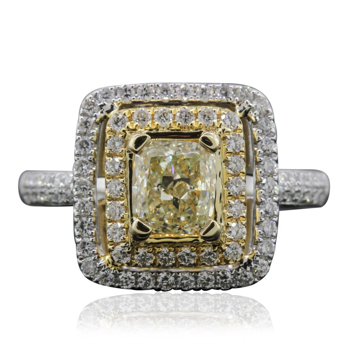 One electronically tested 14KT white gold ladies cast diamond unity ring. Condition is new, good workmanship. The featured diamond is set within two tiered diamond bezels supported by diamond set shoulders, completed by a two millimeter wide band. Bright polish finish with yellow gold accents. Identified with markings of "14K 585". Containing: One prong set cushion cut diamond, measuring 5.76 x 5.15 x 3.25mm (depth est.), 4.00% GTCF approximate weight of 1.01ct. Graded in the setting. Clarity VS-1 Depth 63.1%Table 66.0% Eighty prong set round brilliant cut diamonds, measuring 1.30 - 1.00 x 0.69mm (depth est.) approximate total weight of 80 Stones = 0.54ct. Graded in the setting. Clarity VS-2 to SI-2 Color G - I Total Weight of Diamonds 1.55ct. Total Weight of Ring 4.52 grams. AIG Appraised at $11,725.00.