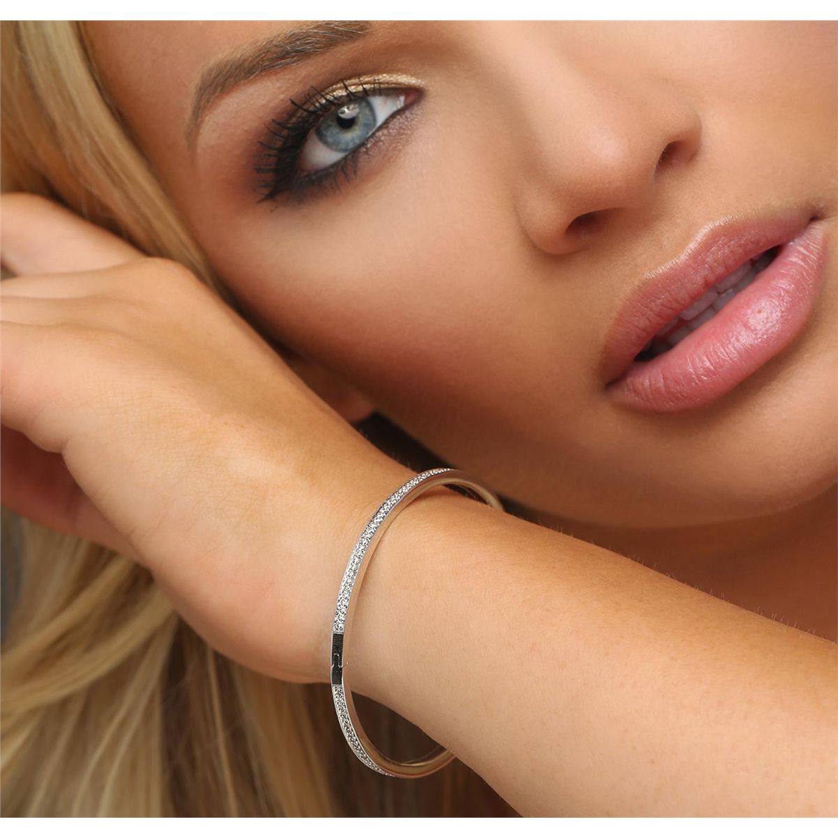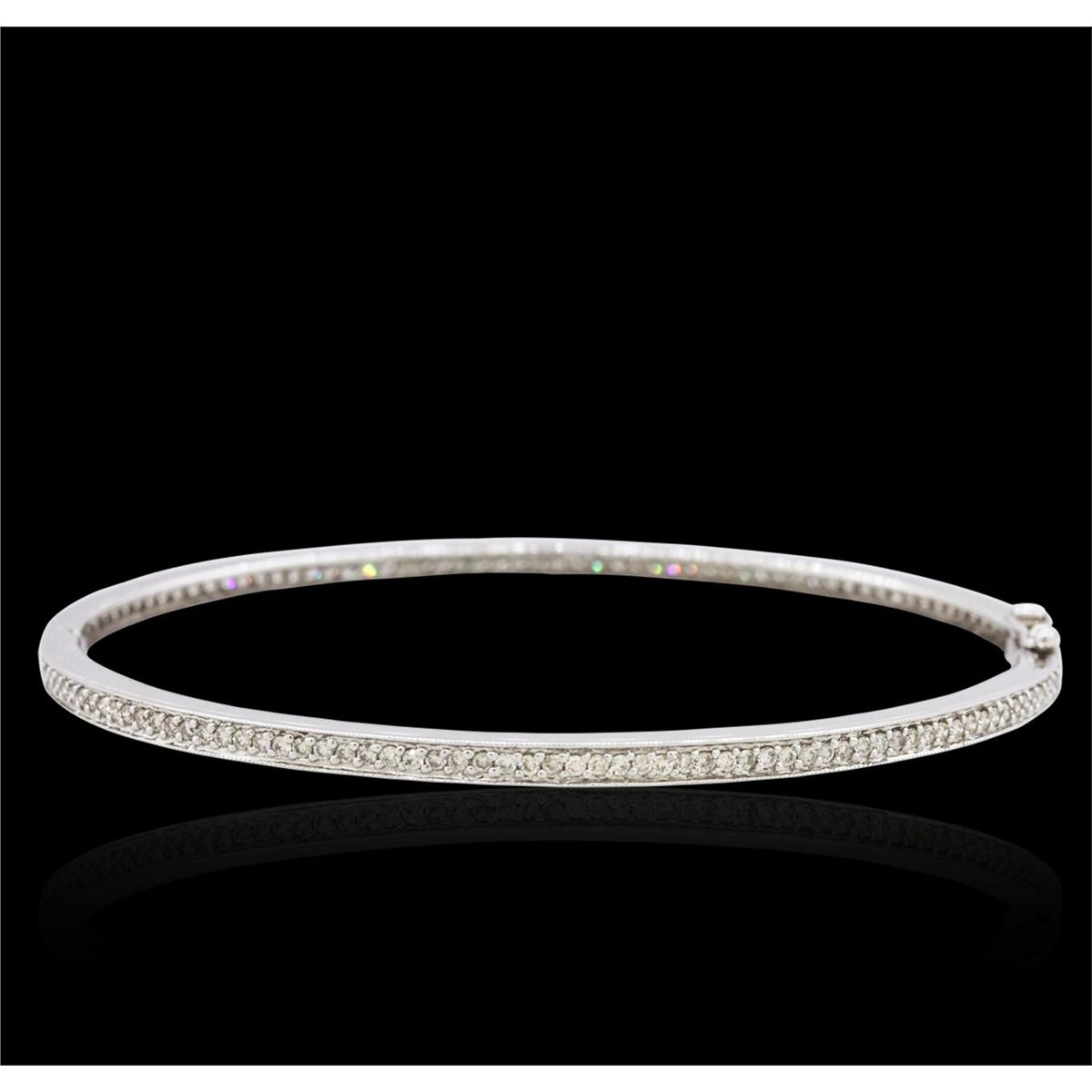 One electronically tested 14KT white gold ladies cast & assembled diamond bangle bracelet. Six and one-half inch wearable length bangle bracelet features mirroring diamond set curvatures supported by a hinged shoulder, completed by a concealed clasp with safety. Bright polish finish with milgrain detailing. Identified with markings of "14K". Condition is new, good workmanship. Containing: One Hundred Twenty-Four bead set round brilliant cut diamonds, measuring 1.30 - 1.30 x 0.78mm (depth est.) approximate total weight of 124 Stones = 1.01ct. Faint brown secondary color throughout. Graded in the setting. Clarity: SI-2 to I-1. Color: J - L. Total Weight of Diamonds 1.01ct. Total Weight of Bangle Bracelet 9.91 grams. AIG Appraised at $4,595.00.