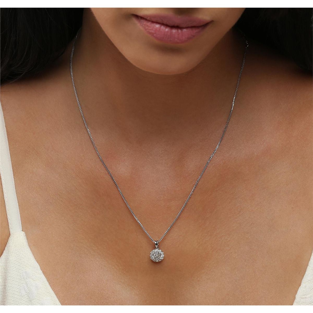 One electronically tested 14KT white gold ladies combination cast & assembled diamond pendant & chain 18.0" long, medium fancy cable with a lobster claw clasp with a bright polish finish. Identified with markings of "14K". Condition is new. Containing: One prong set round brilliant cut diamond, measuring 5.92 - 5.91 x 3.55mm (depth est.) approximate weight of 0.76ct. Clarity: I-2. Color: H, Cut is Good. Twelve prong set round brilliant cut diamonds, measuring 1.80 - 1.80 x 1.08mm (depth est.) approximate total weight of 12 Stones = 0.26ct. Clarity: SI-2 to I-2. Color: H - J, Cut is Good. All diamonds are graded in the mounting, unless otherwise stated. Total Weight of Diamonds 1.01ct. Total Weight of Pendant & Chain 2.70 grams. GGL Appraised at $5,305.00. GGL Appraised at $7,435.00.